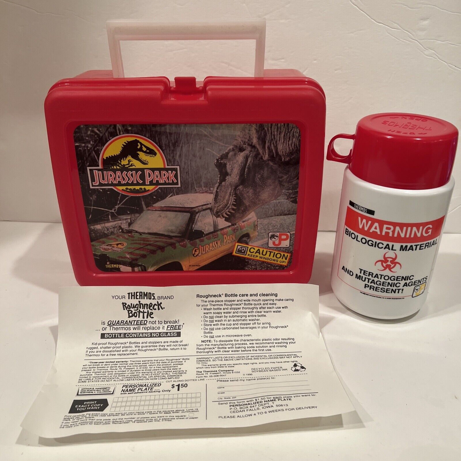 In celebration of the upcoming 1993 film, Jurassic Park appeared on a red plastic lunch box that was manufactured in 1992. The box featured a still of the T-Rex attack from the film. The shot chosen simply displayed the T-Rex peering in at one of the Jurassic Park tour vehicles.