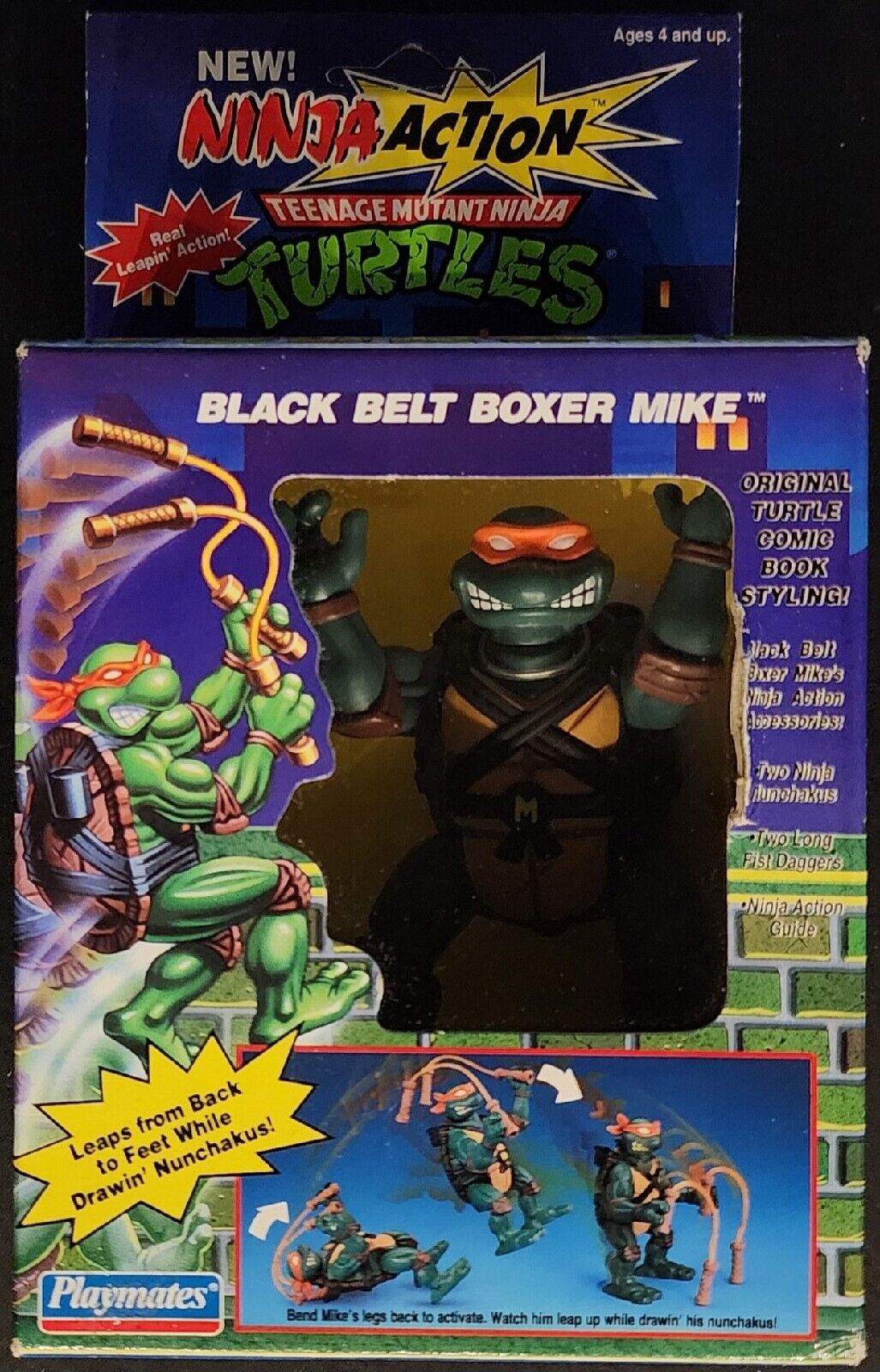 In 1993, Playmates decided to match the demand for toys with action gimmicks with the Ninja Action subline. These toys featured various springs and triggers that allowed the toys to perform exciting flips and other action moves. In the case of Michaelangelo, the orange-wearing nunchuck-wielding turtle, they gave him a flip that activated after his torso was pushed back. To help keep the toy upright, Playmates used a small bit of lead that they hid in the feet.