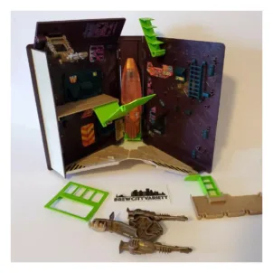 Now, on our short-lived Computer Warriors blog, we will mention the Invasion of the Viruses book that turns into an evil rocket base. The viruses utilize this rocket base to come up with master plans to defeat the heroic computer warriors. This playset, when closed, takes the appearance of a book titled Invasion of the Viruses. On the front of the playset, we see the cover of the book which shows the title as well as a picture of a few favorite computer warriors along with an evil virus flying on PC boards out of a computer screen. The spine of the book then shows the publisher’s name and title of the book again, giving the appearance of a real book. Also causing the book appearance, white stickers are part of the design on the sides to give the appearance of pages.