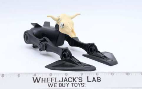Tex Hex’s skull-like vehicle, Skull Walker, swoops down from the air with Tex Hex to attack and then transforms into a walking land vehicle. The vehicle appears entirely black with a tan animal skull-like face. These colors and silver detailing around the horns and eyes add to the evil, sneaky aspect of this vehicle. Skull Walker includes many points of articulation from top to bottom for ultimate transformation, posing, and walking abilities. The vehicle also comes with a nugget of kerium and a removeable bronze shiny saddle. Because of these features and abilities, Tex Hex’s Skull Walker vehicle takes 5th place on our Top 10 BraveStarr Toys list.