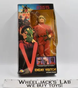 In 1984, LJN released this 12 inch Enemy Visitor figure. This toy stands tall with the iconic red Visitor clothing. The toy features a human-like appearance with a removeable face, revealing the true identity of this Visitor. LJN released this toy and also planned on releasing a line of 4 1/2 inch figures with accessories and two vehicles. However, these smaller scale figures and vehicles unfortunately never released with the twelve inch Enemy Visitor figure. Since the television series canceled due to it not hitting initial popularity as expected, the action figures also canceled and the Enemy Visitor remains the only V toy released.
