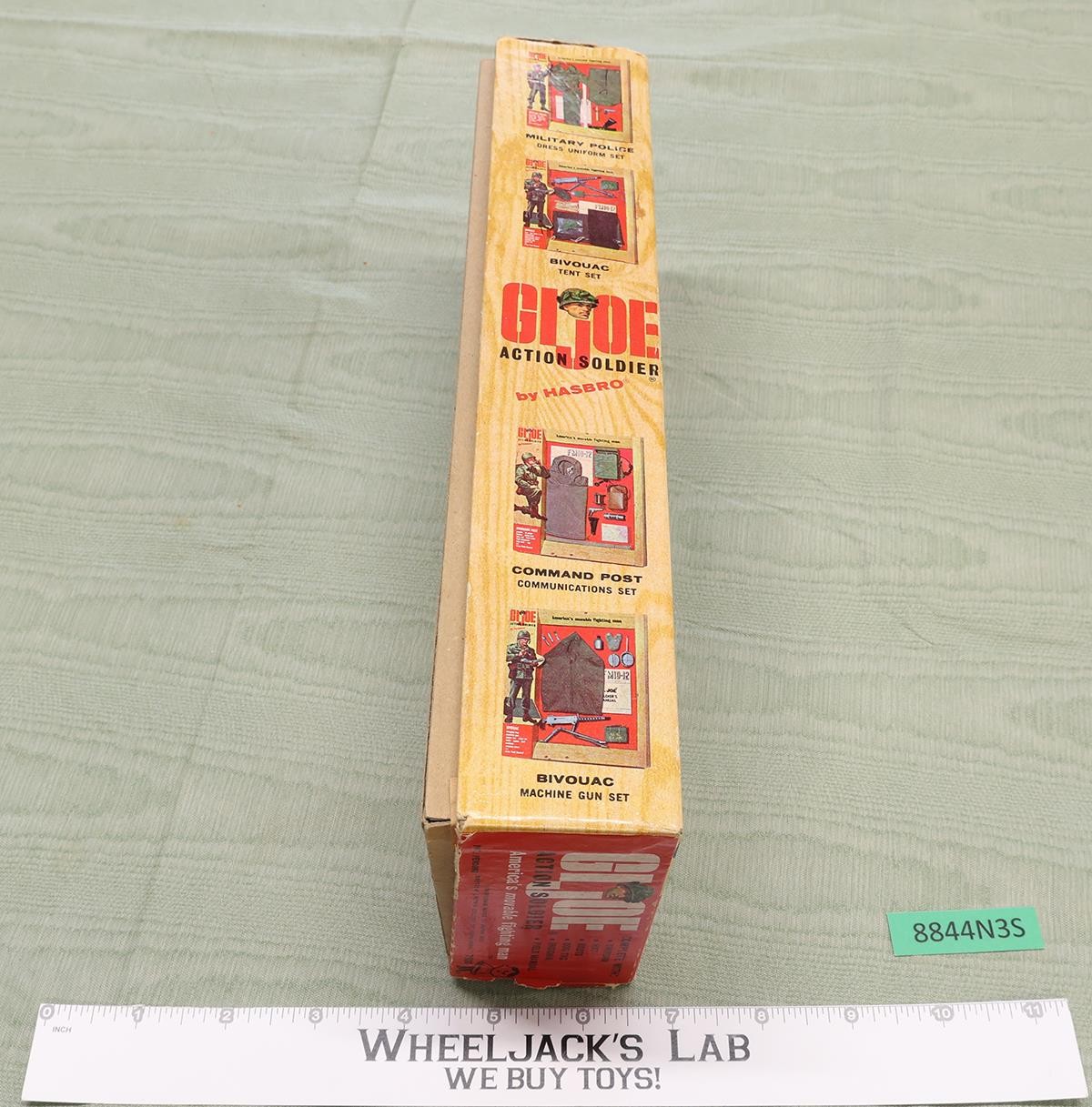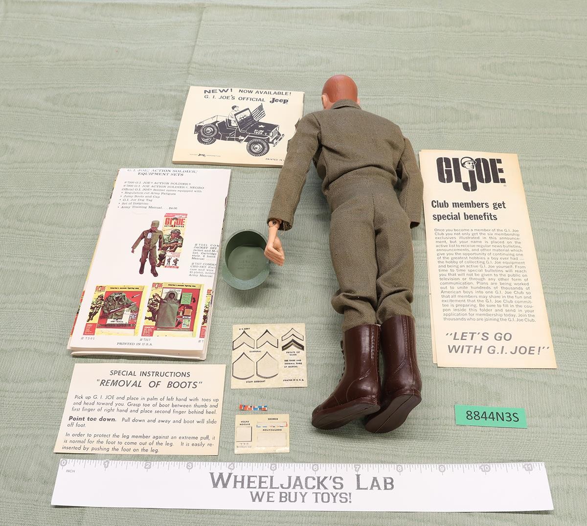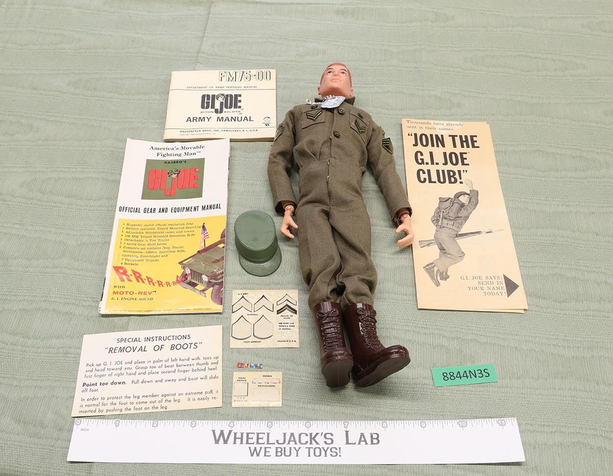 Accessory Condition: The uniform is in almost new condition, with all snaps intact. The insignia sticker sheet is included, with all the insignia accounted for, whether on the outfit or on the sheet. Most of the stickers are coming off the outfit. Also comes with boots, a hat, dog tags, and a manual. Included also are three other pieces of paperwork. Comes as shown.