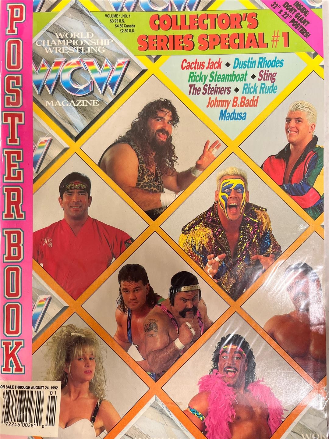 WCW Collector's Series Special #1: Includes 4 double-sided posters (32" x 22") featuring Cactus Jack, Dustin Rhodes, Ricky Steamboat, Sting, The Steiners, Rick Rude, Johnny B. Badd, and Madusa. Fine creases along spine; bottom inch of magazine has curled. Back cover has a crease on upper left corner. In plastic sleeve. Comes as shown.