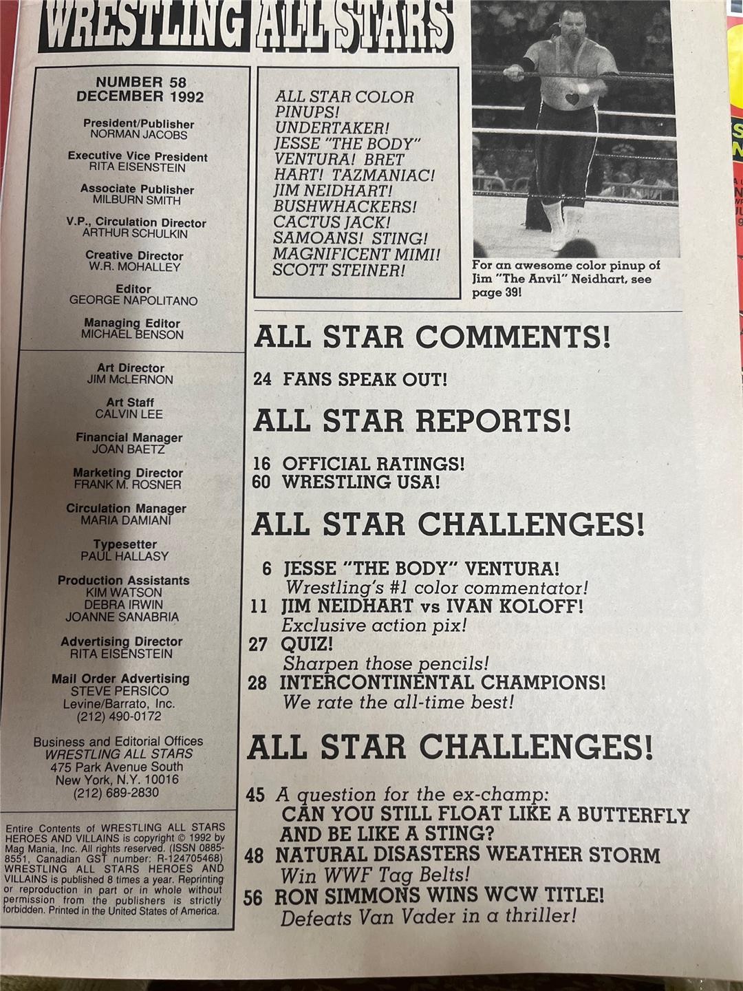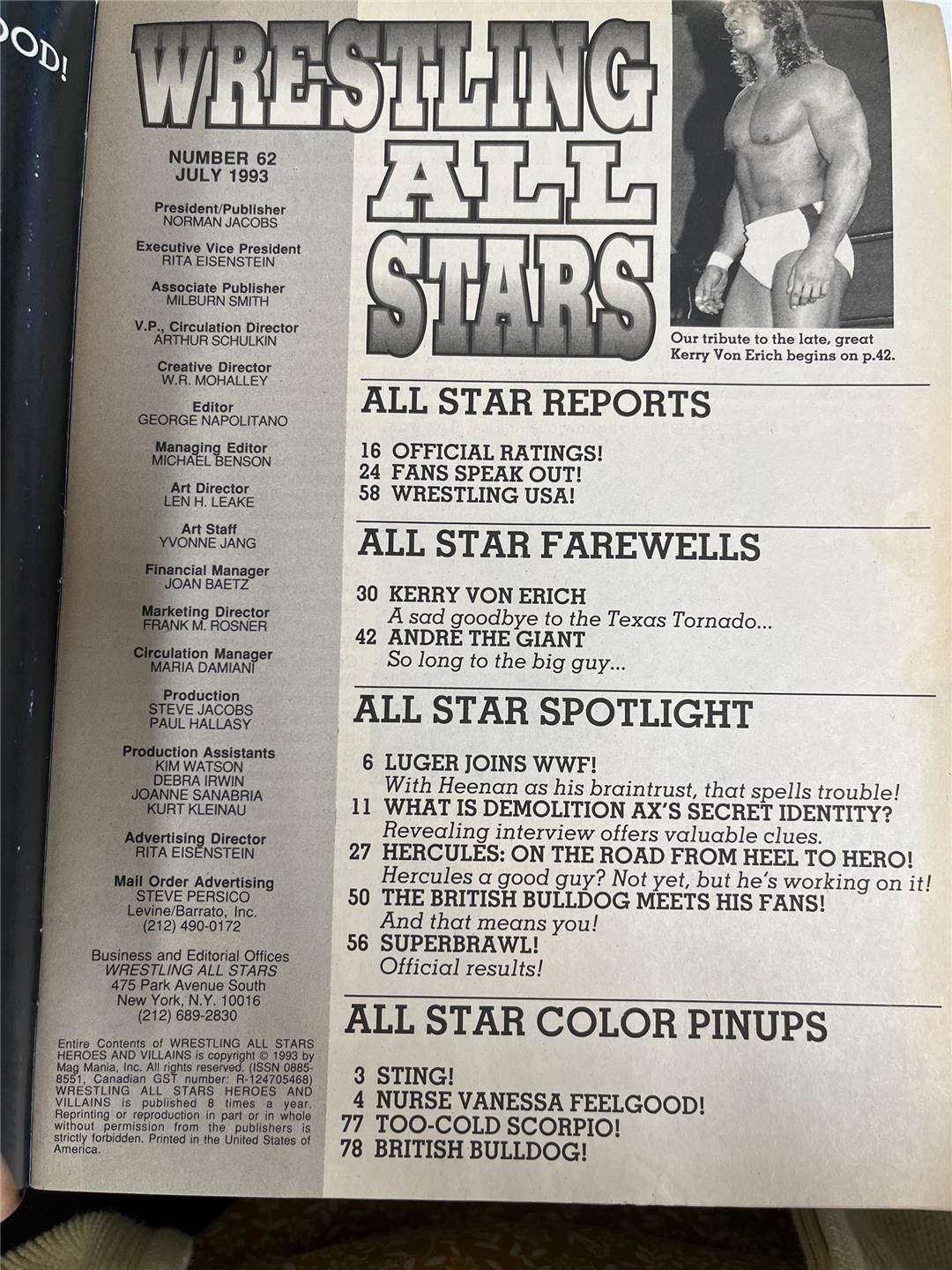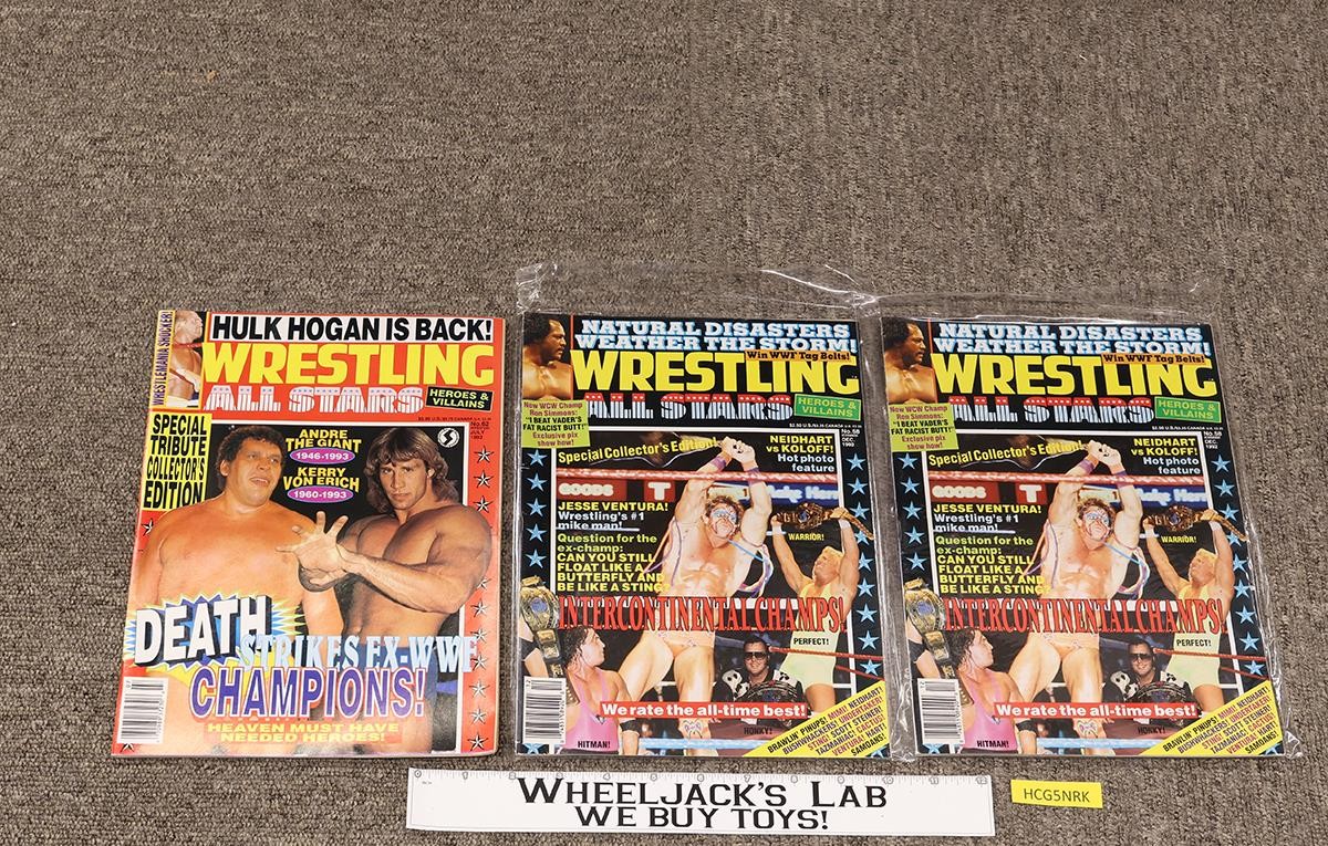 Condition: Three issues of Wrestling All Stars: Heroes & Villains. Two copies of No. 58 (December 1992) in plastic sleeves. Includes 11 pinups (Sting, Ventura, Hart, Neidhart, Tazmaniac, Bushwackers, Cactus Jack, Wild Samoans, Mimi, Scott Steiner, Undertaker). One copy of No. 62 (July 1993) Special Tribute Collector's Edition. Includes 4 pinups (Nurse Vanessa Feelgood, British Bulldog, and Sting). Too-Cold Scorpio. Includes tribute to Andre the Giant and Kerry Von Erich who both passed in 1993. Magazines are in good to very good condition. No tears or missing pages. Comes as shown.