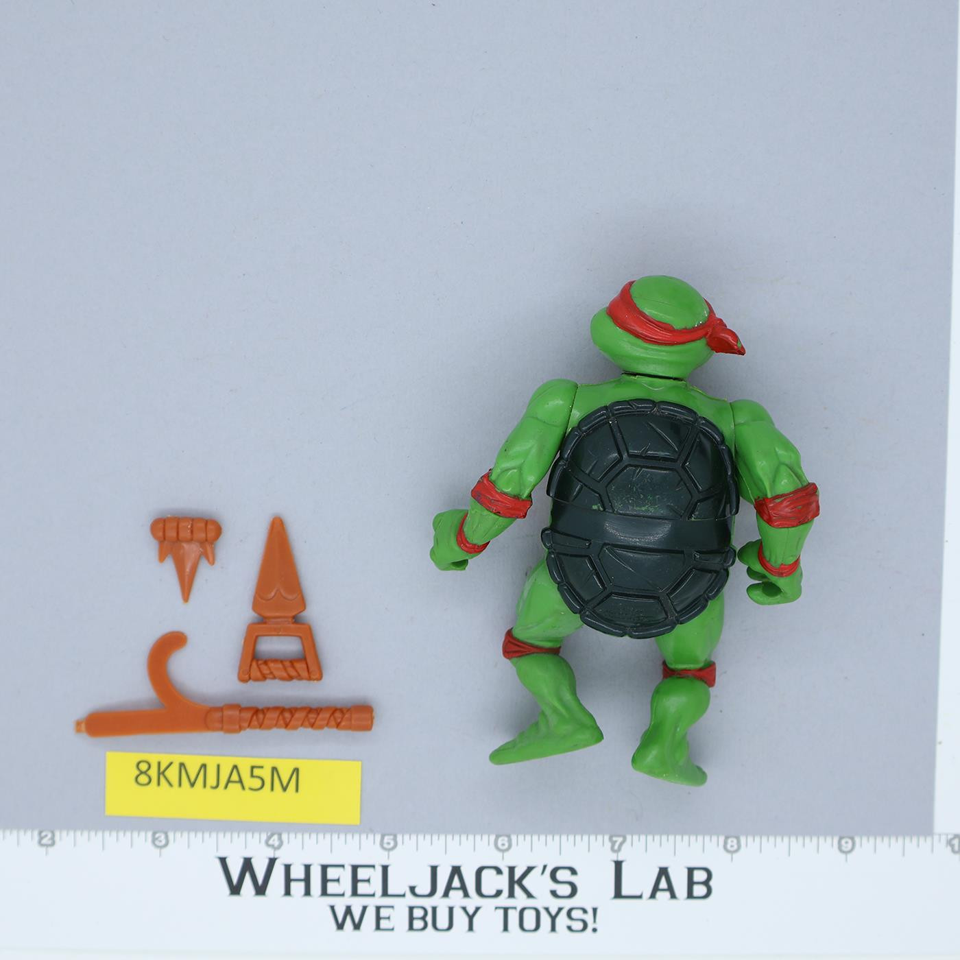 Condition: Rated 85 with light wear. He has some marks on his chest, a black mark above the bandanna in front, and paint wear on the pads and shell. Our grading scale is 1 - 100 with mint flawless a 100, near mint a 95, excellent a 90, and so on. Comes as shown.