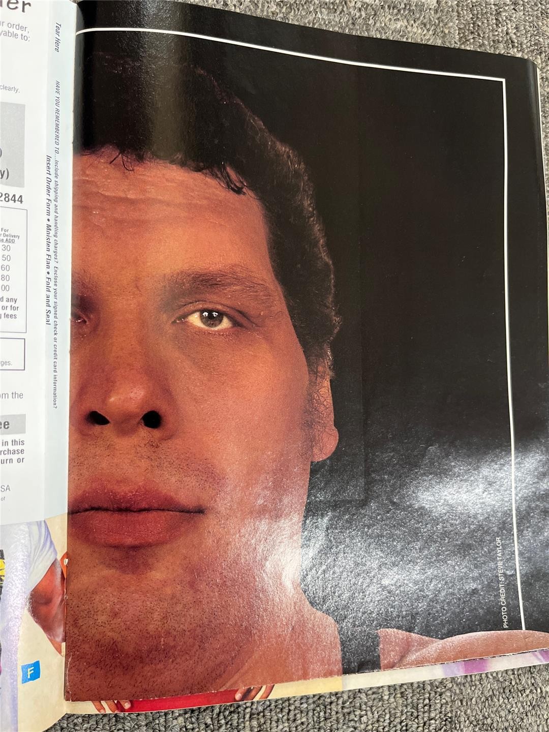 Condition: Issue is in good condition. Magazine has a slight curl along its bottom edge and upper right corner. Some light creasing along spine. Includes photos of his appearance in Princess Bride. Giant double-sided centerfold poster of Andre is intact. Tried to show portions of each side. One poster has "The Eighth Wonder of the World" above his image. Comes as shown.
