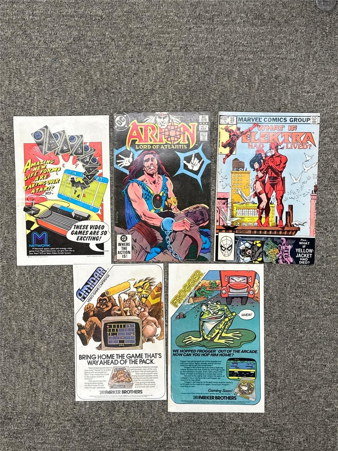 Condition: Mattel & Parker Brothers LOT of 5, 1982 Atari Video Games Print Ads. Arion Lord of Atlantis, Elektra, Star Wars, Amidar, Frogger. In good condition. Each one is a single sheet with ads on front & back except one is 4 pages front & back ads. Light yellowing on a few pages.