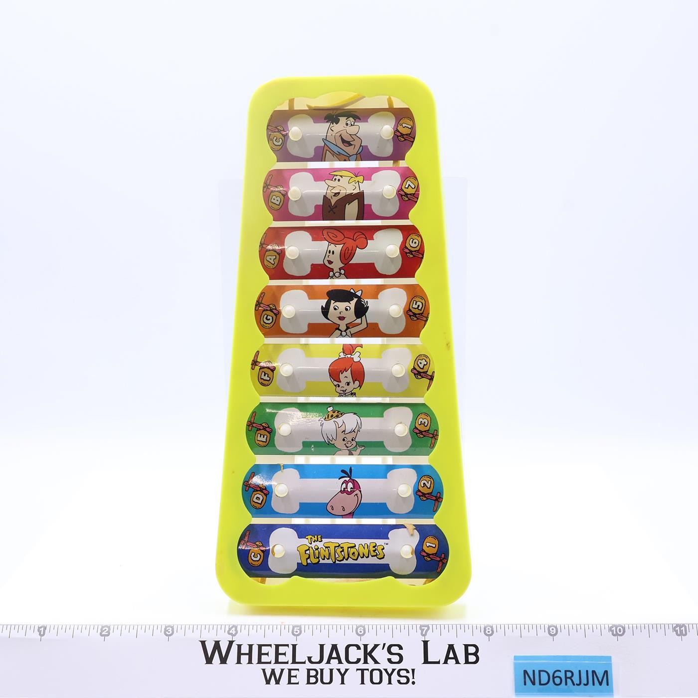 Condition: Xylophone has some wear. Rubber bands that were under bars/keys have disintegrated (remnants are still inside). Bars are numbered and also have musical note names. The 8 bars feature the 7 main characters (Flinstone & Rubble families plus Dino) and The Flintstones logo. Creates a nice array of rainbow colors that are still vibant. Some discoloration on plastic frame. Keys show little wear. Needs a light cleaning. Missing the mallet. Fun display piece for any Flinstone (or music) enthusiast! Comes as shown.
