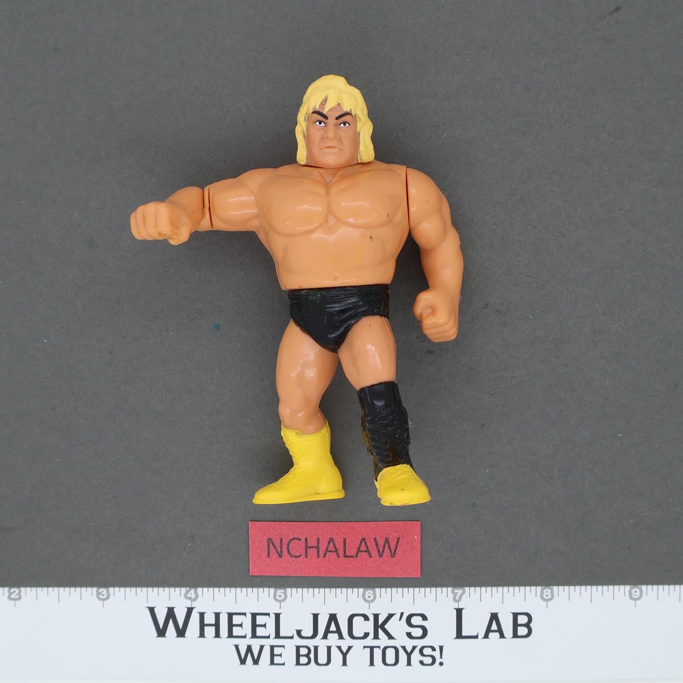 Condition: Rated 90 with light wear. Great condition for Geg "The Hammer" Valentine! He has a very faint white spot on his left chest. Any dark marks seen in photos were removed after they were taken. "The Hammer" wording on his trunks is in nice condition. The mechanism works. His head turns completely around, but there's no issue with it; maybe it's intended behavior. Our grading scale is 1 - 100, with mint flawless a 100, near mint a 95, excellent a 90, and so on. Comes as shown.