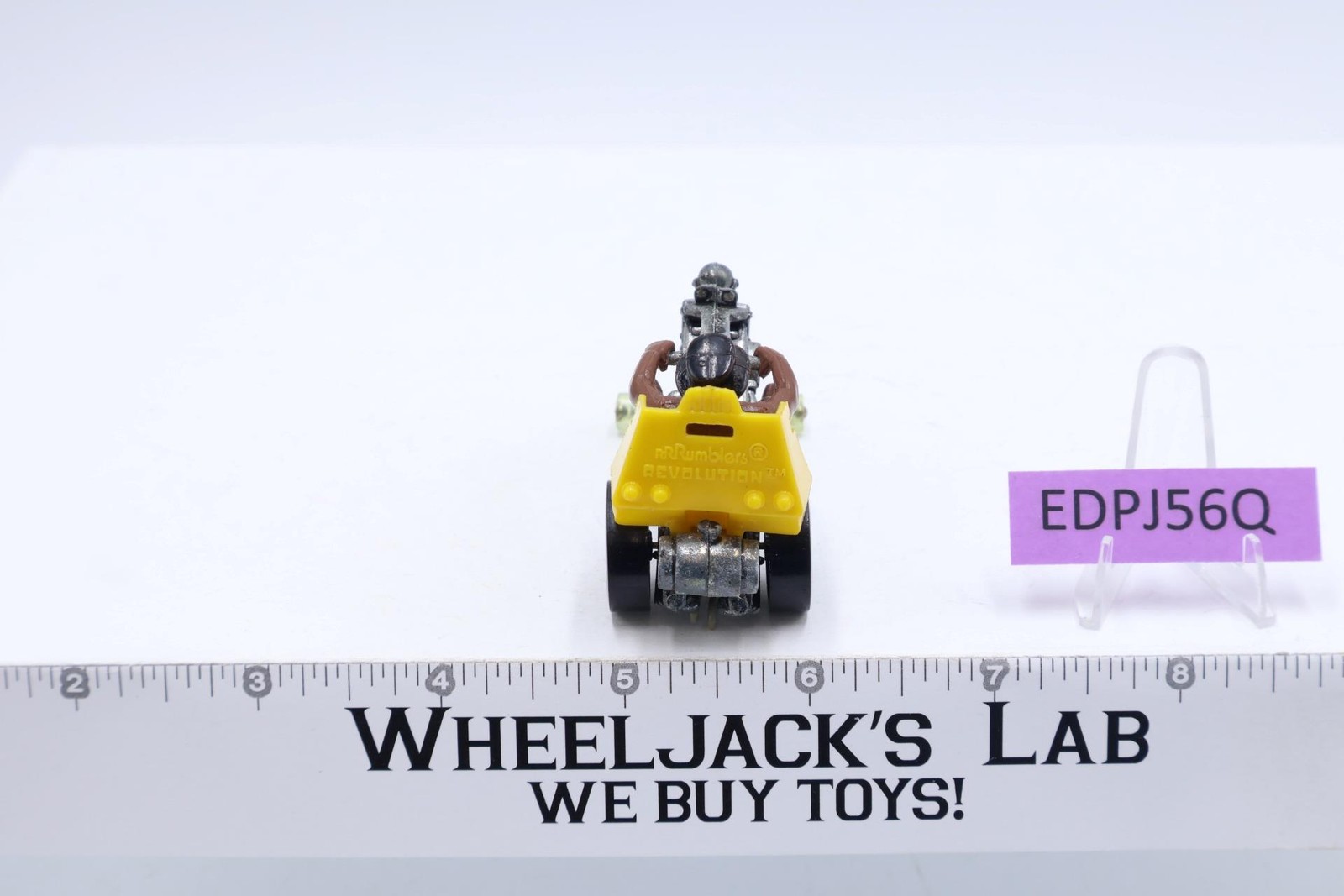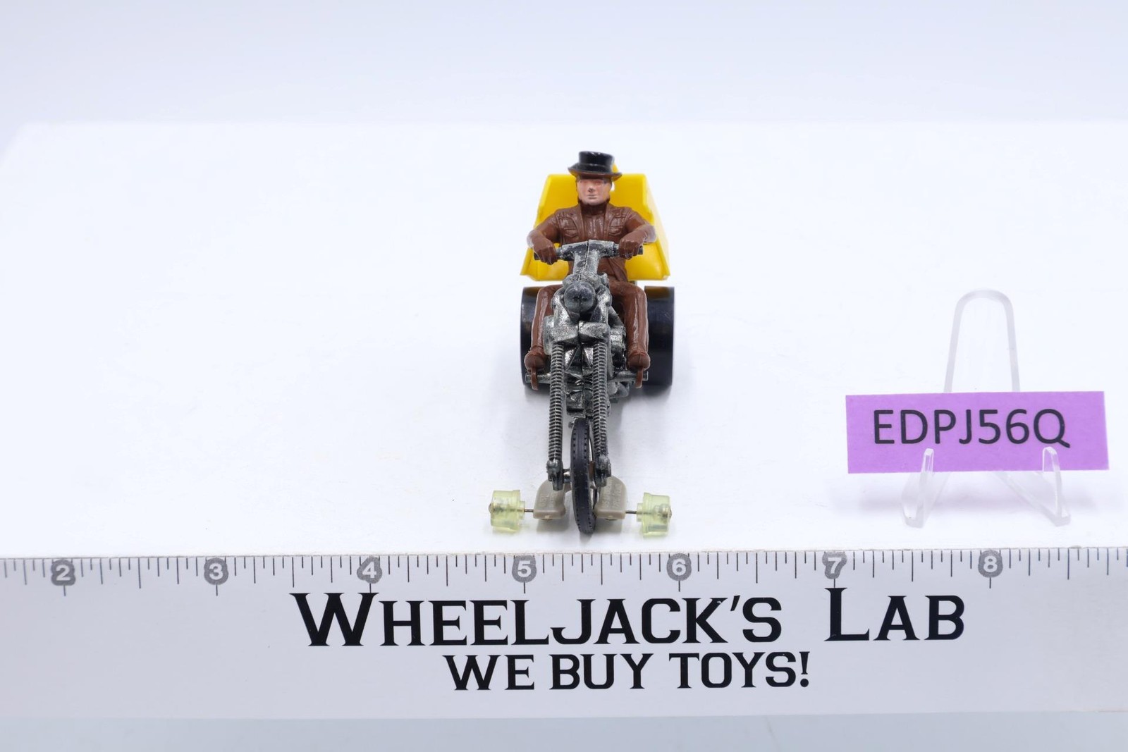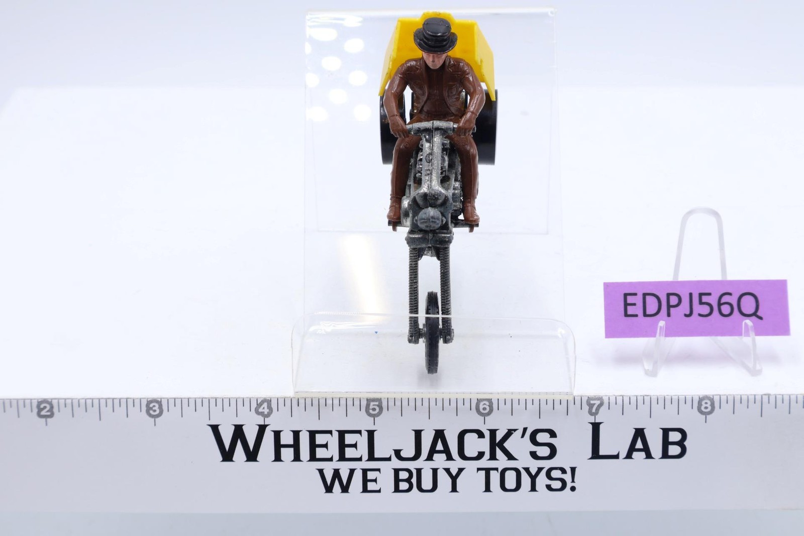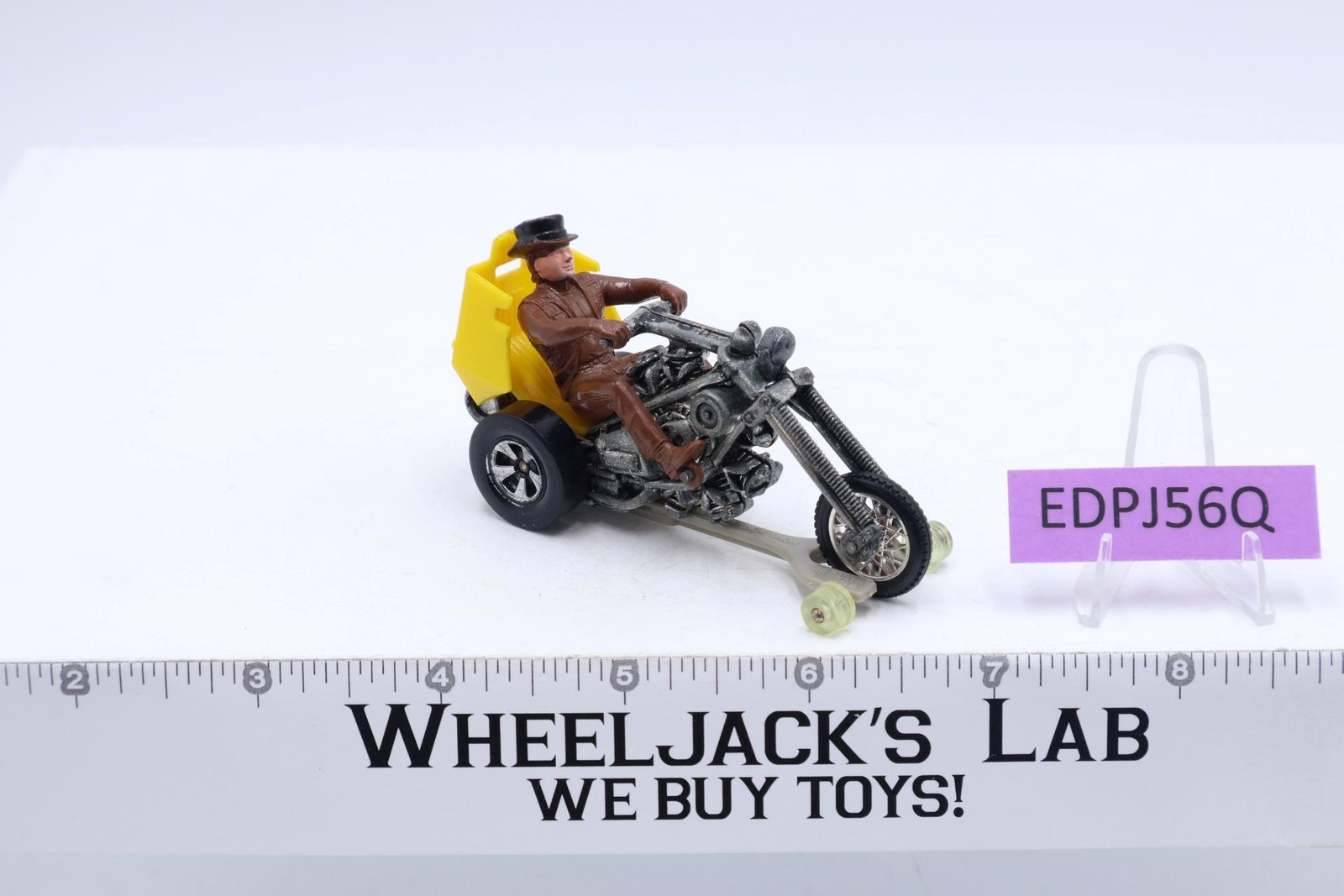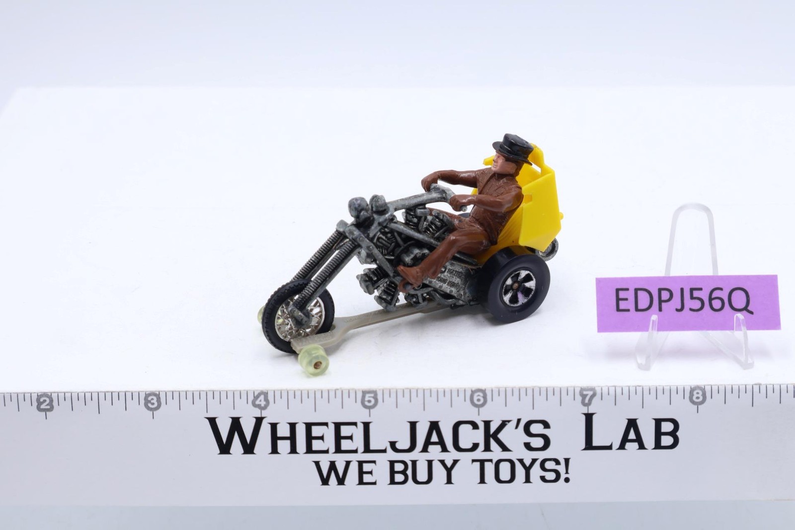 Vehicle Condition: Rated 80 with some wear. Missing canopy cover. Our grading scale is 1 - 100 with mint/flawless a 100, near mint a 95, excellent a 90, and so on. Chrome on tires has some wear. Tires have light wear. Includes Track-Rack stand (to allow racing on Hot Wheels track). Comes as shown.