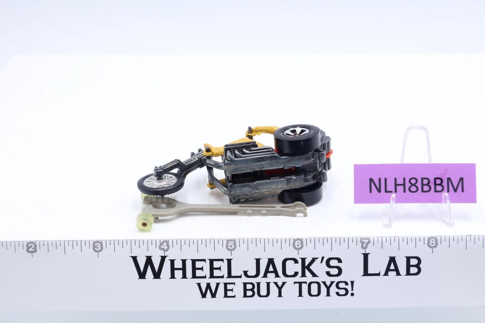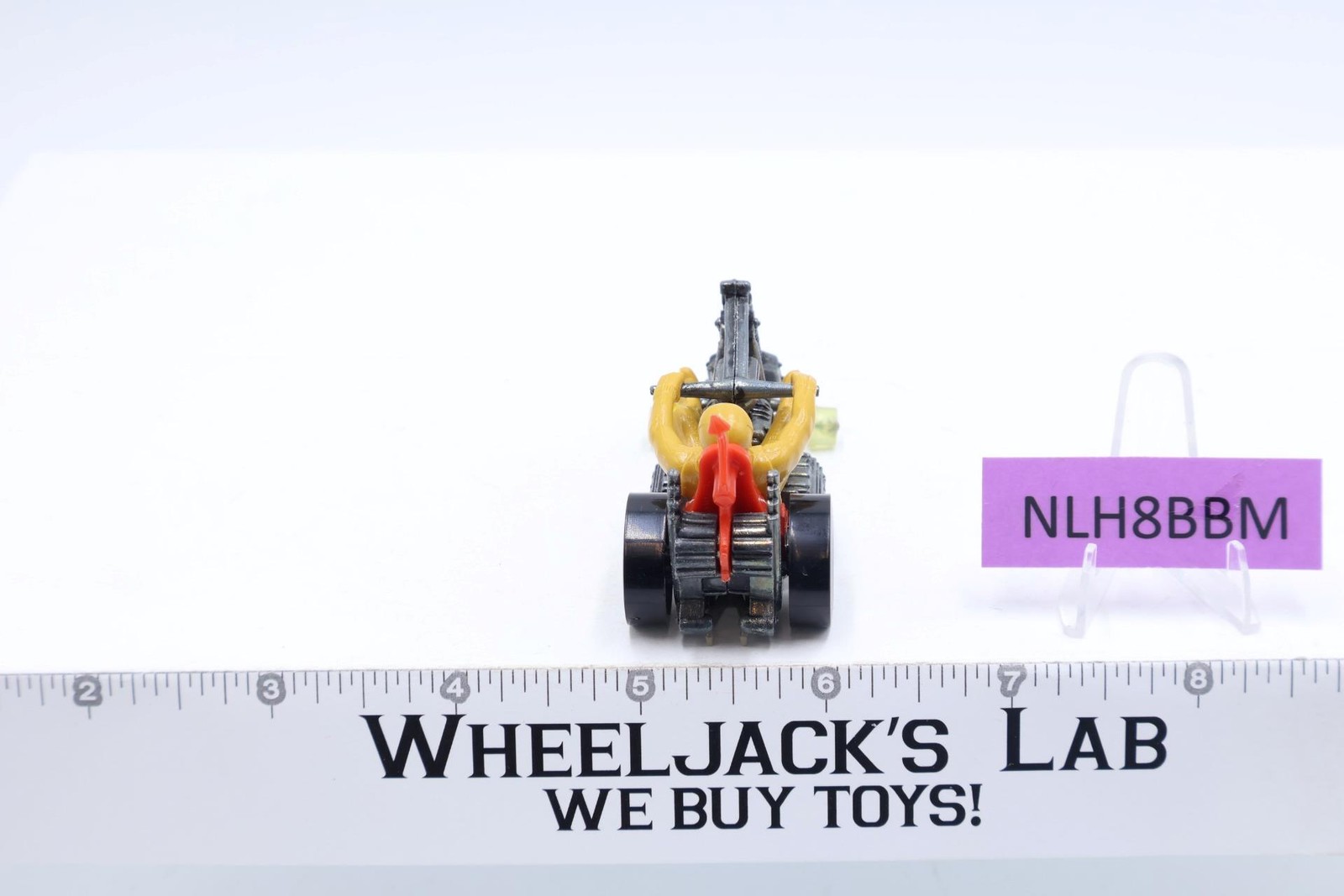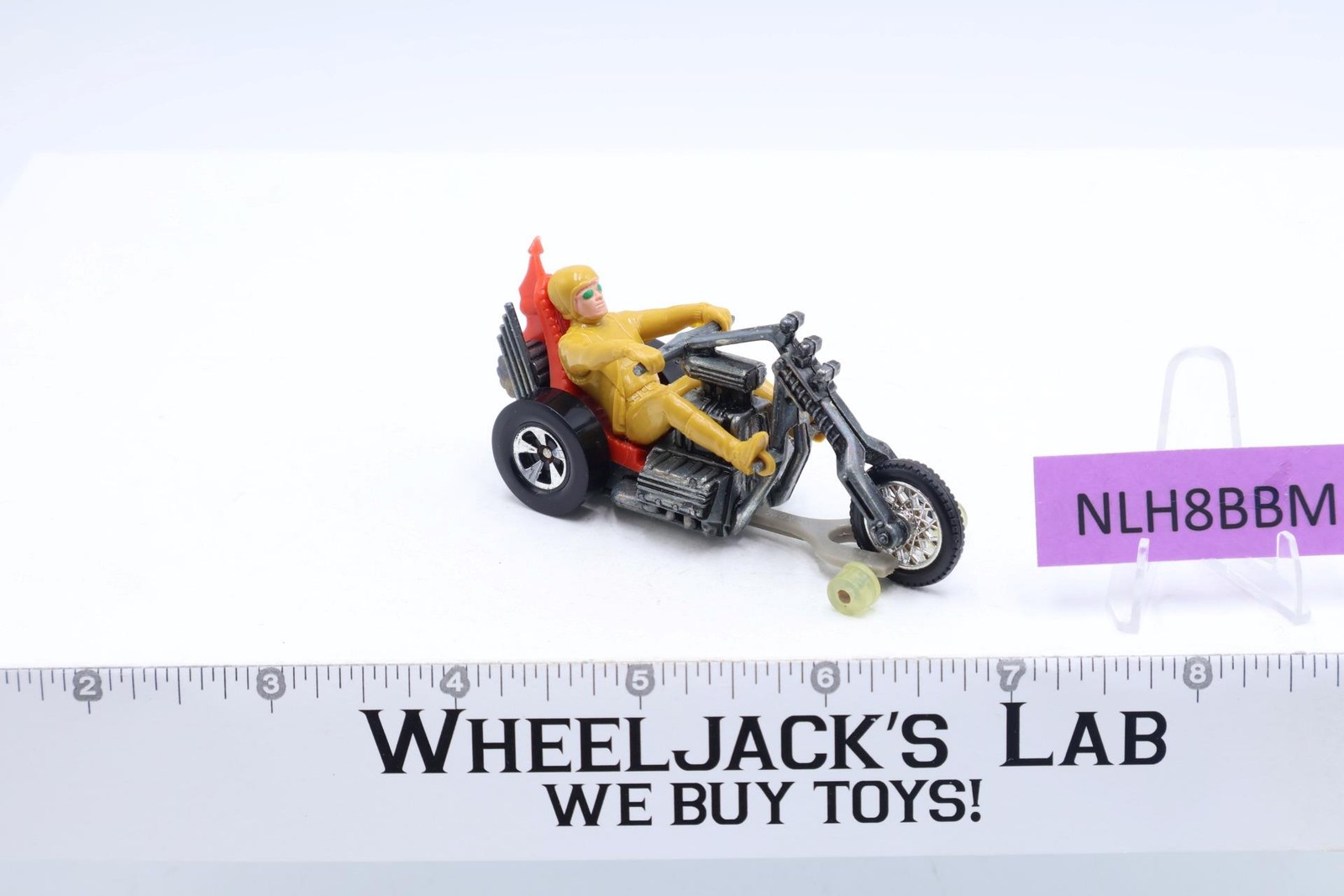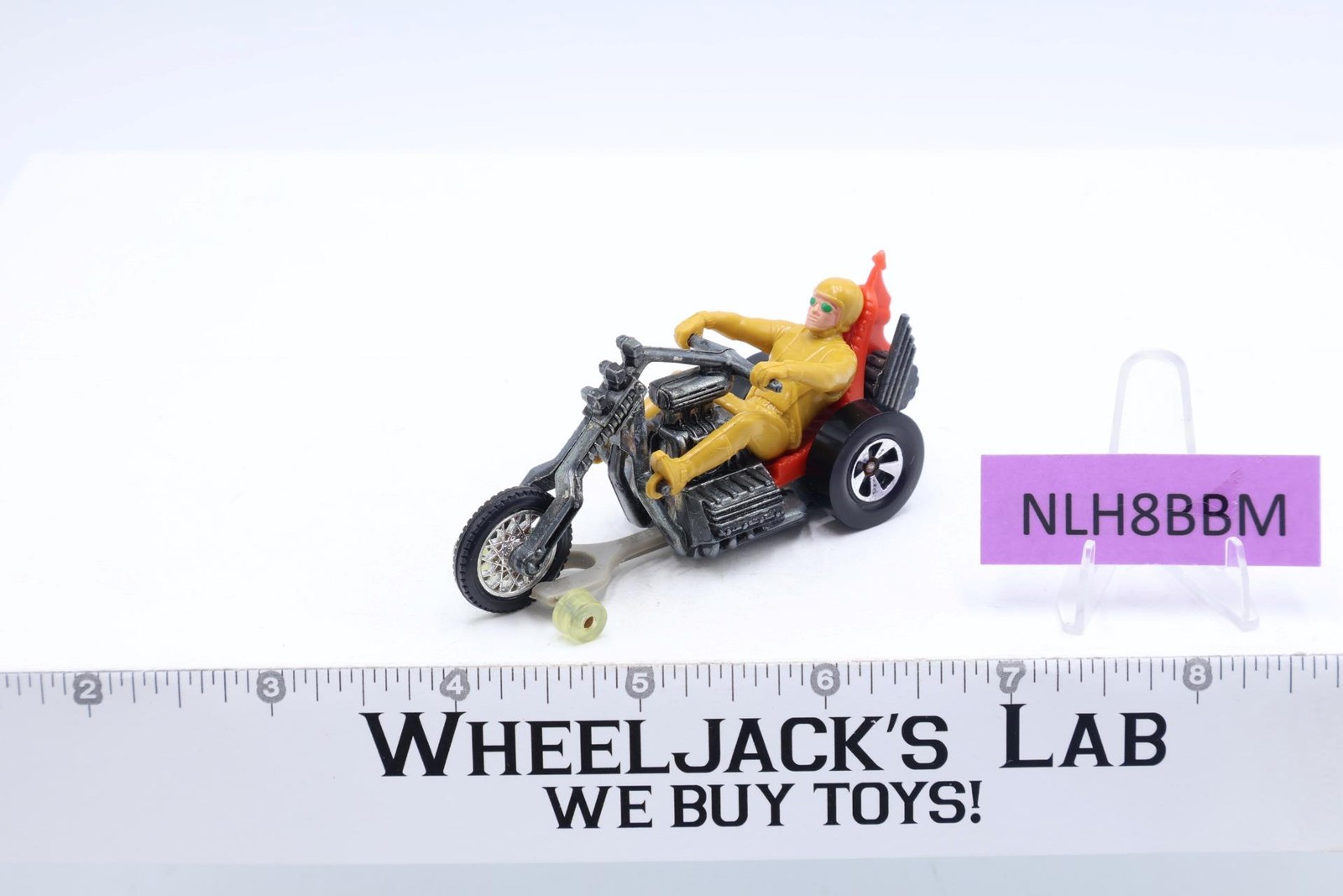 Vehicle Condition: Rated 88 with light wear. The tip on back of seat has curved. Our grading scale is 1 - 100 with mint/flawless a 100, near mint a 95, excellent a 90, and so on. Tire and tire Chrome have light wear. Includes a track guide/track-rack stand (to allow racing on Hot Wheel track). Comes as shown.
