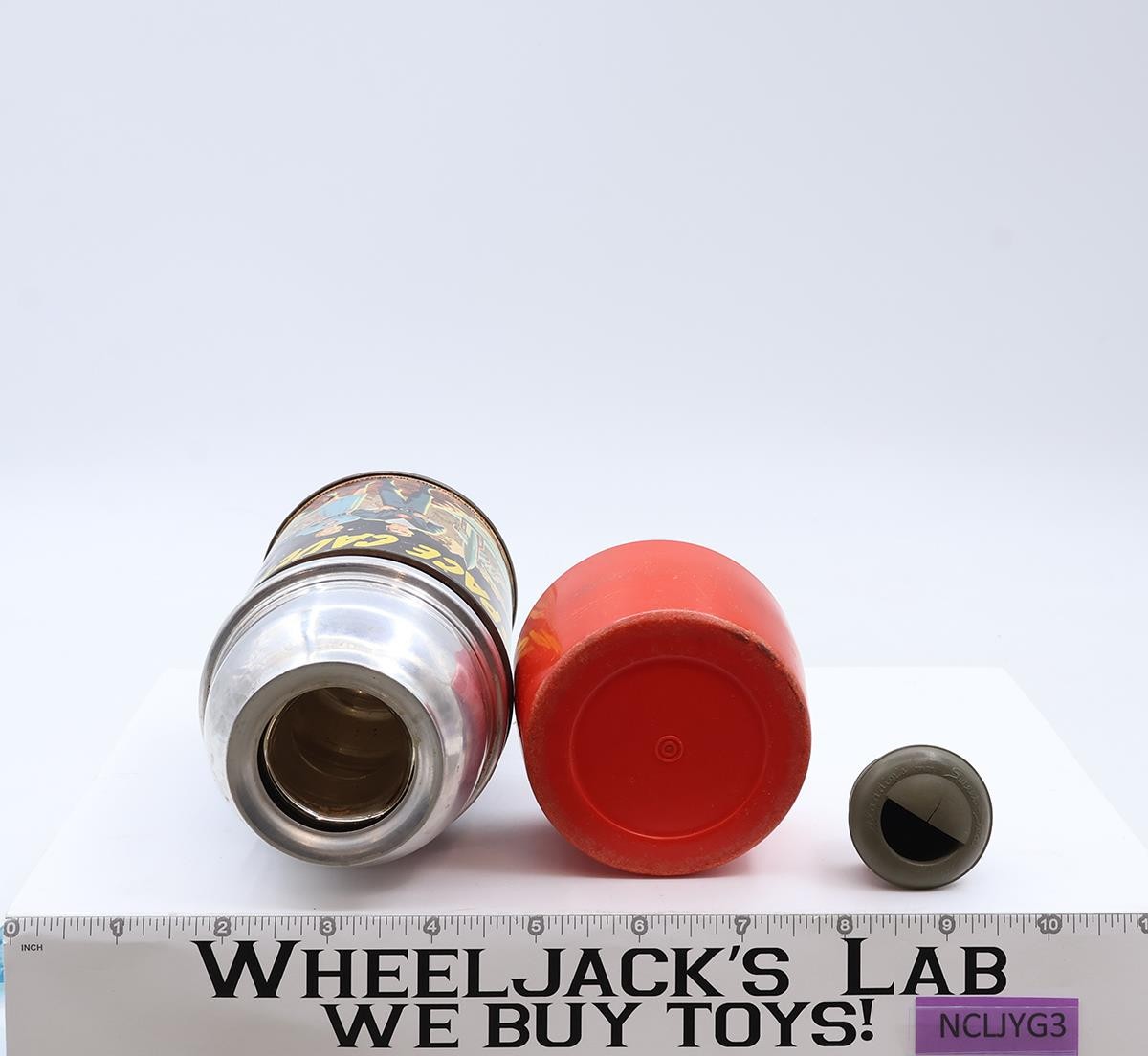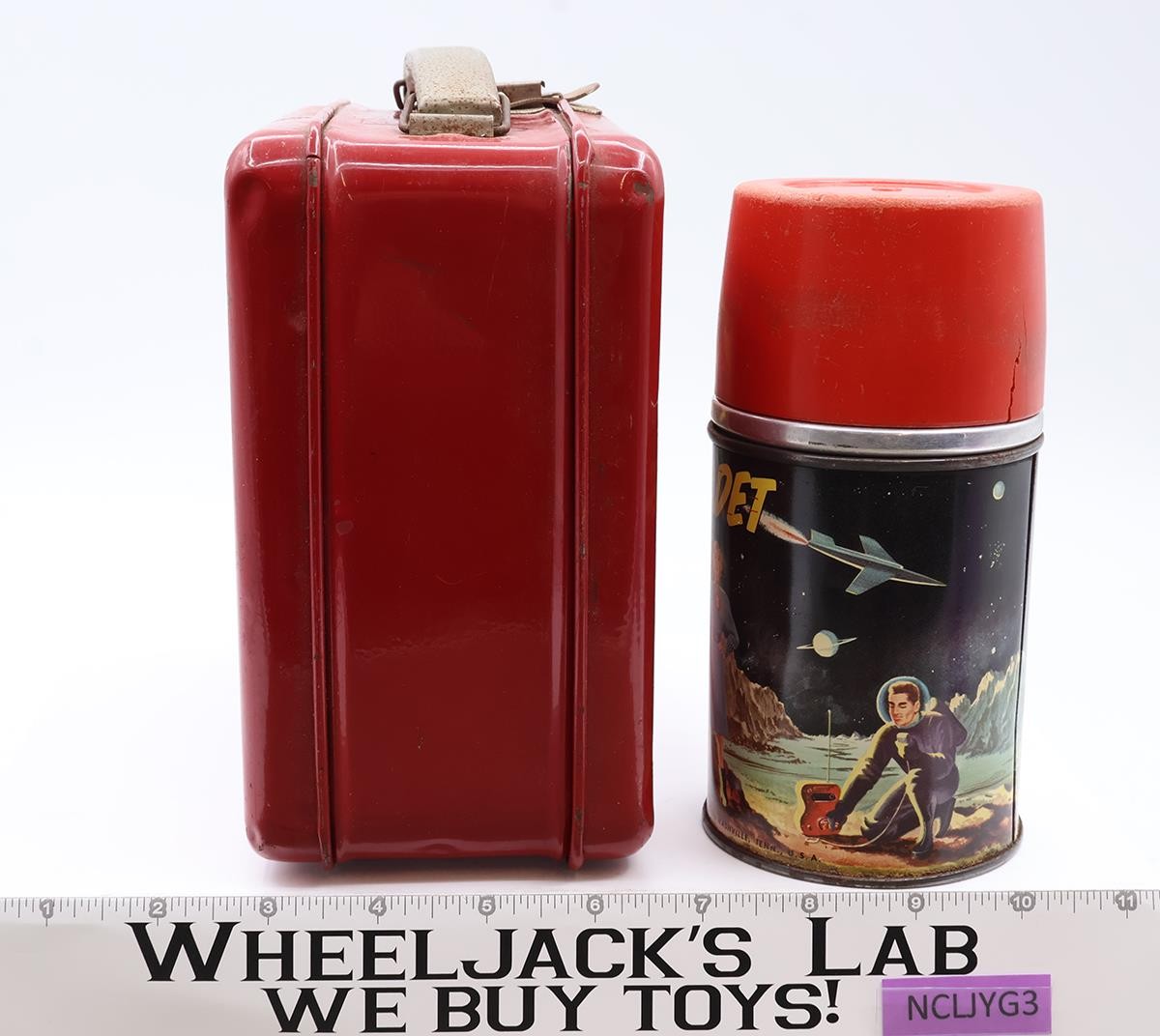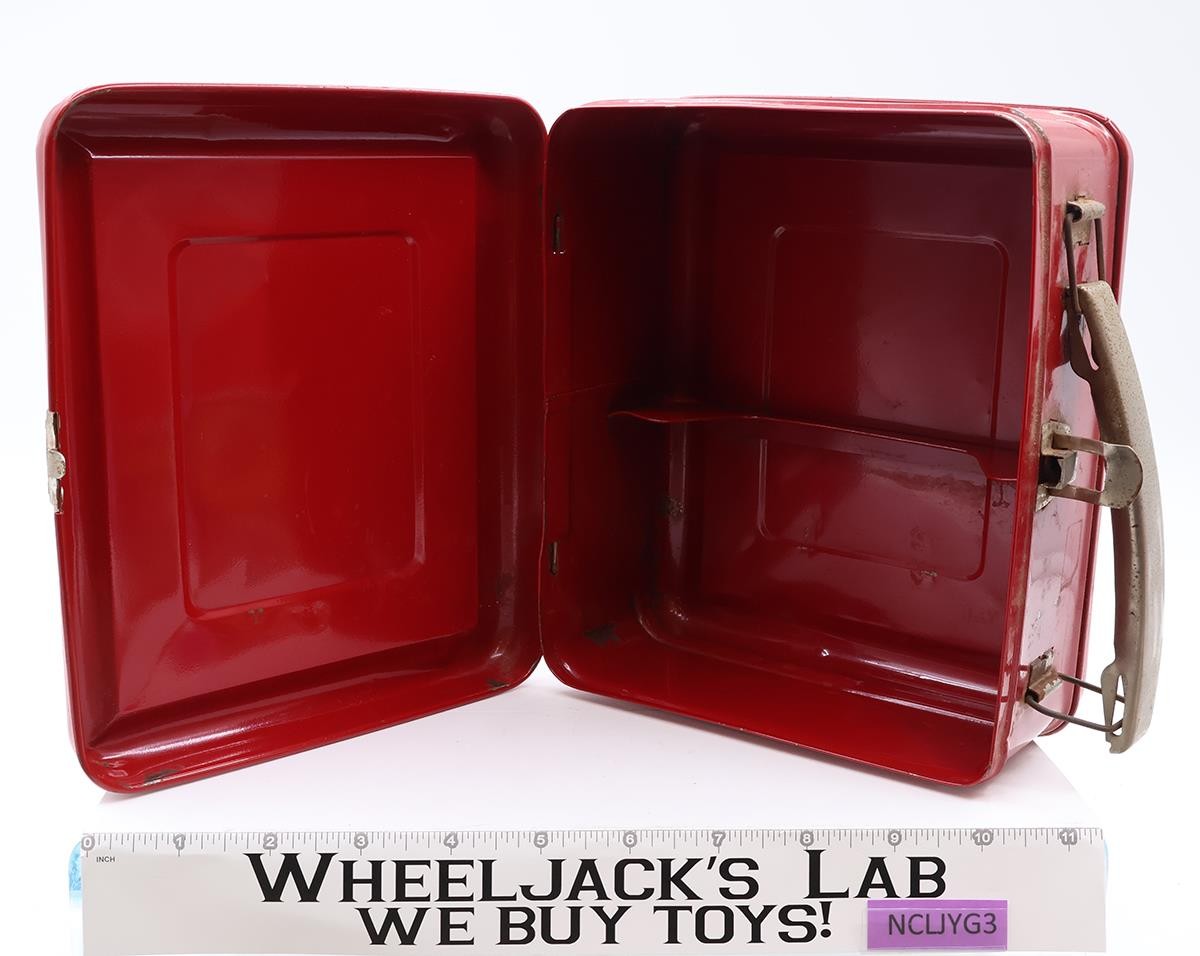 Condition: The lunchbox is made of metal. It has some wear with scuffing and some minor dents. Image on front is intact with some light scuffing; colors are still vibrant. Back of box has name plate with name (address was scribbled out). Name plate has some scuffing. Handle and latch are intact with some rusting. Interior of lunch box has some rust. Thermos is included and has both lids. Inner glass liner is intact but has shifted. The inside of the thermos sleeve has rusted (only visible when metal collar is unscrewed and inner liner removed). Comes as shown.