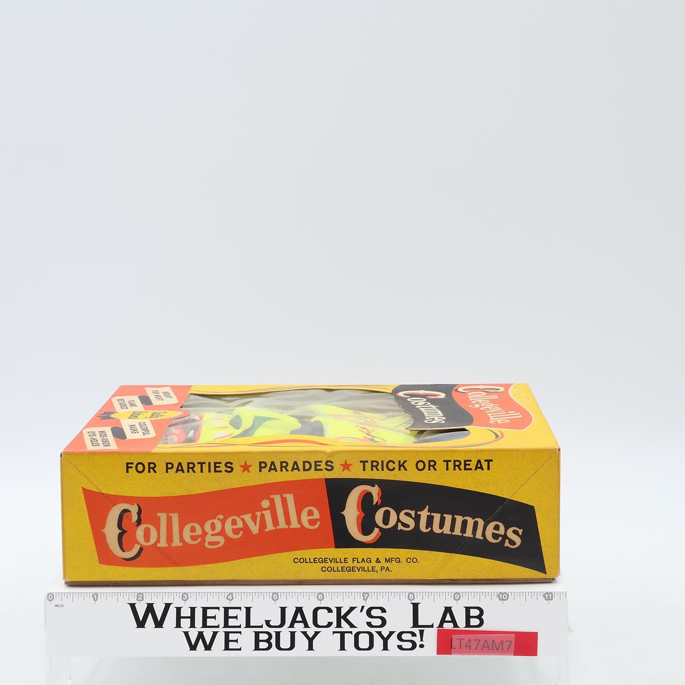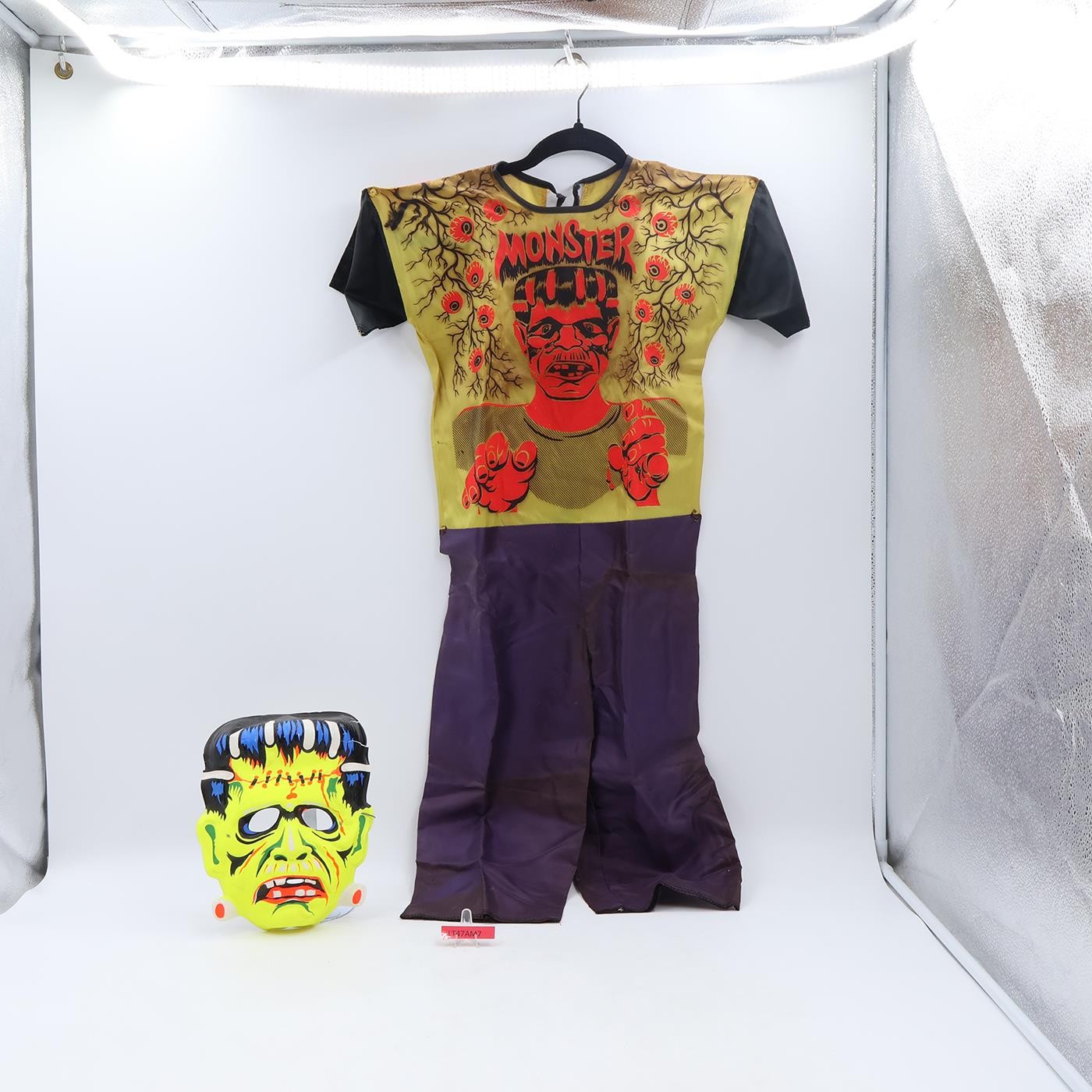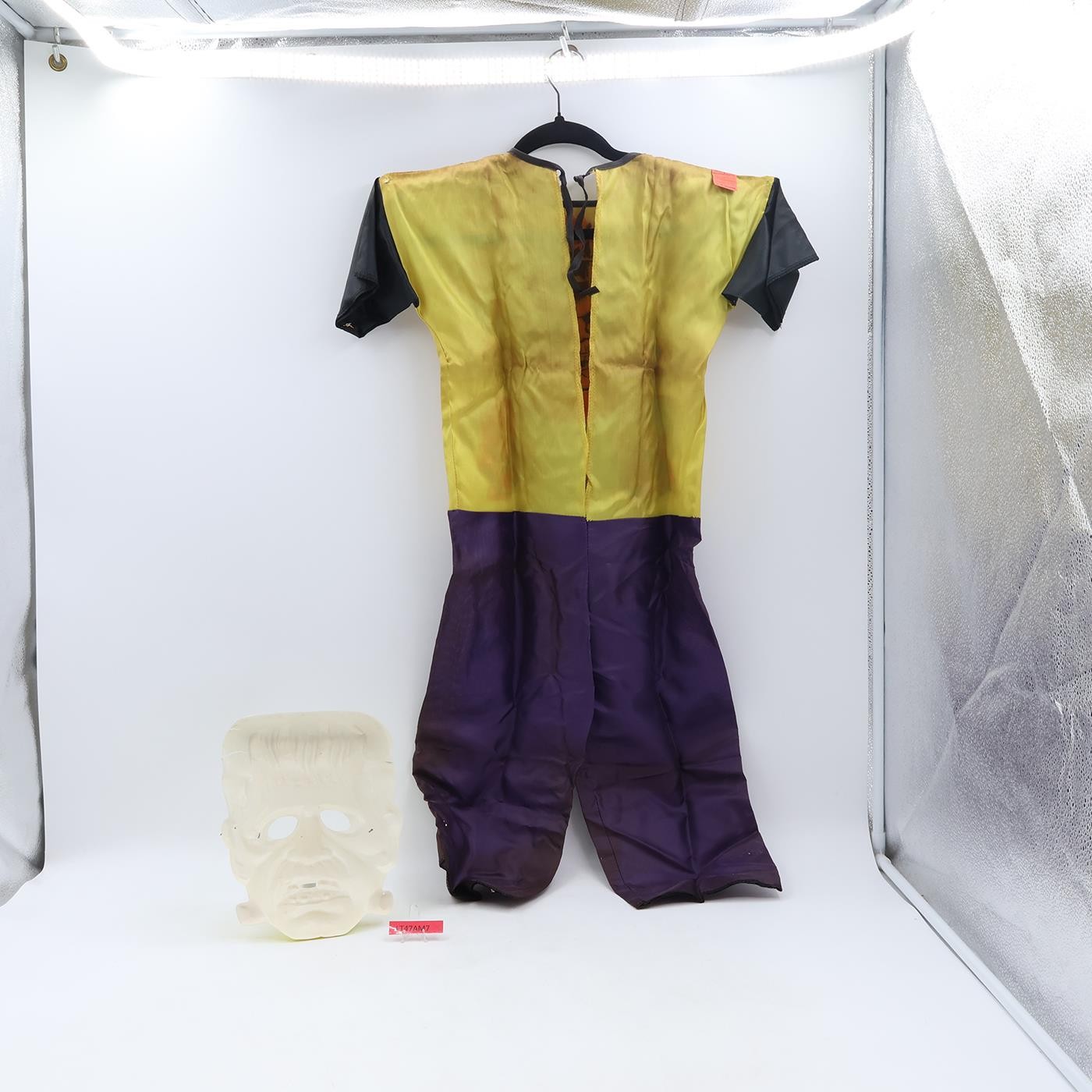 Costume Condition: This listing is for a Ben Cooper Frankenstein (technically Frankenstein's Monster). Costume is children's size Medium (8-10). Some wear on the screened images and cracking. Both knees have ripped out. Costume has multiple tears and stains. Binding at neck has started to come undone on both ends. Both arms are frayed at sleeve end. Very wrinkled and fabric has stiffened with time. Stains on legs may have been caused by moisture.