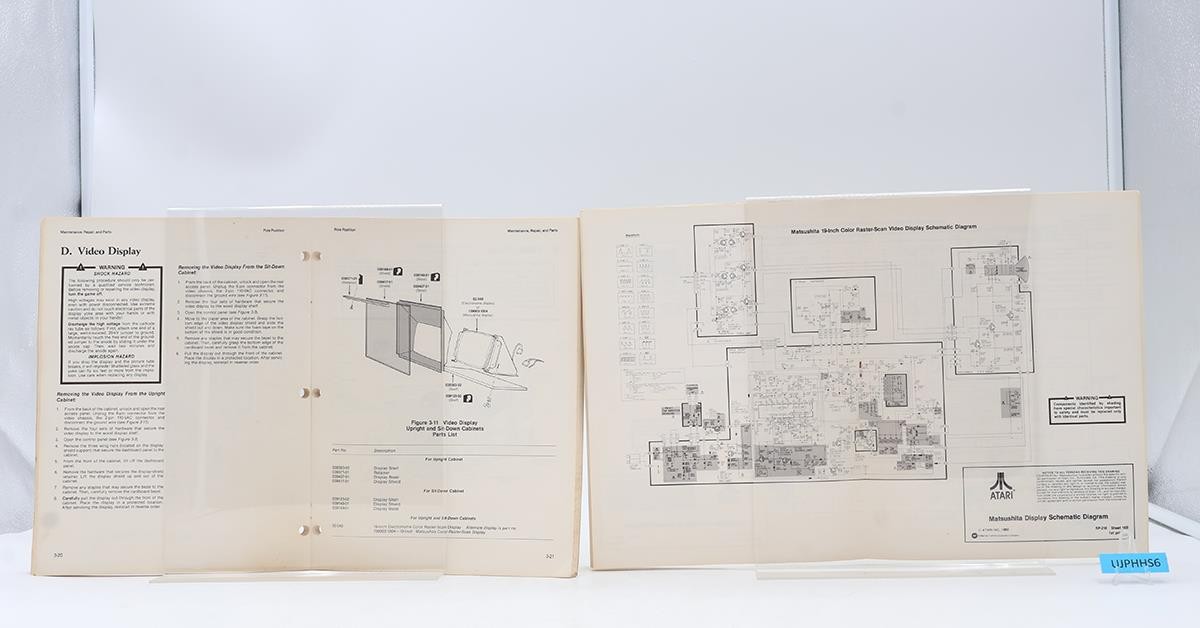 Condition: Operation, Maintenance and Service Manual (1st Printing, 1982 by Atari, Inc) has some wear. Staples intact; staples have some rust. Three-hole punched; light scuffing along spine. Book pages have foxing. Bottom edges of several pages have stains (see photo). Manual includes parts lists and a glossary. Back cover has some spotting. Front cover bottom right has soiling. Also includes the Schematic Package Supplement (1982, 1st Printing, Atari). First page has separated from the staple and has a small piece missing near center (see photo). All other pages are intact; Staple has rusted. Cover has some spotting and soiling. Some of the green from Service Manual rubbed off onto front page of supplement. Neither book has any writing or highlighting on the pages. Comes as shown.