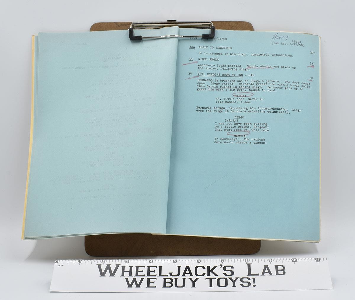 Condition: Rated: Very Fine. Some light discoloration and markings on the front cover. No creasing or tears. There are written notations or corrections for his (Henry Calvin's) lines by him. This is not a reproduction, it is original. The item was previously owned by Henry Calvin who portrayed Sergeant Demetrio Lopez Garcia on the show, Zorro. Comes as shown.