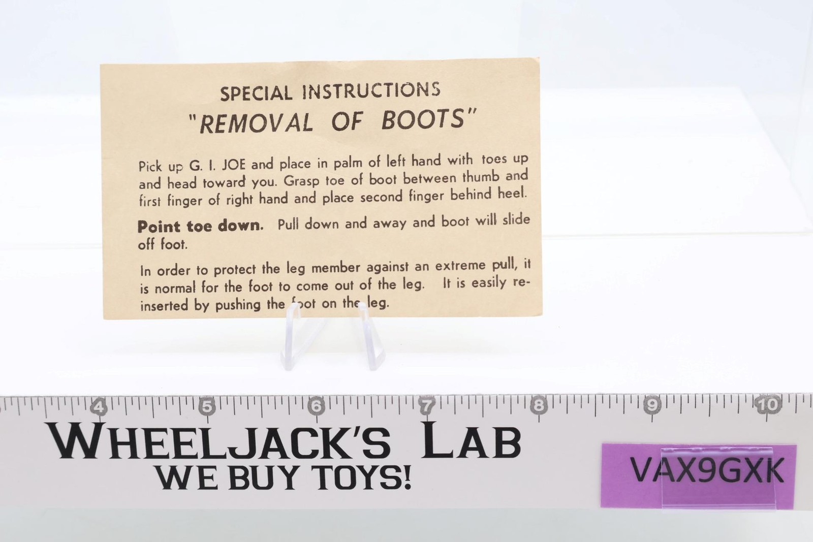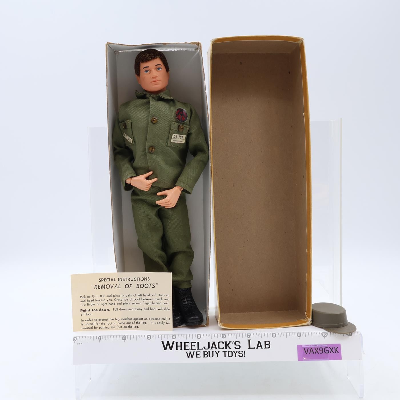 Accessories: The uniform is in good condition, with all but one snap intact. It also comes with boots, dog tags, and a hat. There is also a paper with removal of boots instructions.