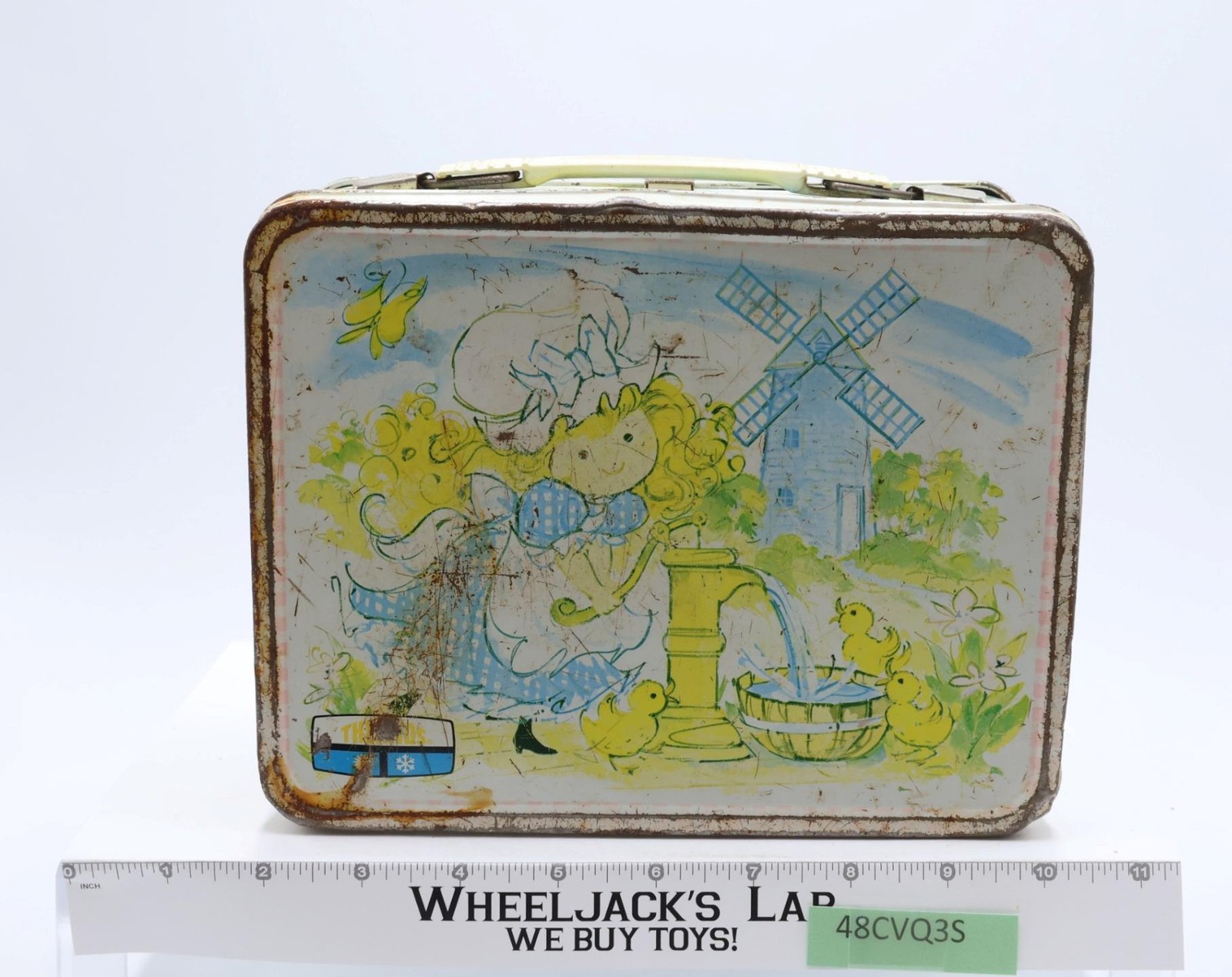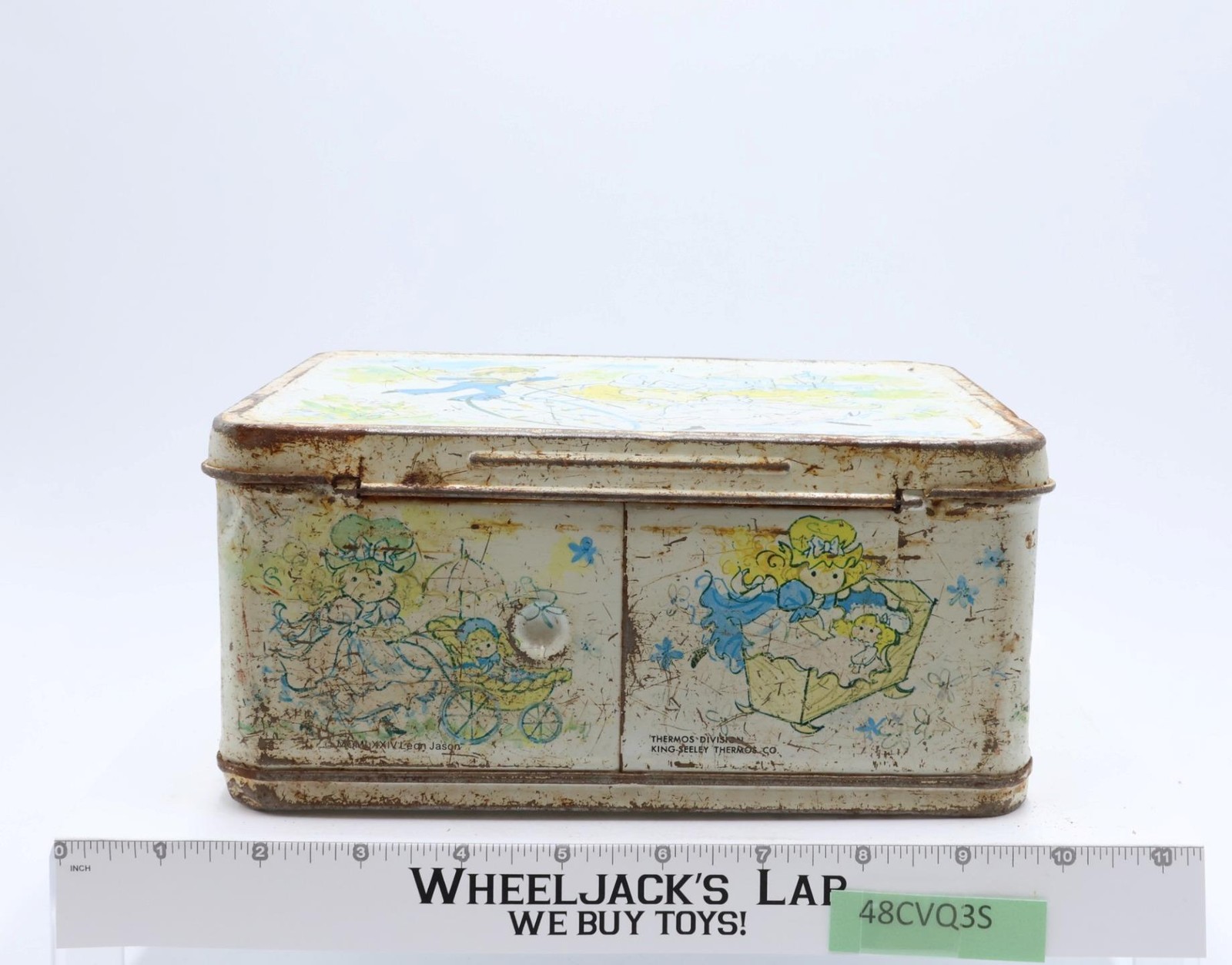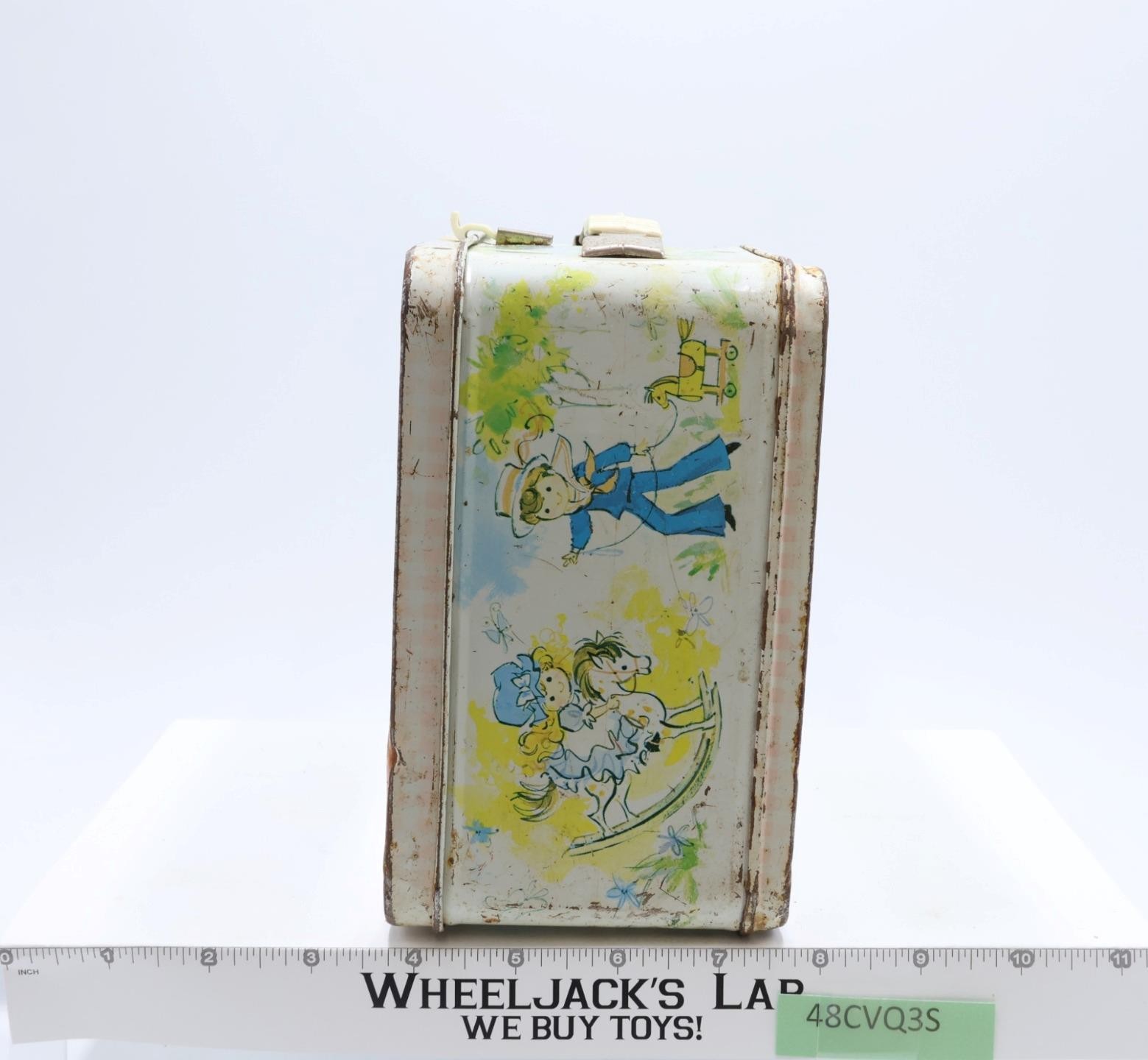 Condition: The lunchbox is made of metal and has heavy wear with scuffing along edges and rust. Front has multiples scratches that have rusted as well as denting. The latch and handle are intact and working; some rust on metal parts of handle and latch. Lunchbox needs cleaning. Interior has some rust. Name has been scratched inside the box lid. Does NOT included thermos. Comes as shown.