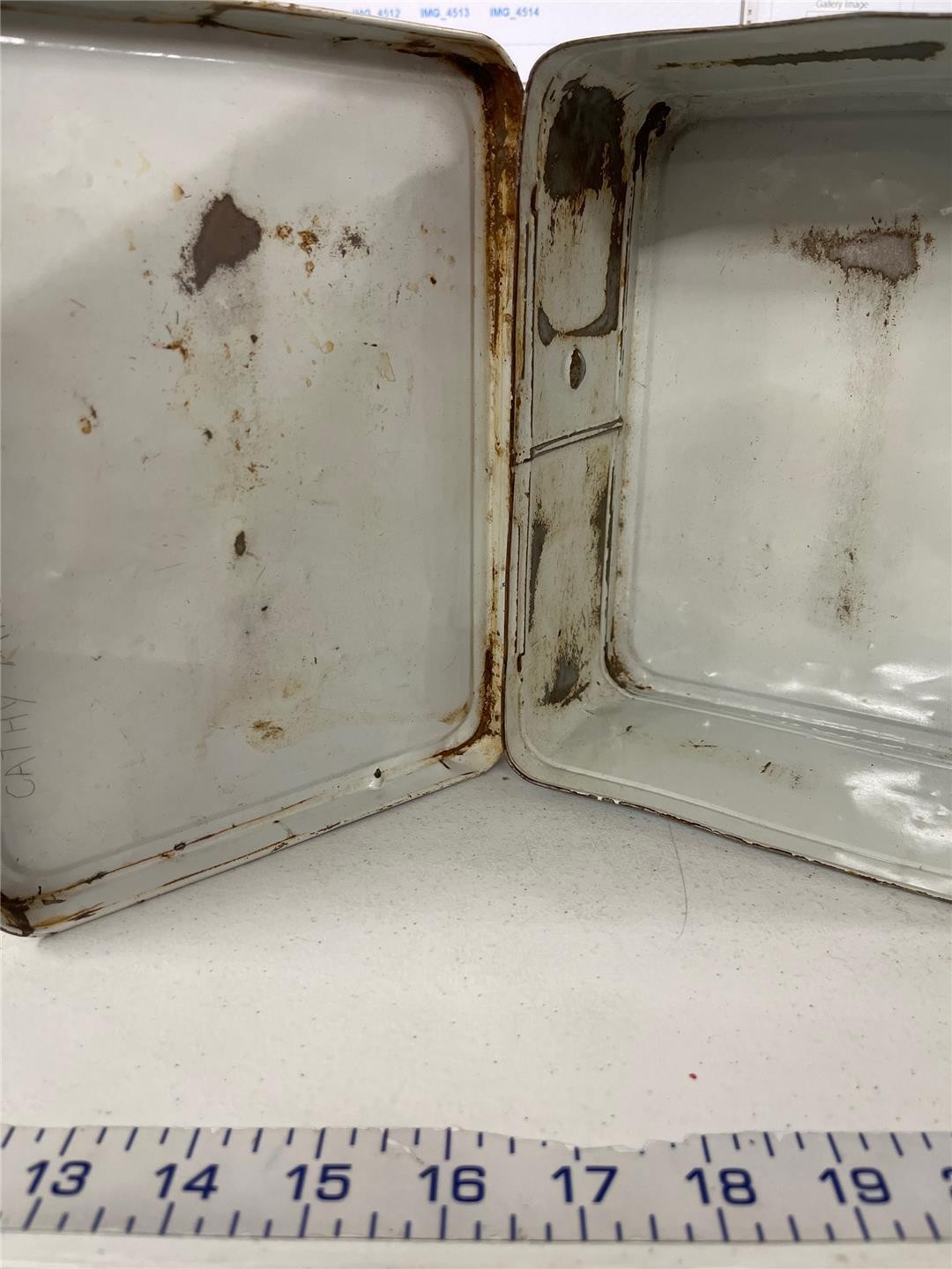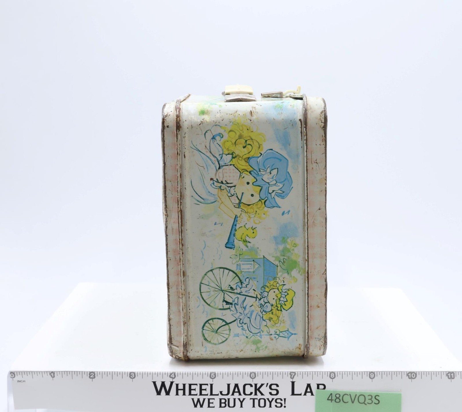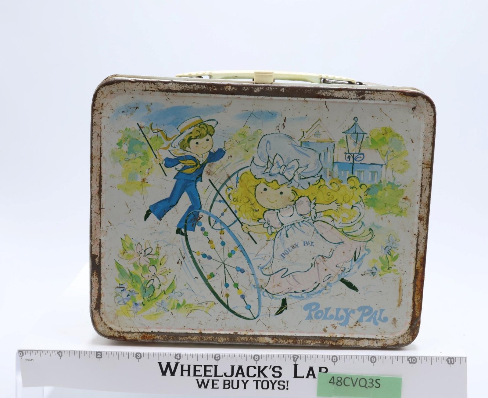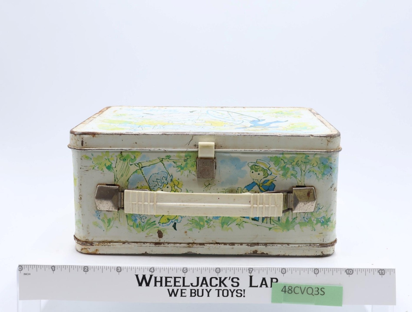 Condition: The lunchbox is made of metal and has heavy wear with scuffing along edges and rust. Front has multiples scratches that have rusted as well as denting. The latch and handle are intact and working; some rust on metal parts of handle and latch. Lunchbox needs cleaning. Interior has some rust. Name has been scratched inside the box lid. Does NOT included thermos. Comes as shown.
