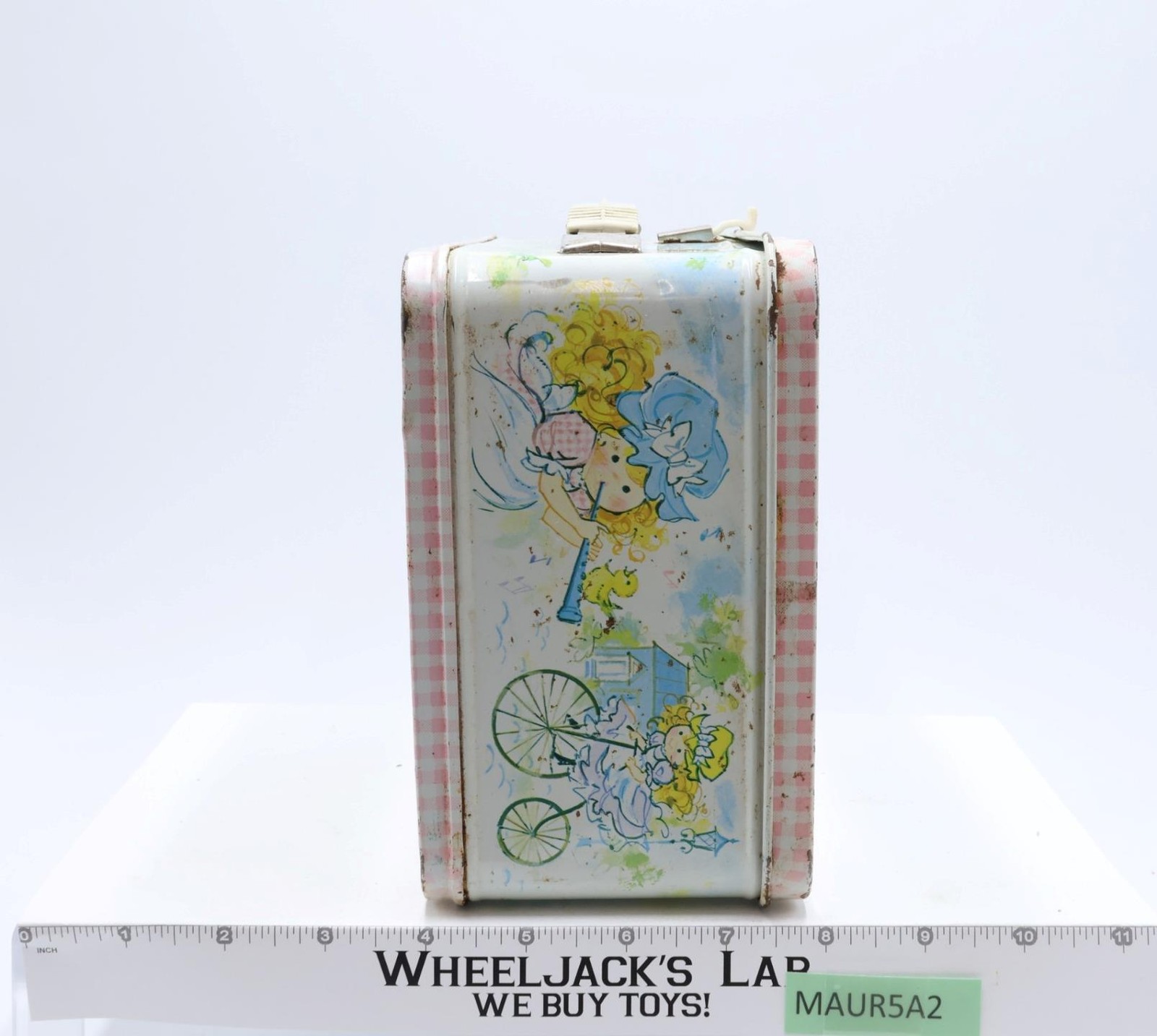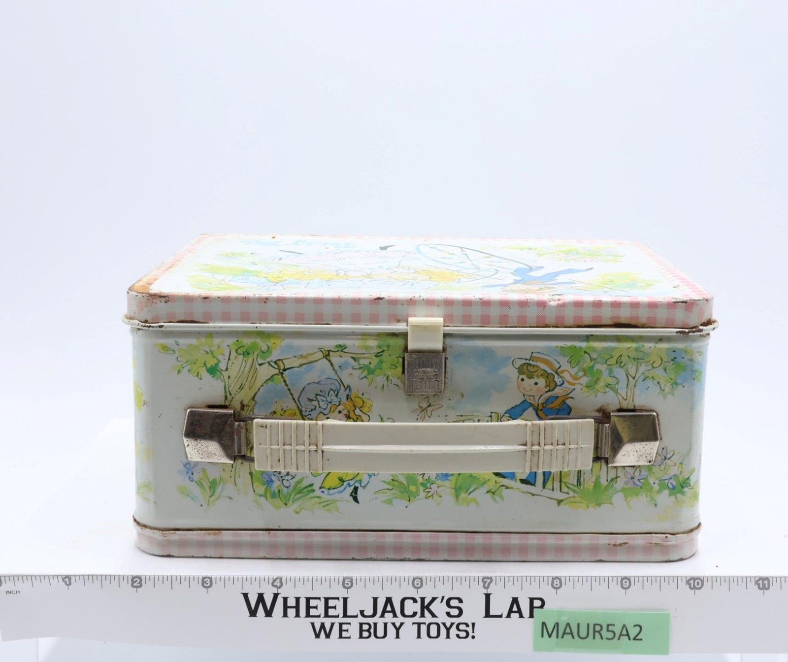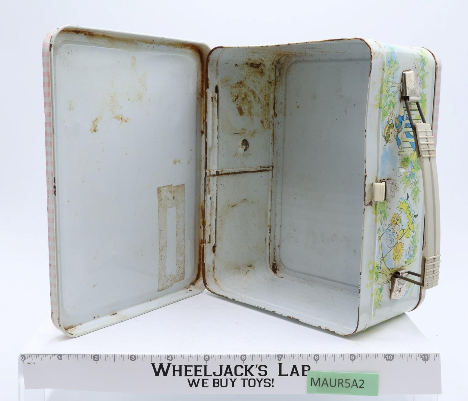 Condition: The lunchbox is made of metal. It has some wear with scuffing along edges and rust where scratched. Front has some small dents. The latch and handle are intact and working; some rust on metal parts of handle and latch. Lunchbox needs cleaning. Interior has some rust and tape residue. Comes as shown.