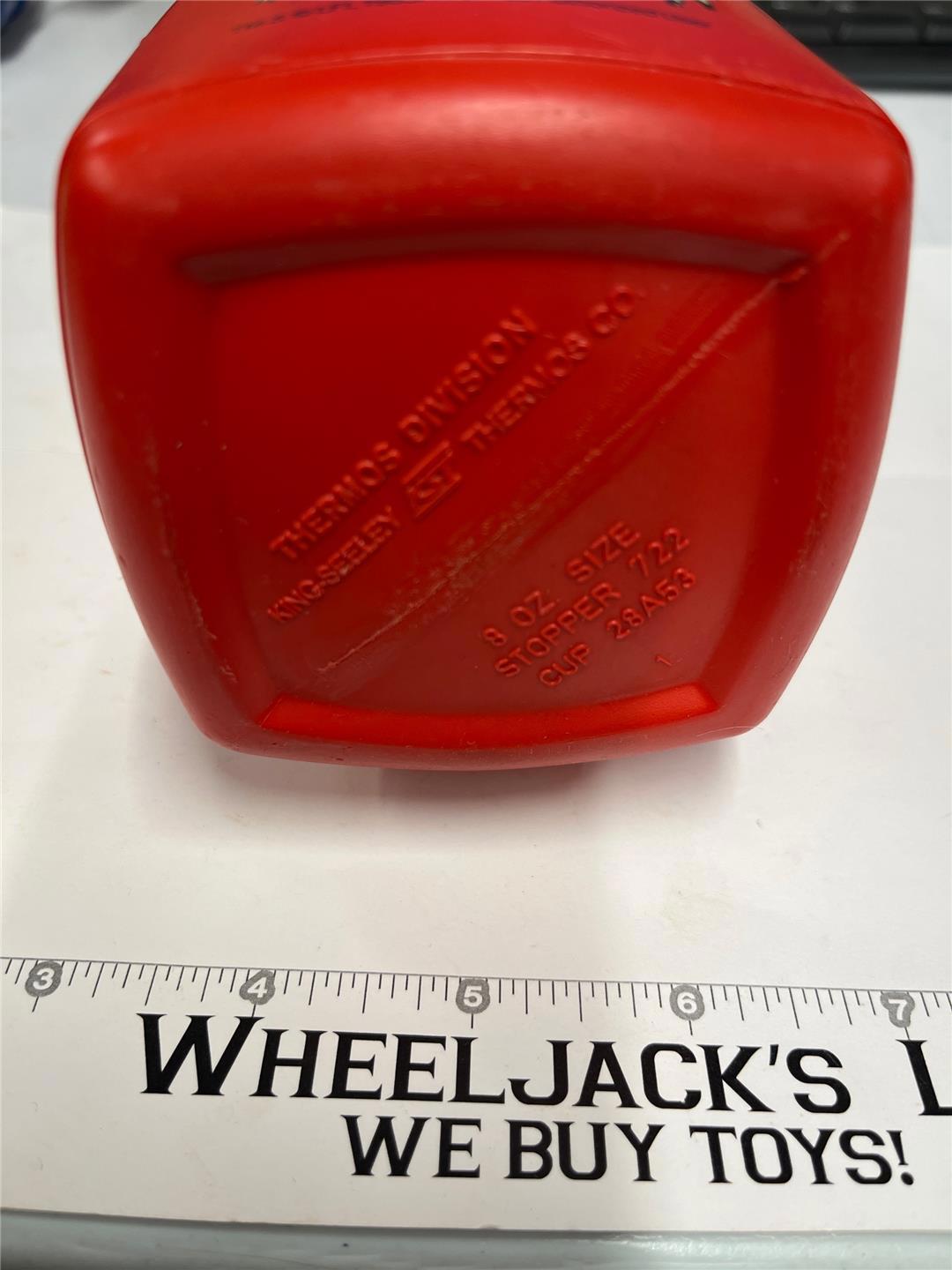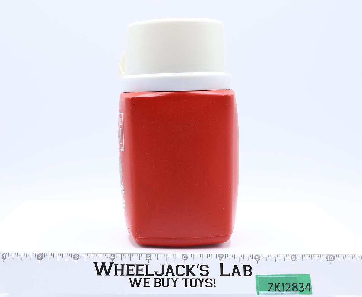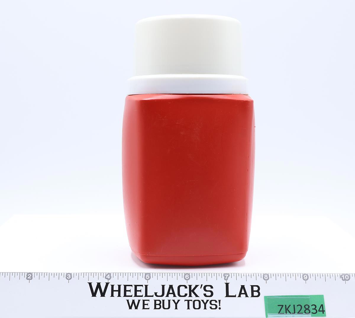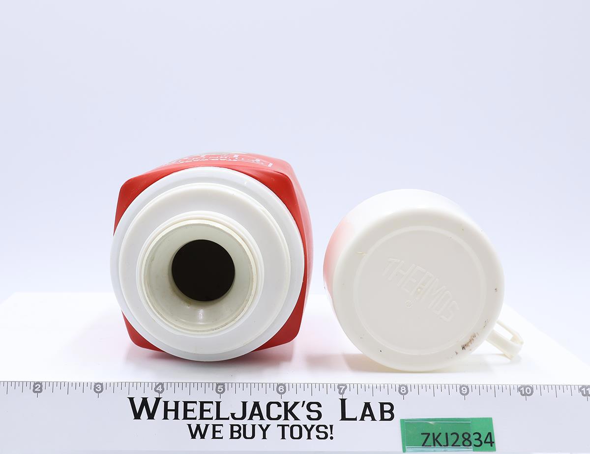 Condition: Plastic thermos has light wear. Inner lid is missing. Outer lid has some scuffing. Needs cleaning. Comes as shown.