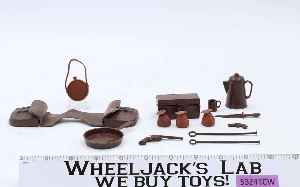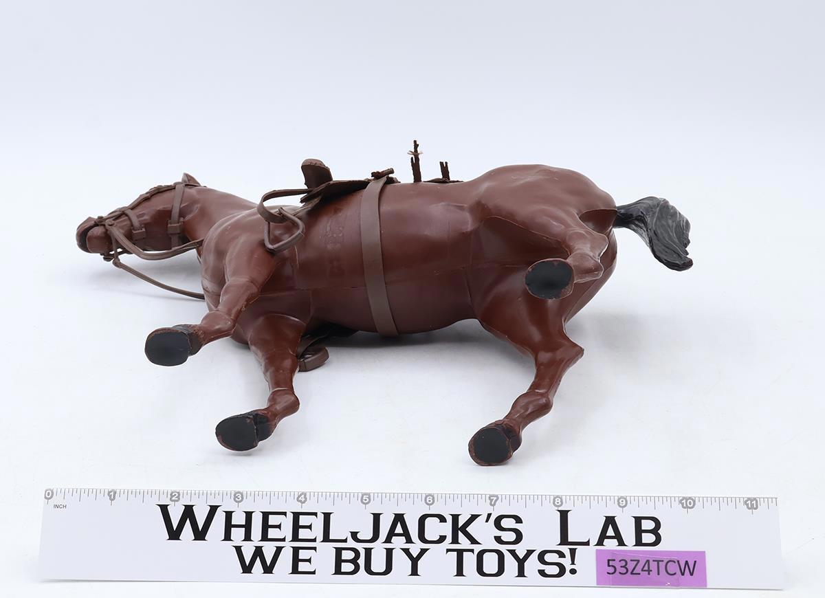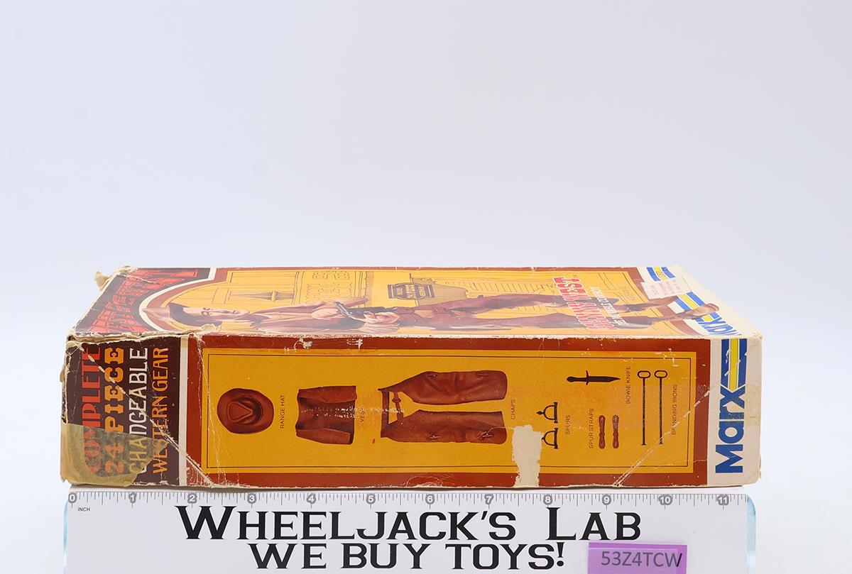Box Condition: The bottom half of the box is intact with no tears or rips. The top shows heavier wear with three corners torn, one taped. Condition: Rated 83 with some wear; it may need cleaning. It is not broken. Our grading scale is 1-100, with mint flawless at 100, near mint at 95, excellent at 90, and so on. Comes as shown. Accessories: Both the Johnny West figure and the Thunderbolt horse are complete. Includes everything shown, including the Equipment Manual for the figure. The cinch on the saddle appears to be reinforced by thread on both sides. Joint Condition: Tight.