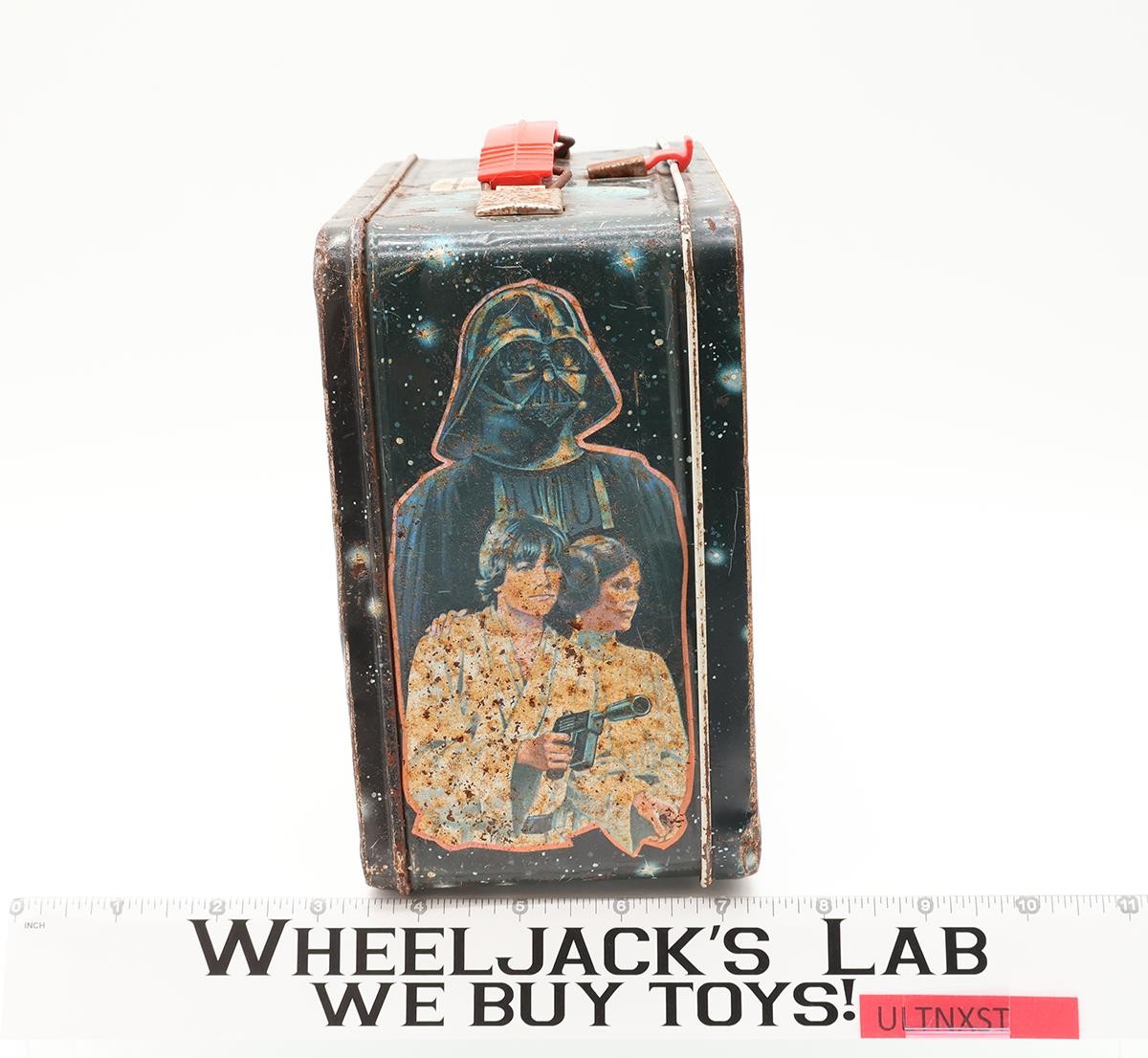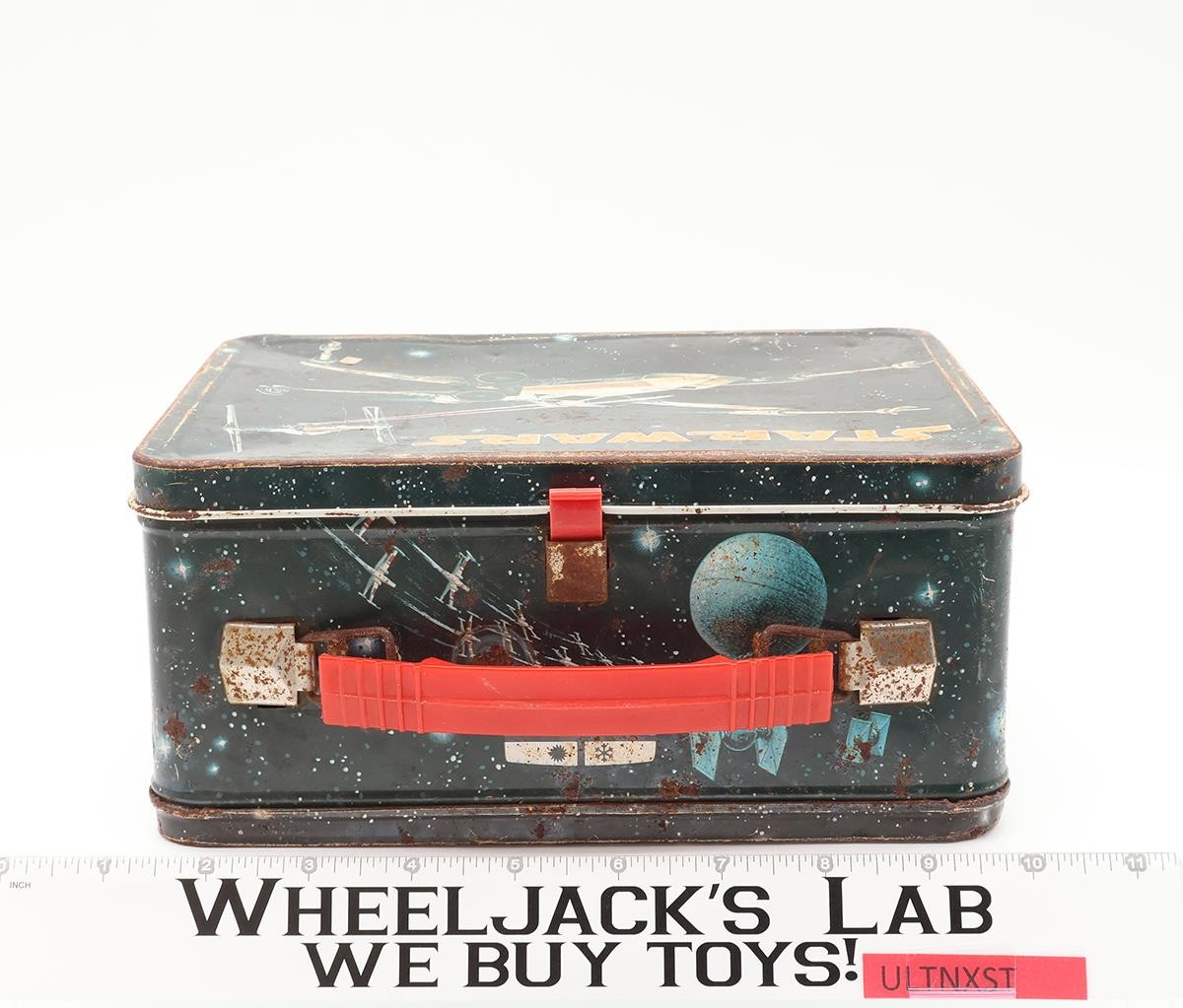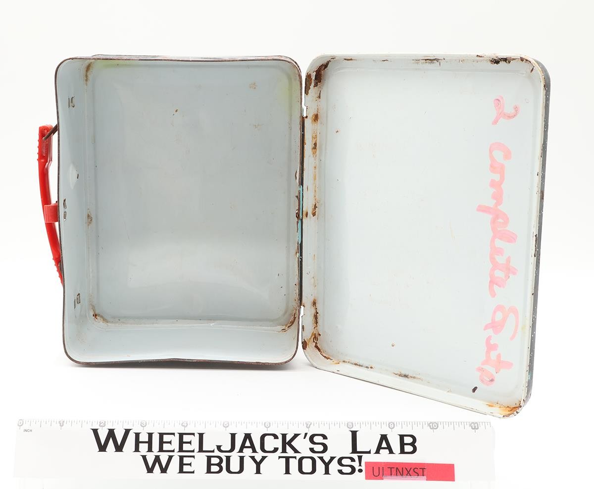 Condition: The lunchbox is made of metal. There is rust on the inside and outside. It will need cleaning/dusting. The latch and handle work but are rusted on the metal portions. Comes as shown.