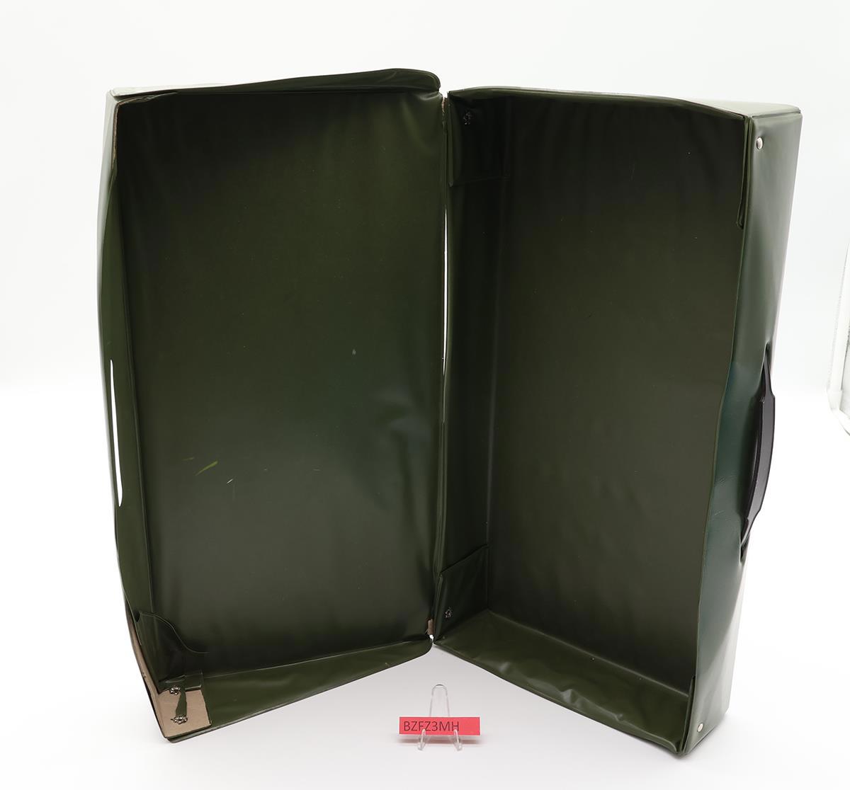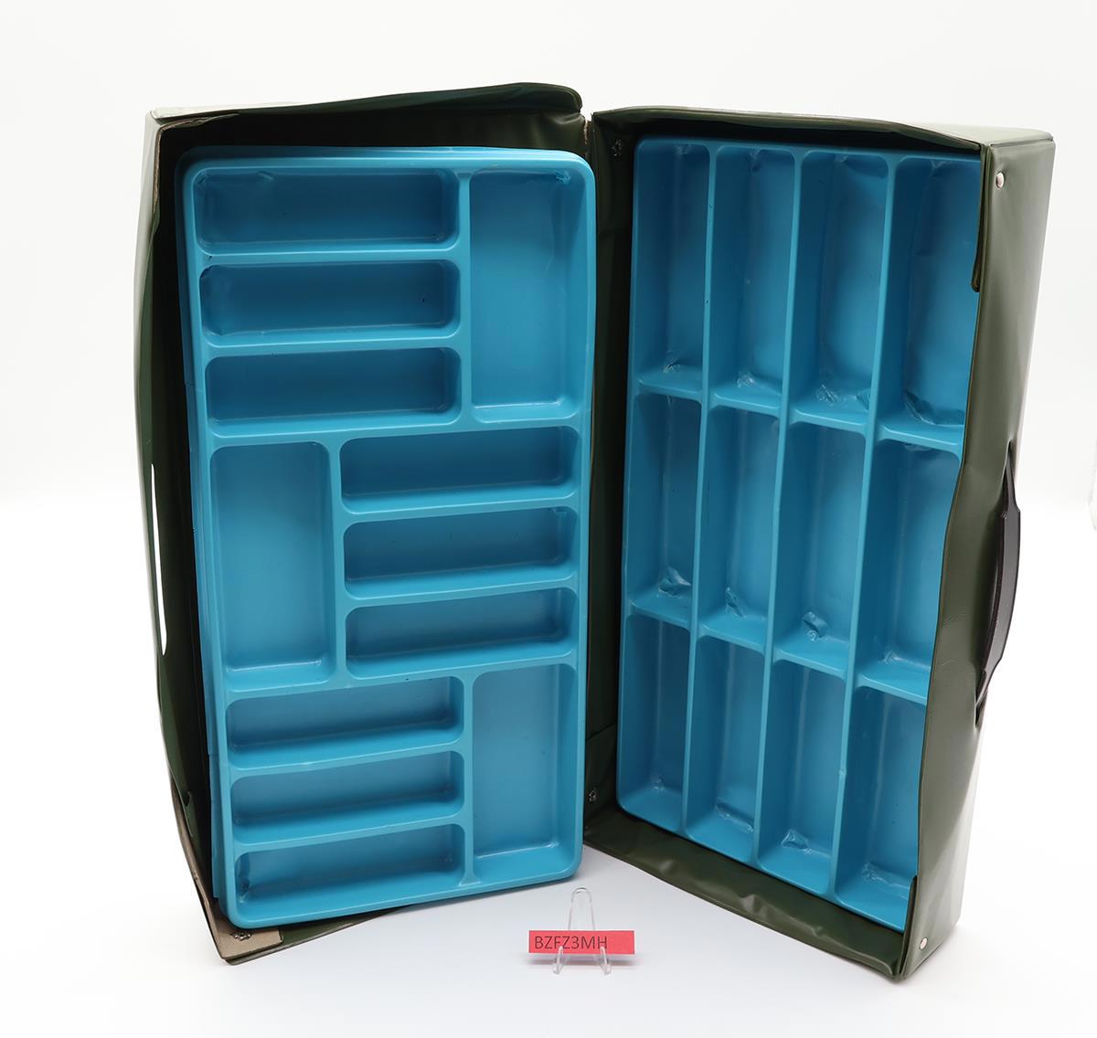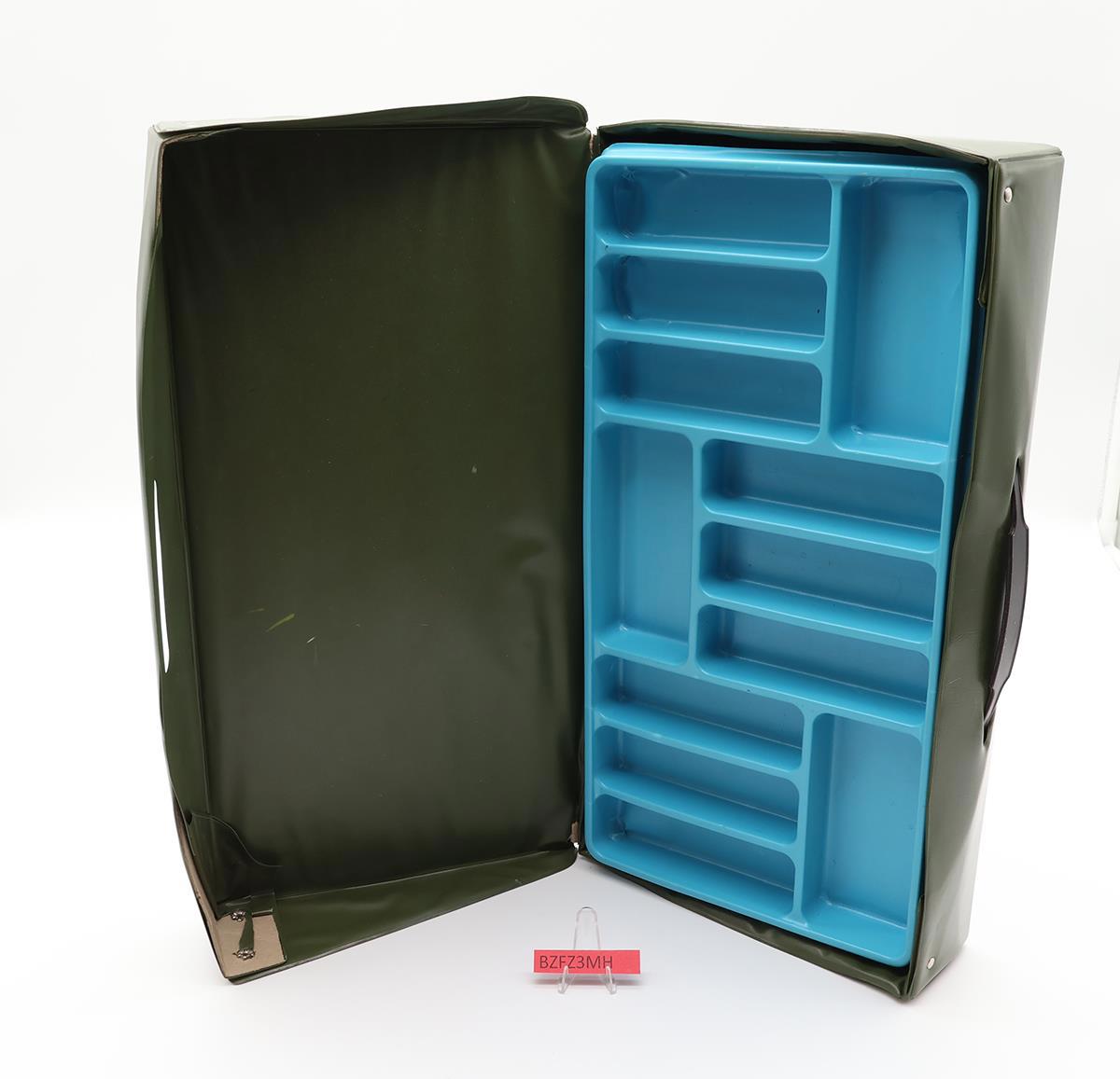 Condition: The item has some wear and needs cleaning. The handle is intact. The lid has tears on both sides. The trays have cracks and dents. Comes as shown.