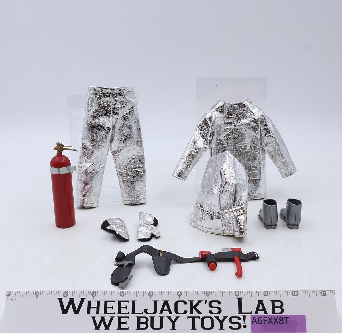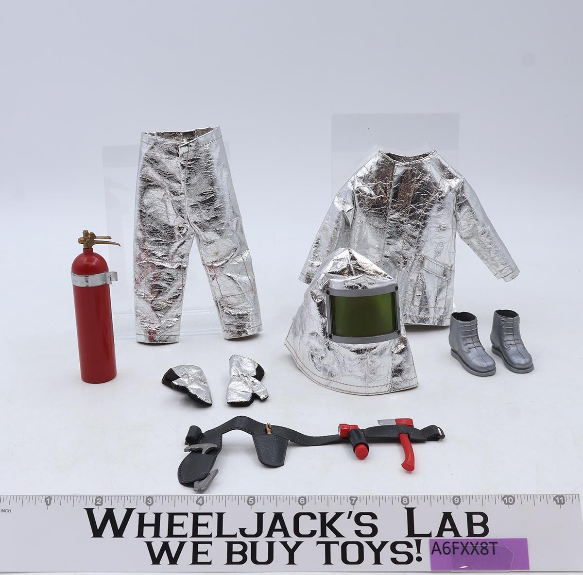 Item Condition: The shield in the helmet is intact, but scuffed. The clothing has little wear. The belt and its tools are intact. The extinguisher is missing the nozzle and hose. Both boots are split along the seam. Comes as shown.