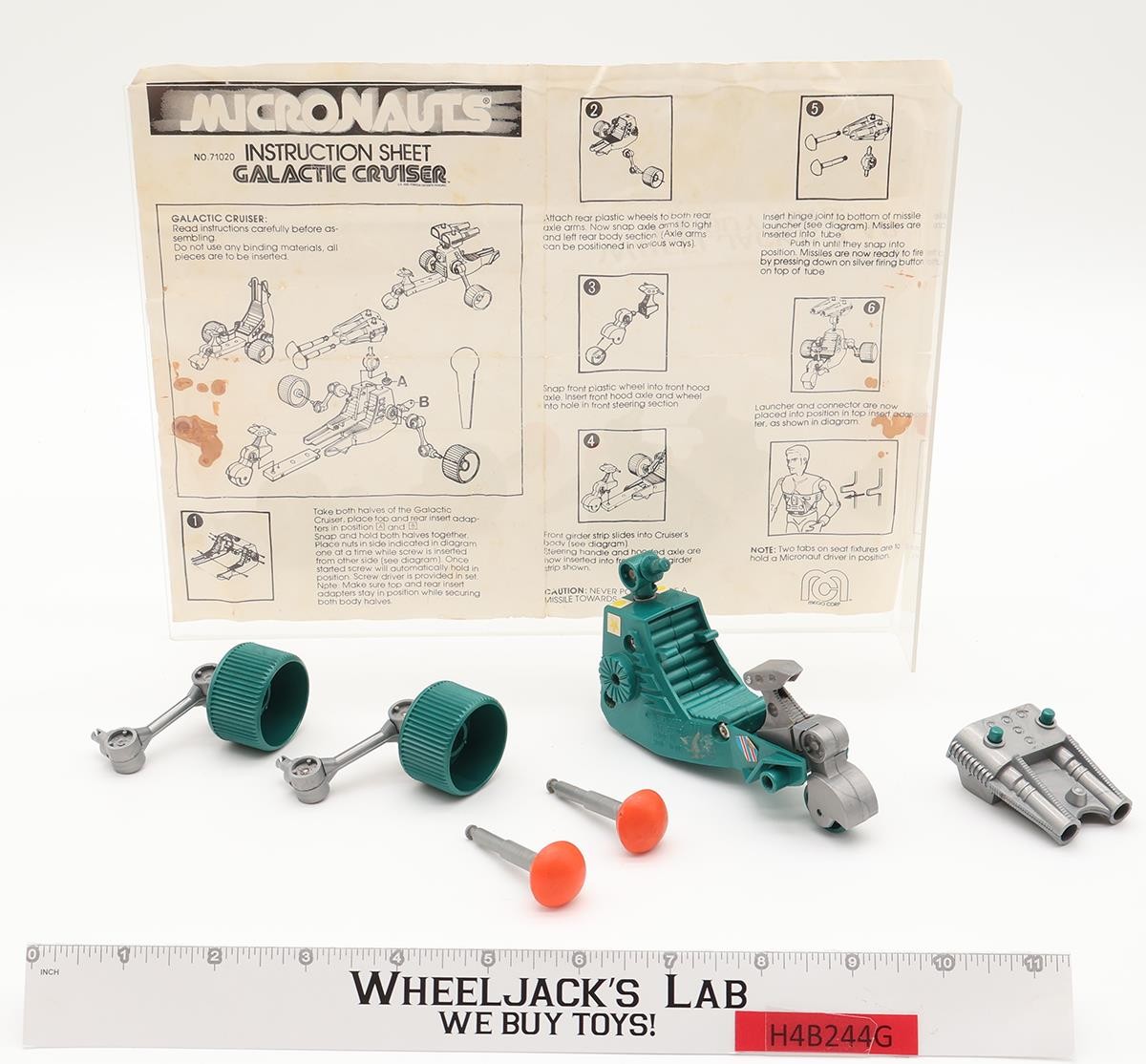 Condition: Rated 80 with some wear. The handlebars are broken off. Only one of the firing mechanisms work. The Micronaut figure is not included. The instruction sheet is included. Our grading scale is 1-100, with mint flawless at 100, near mint at 95, excellent at 90, and so on. Comes as shown.