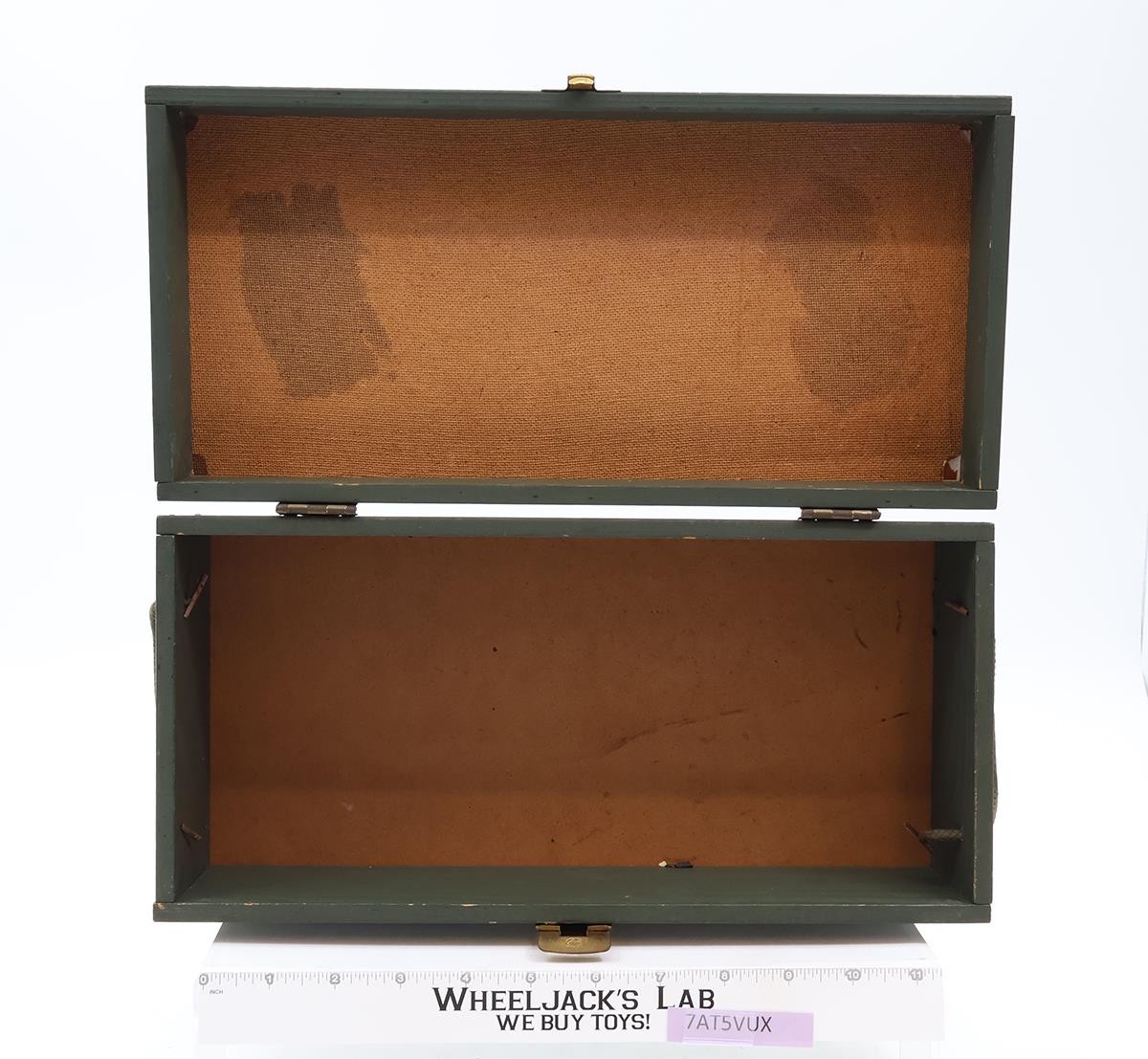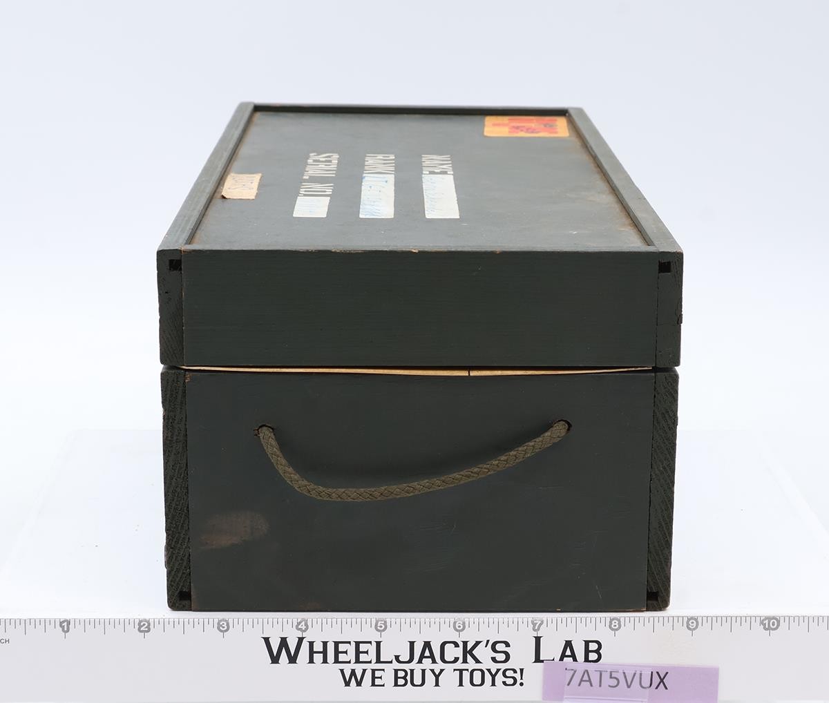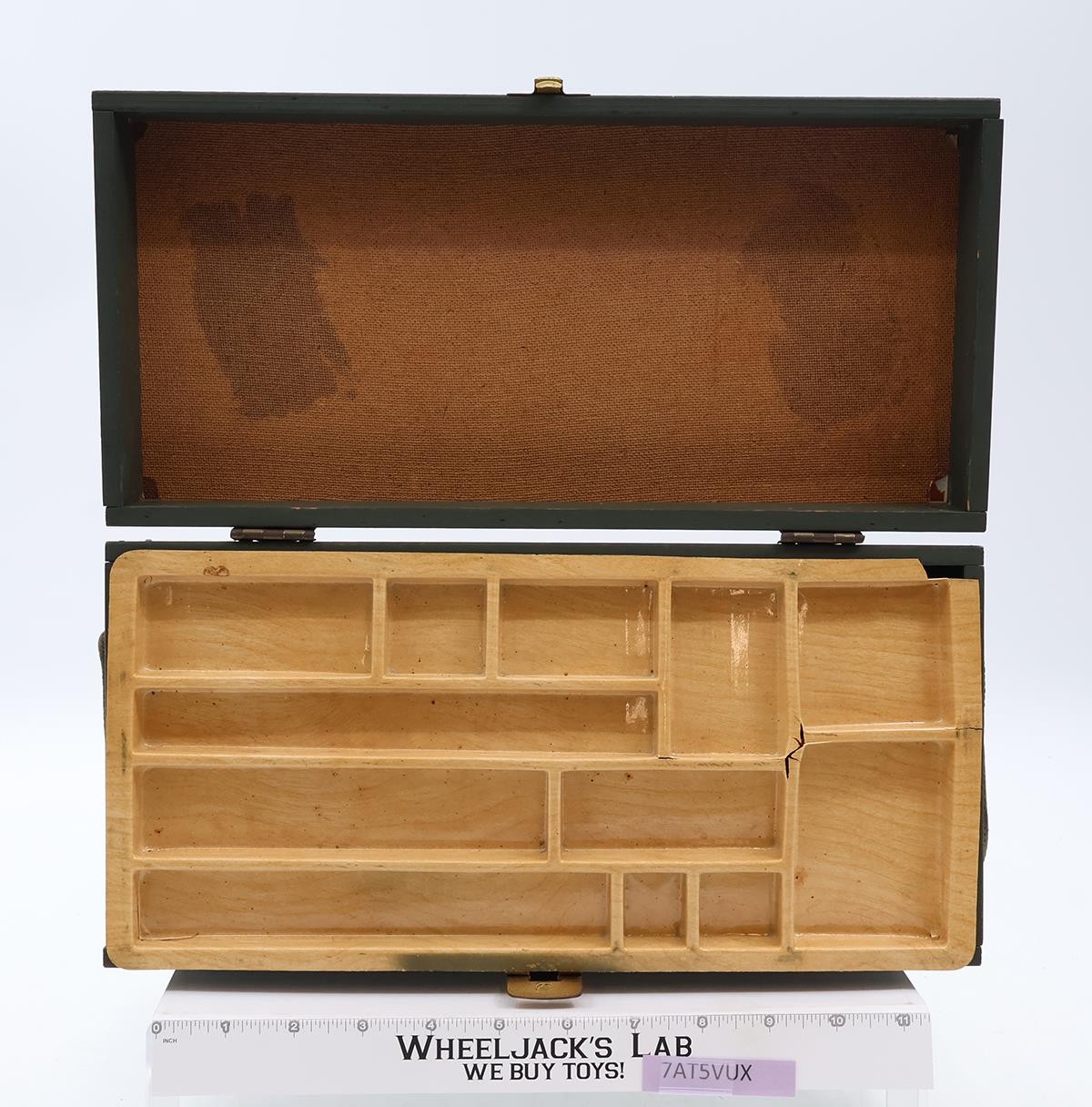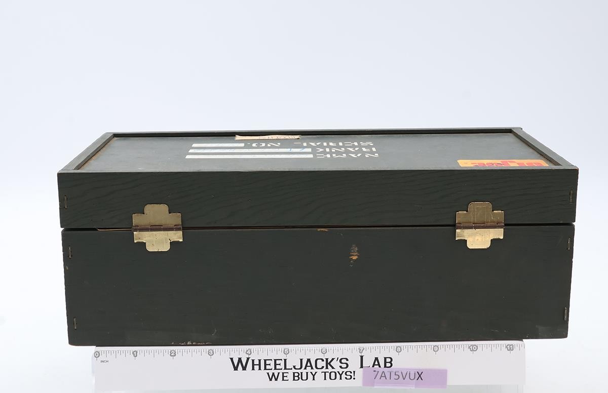 Condition: The item has some wear and may need a light cleaning. Both rope handles and latch are intact. It comes with one tray. The tray is warped with many cracks. The inside sticker is missing. The hinges on the back are in good condition. The sticker on the lid has a stamped image on it. The name, rank, and serial number blanks have been filled in with ink pen. There is also another sticker on the lid. There are a few gouges in the wood on the front and back panels. It comes as shown.