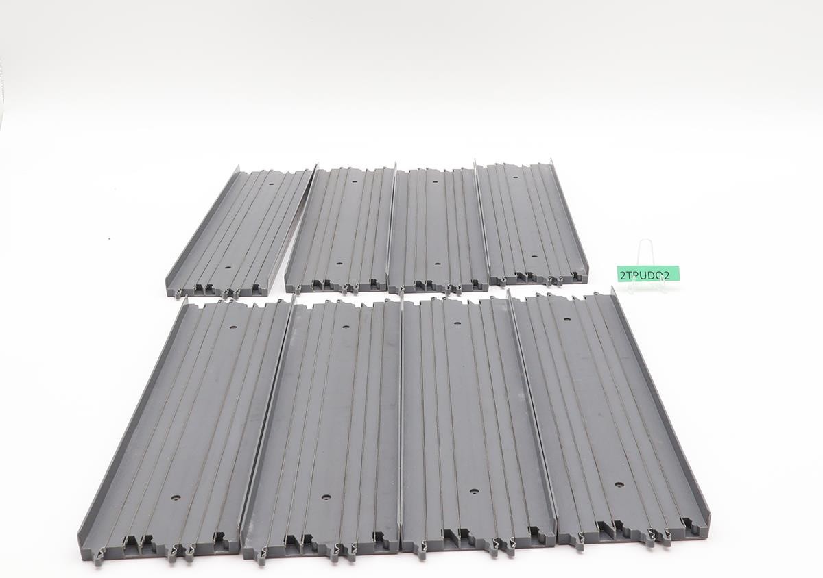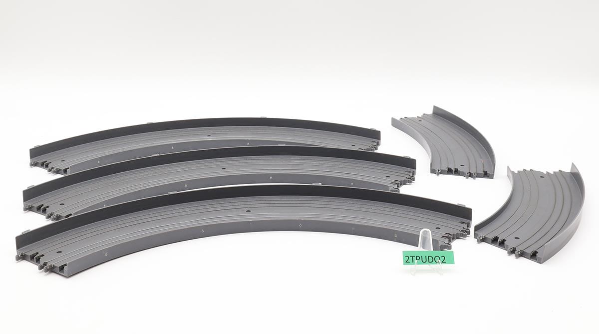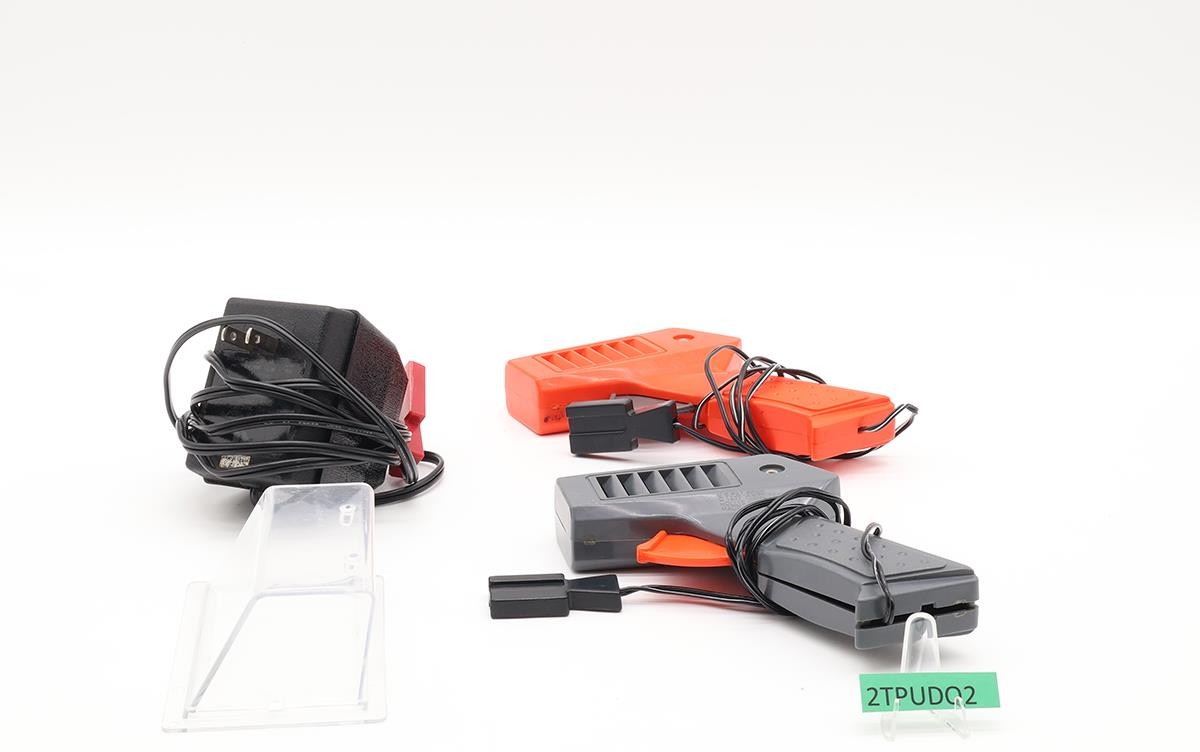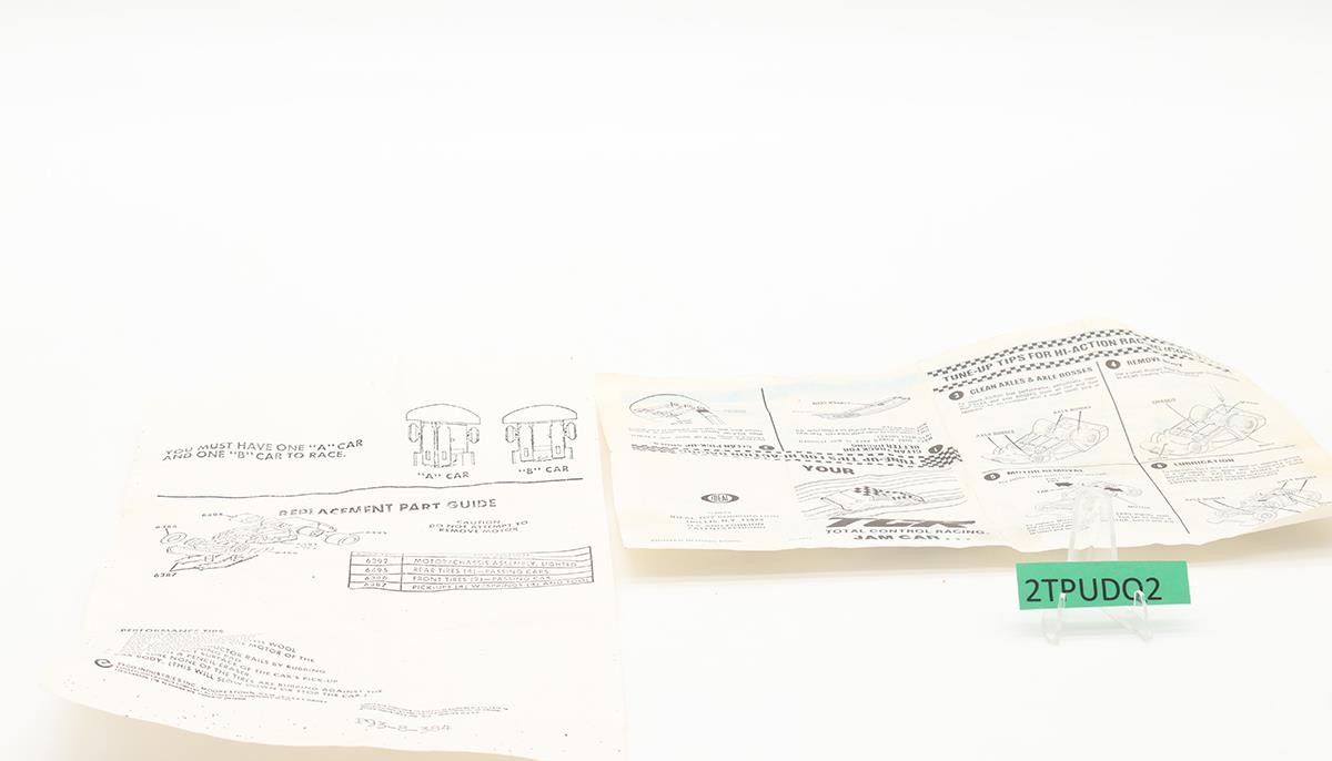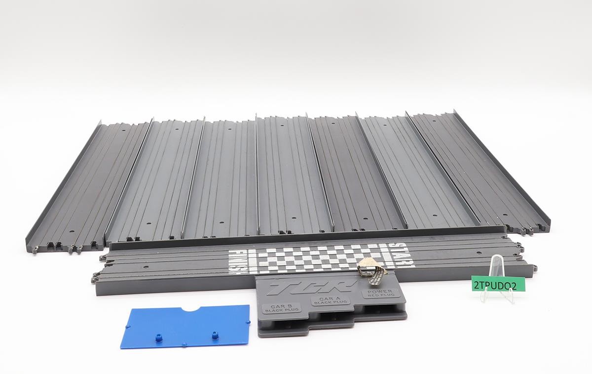 Condition: There are NO vehicles in this set. Included are two controllers (red and gray), a transformer, the start/finish track, 3 large curved tracks, 2 small curved tracks, 8 short straight tracks, 7 long straight tracks, a clear box with a blue lid, and some paperwork. There are no tabs broken. Comes as shown.