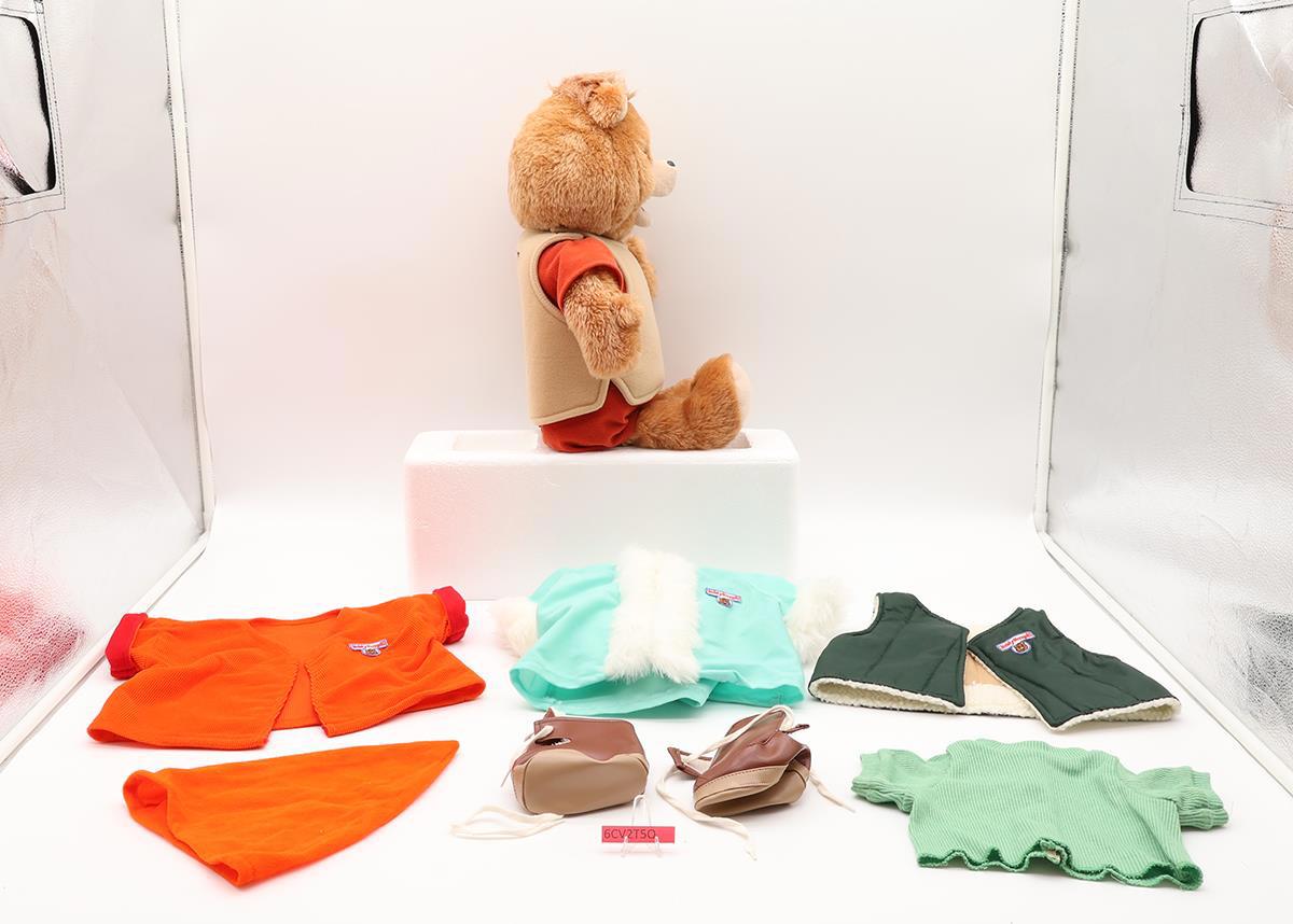 Condition: The bear has little wear. It was tested, and the cassette player works fine. However, the mouth and eyes did not move. Includes seven books, each with its own cassette tape. It also has three additional outfits, as shown. Comes as shown.