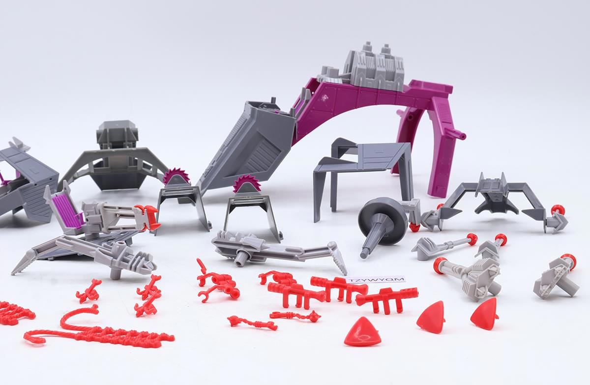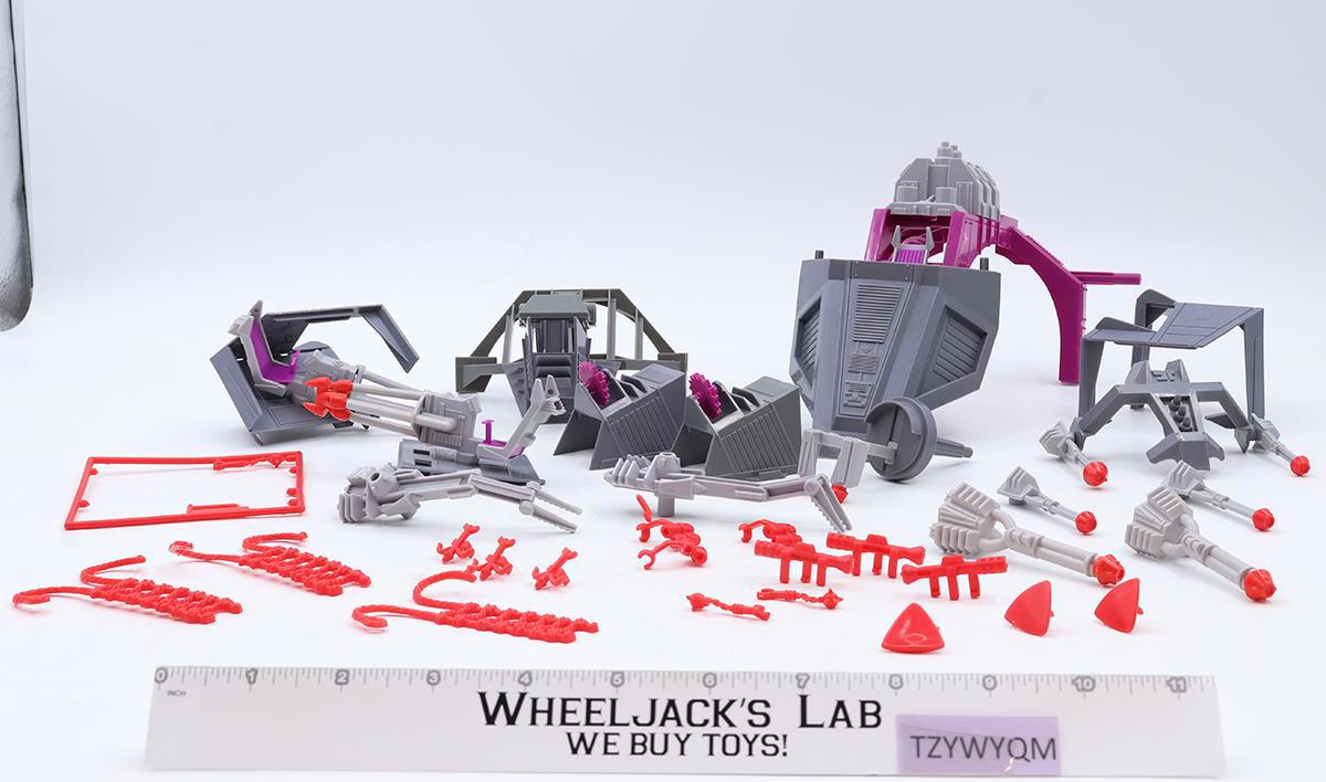 Condition: Rated 85 with light wear. Some pieces may need cleaning. The electronics do not work, but the battery compartment is cleaning. There are two broken tabs on the large purple armor on either side of the chair where the side guns plug in- these two areas also have glue residue. The tread on one wheel is cracked and missing a piece. Various pieces have stress marks. Our grading scale is 1-100, with mint flawless at 100, near mint at 95, excellent at 90, and so on. Comes as shown.