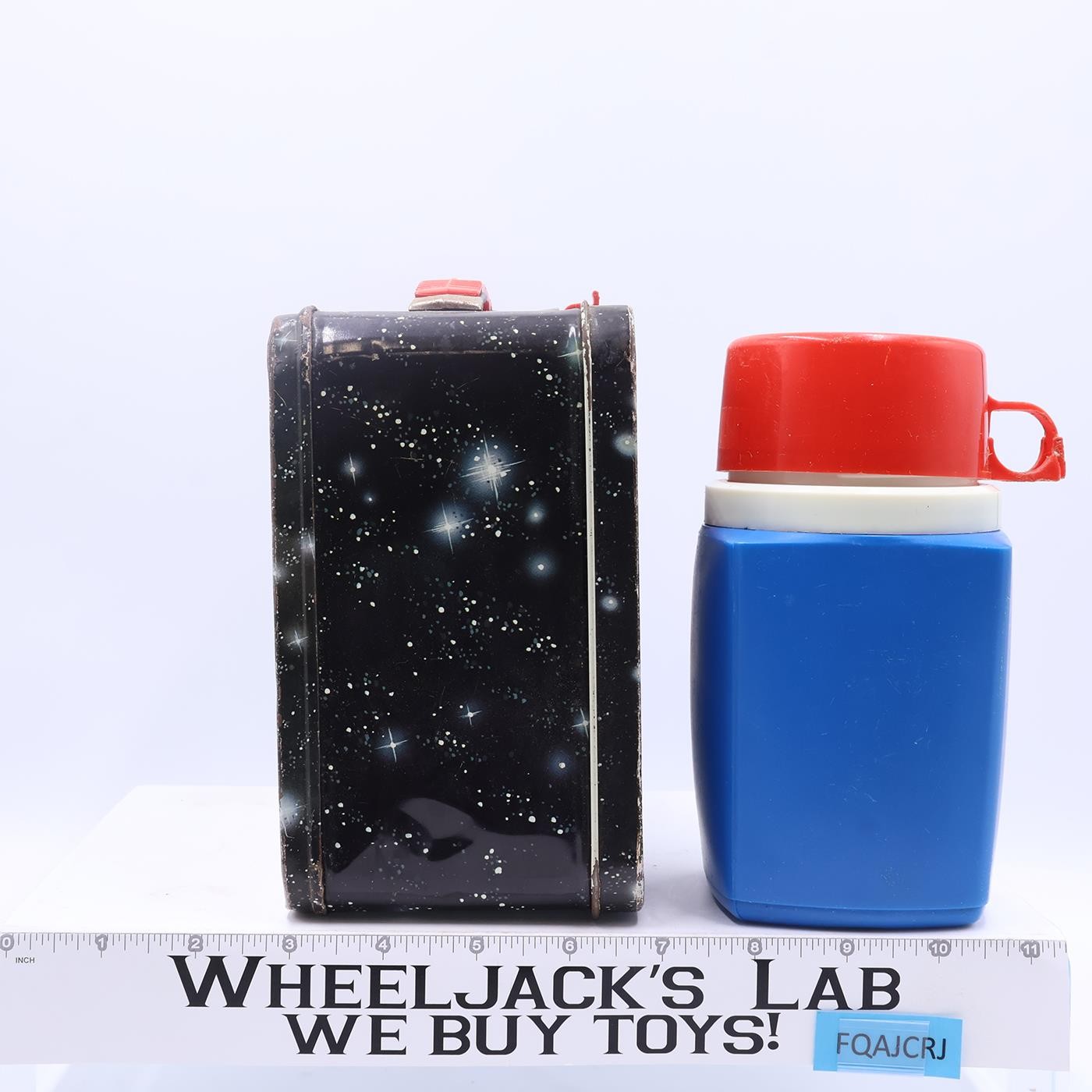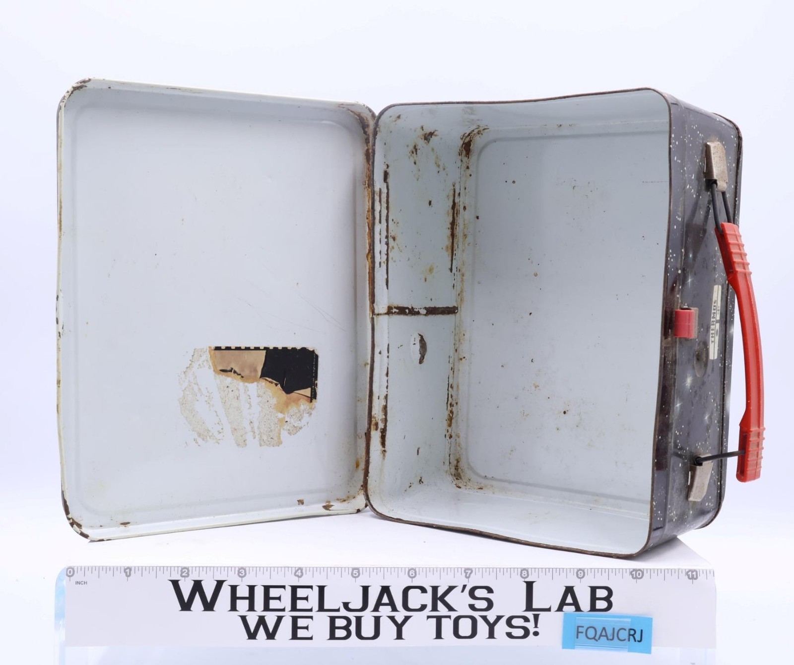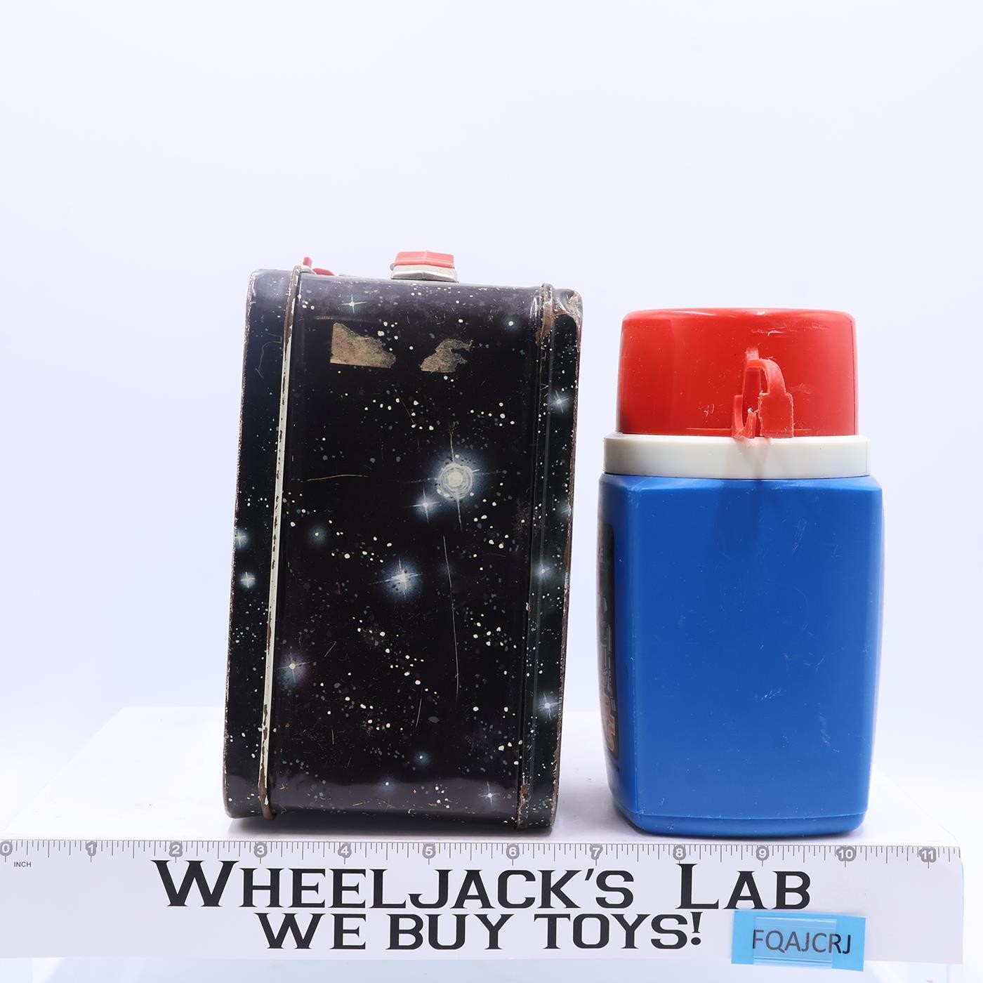 Condition: The lunchbox is made of metal and has some wear, mainly around the edges. There is rust on both the inside and outside. The handle and latch are intact and work. There is a dent in one of the upper corners on the bottom. The thermos is complete and needs cleaning.. It has some wear. The image on the front has some wear. The handle of the cup is broken. It comes as shown.