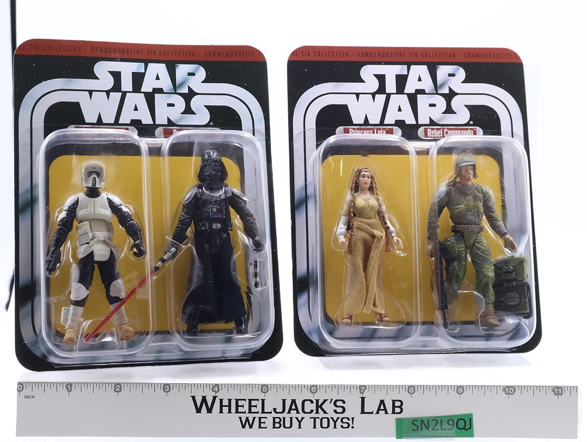 Condition: The box has been opened, and the original carboard is gone; however, the figures are mint in their bubbles. The tin has light wear. Comes as shown.