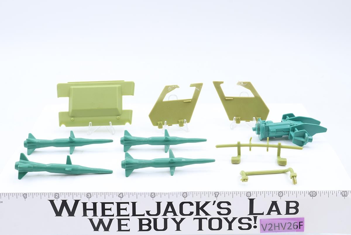 Condition: The item has some wear and needs cleaning. The following are things that are broken: One of the missiles has a broken tab from the missile pod broken off inside the peg hole, the missile pod has a broken tab where one of the missiles attaches, both doors are broken and have glue residue, the rear bar is broken, and the front bumper has a piece broken on the right side. The frame is glued along the hood and where the bars connect at the top. Comes as shown.