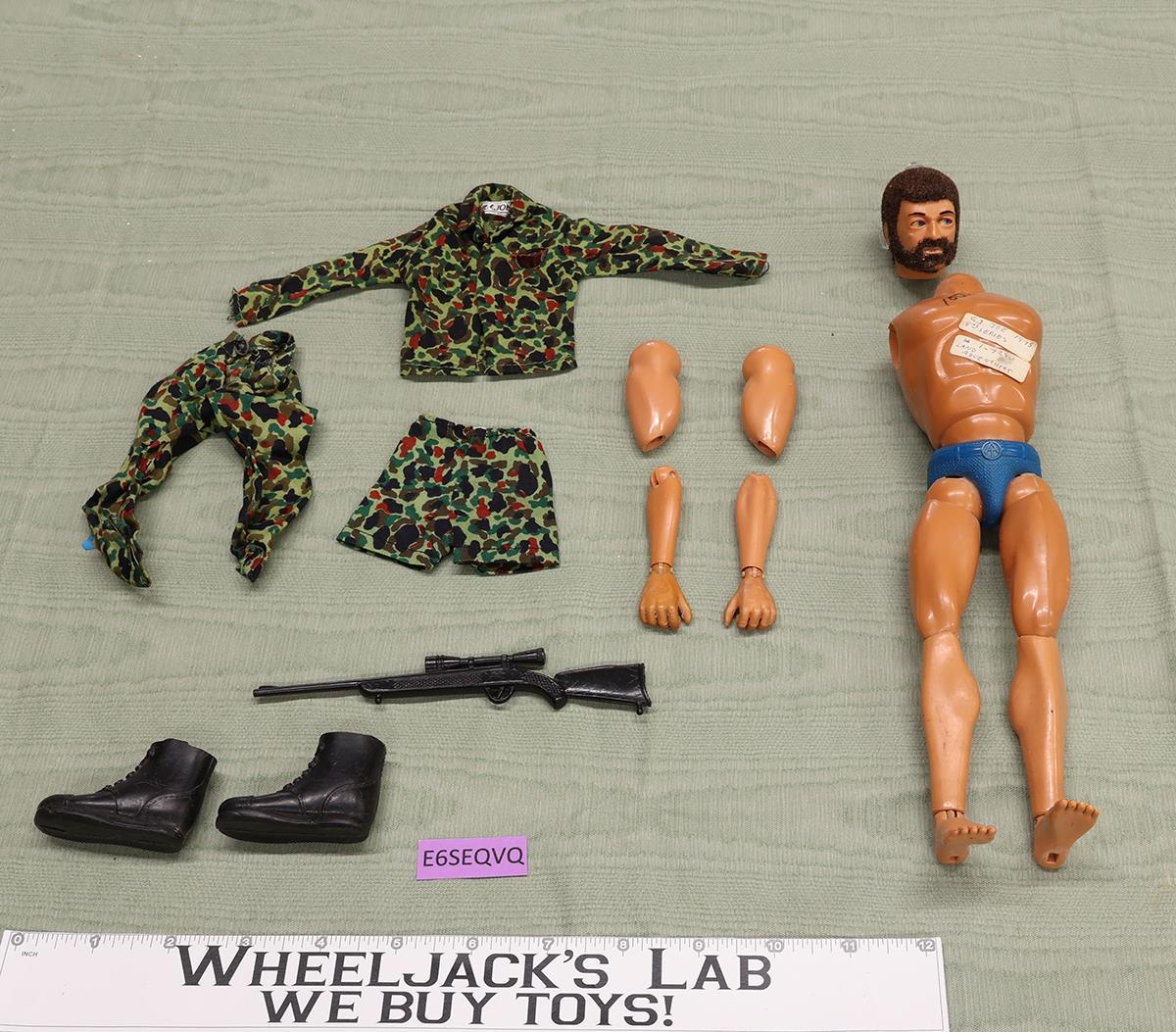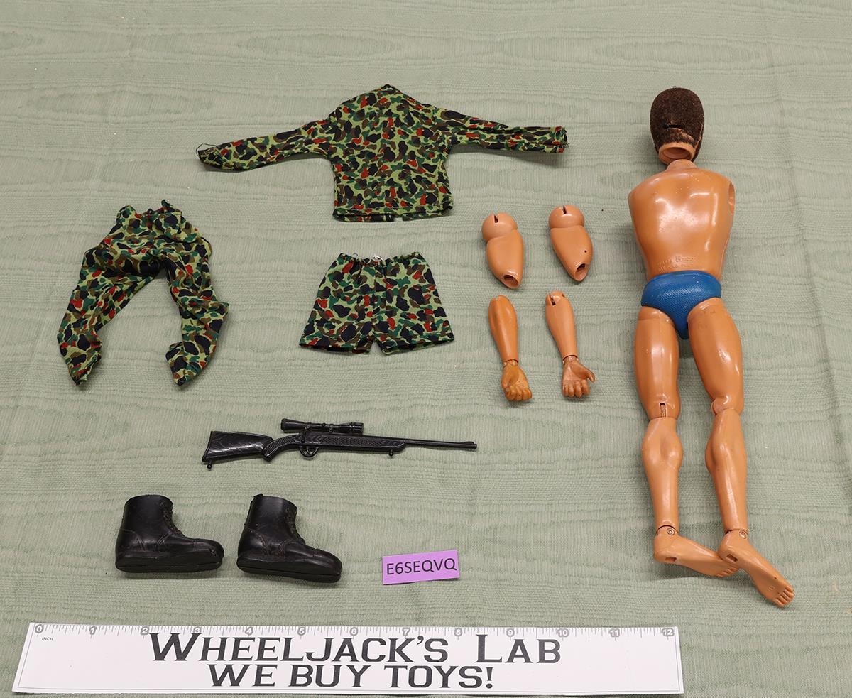 Condition: This figure is the life-like Man of Action from 1975 with Kung Fu hands. The flocked head with beard features eagle eyes that can be moved by a small lever on the back of the head. The figure shows some wear, with both arms separated from the torso. The flocked hair and beard are in good condition, having only a small area on his chin that is balding. The white part of the eyes are yellowing. It comes as shown.