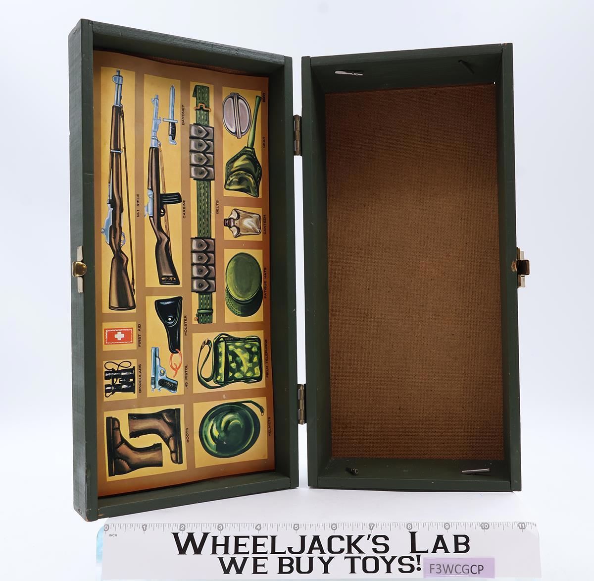 Condition: The item has some heavy wear with one edge on the bottom broken off. The rope handles are intact. The latch buckle and hinges are intact. The name, rank, and serial number on the top of the case have not been filled in--they are pristine. The GI Joe sticker on the top has been torn. The plastic tray is missing. The insert in the lid is in good condition. Comes as shown.