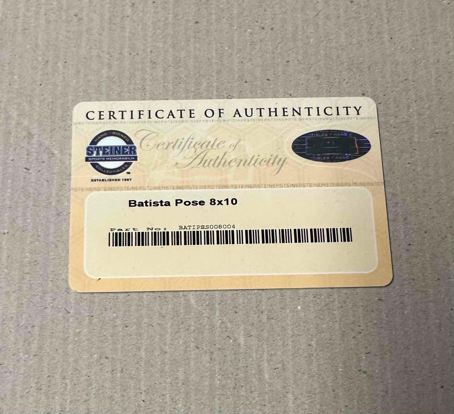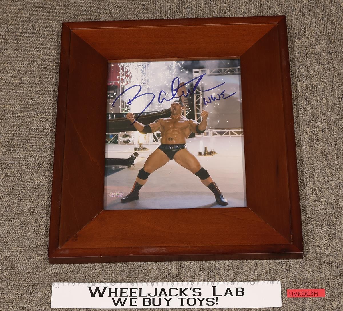 Condition: The picture has light wear. It has been autographed by Dave Bautista (Batista). Includes a certificate of authenticity. The frame measures approximately 15 inches x 13 inches. Comes as shown.