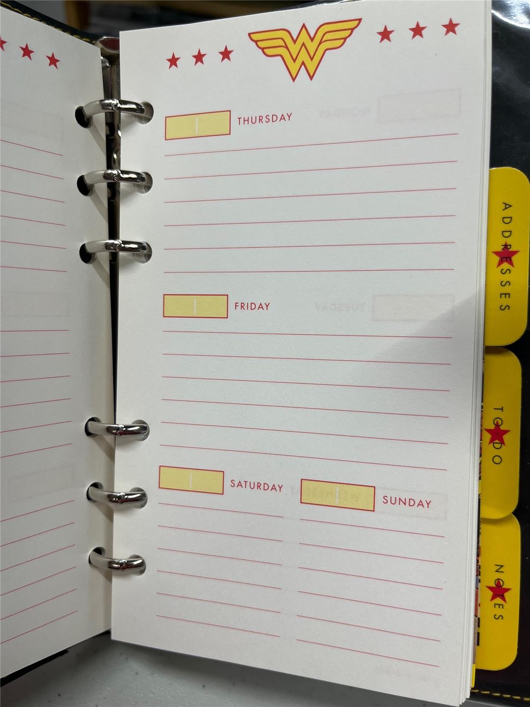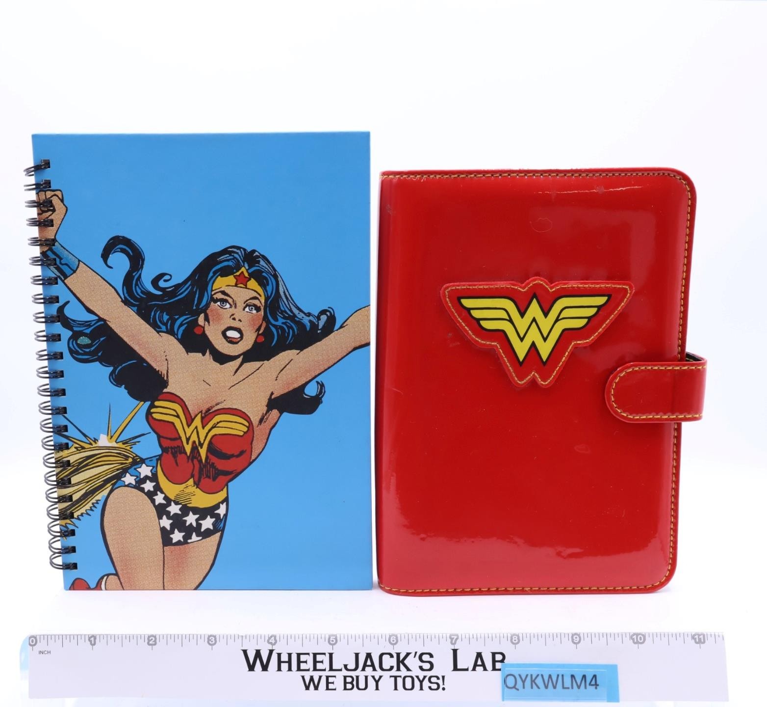 Condition: Organizer and journal are both new and unused in near mint condition. Organizer cover is a padded vinyl. strap has a mark on strap and around the closure (see photo). Has page with calendars for 2003-2008; the daily pages are undated so can be used for any year. Journal has lined pages with assorted Wonder Woman images in red on some of the pages. Interior covers lined with comic strip paper. Comes as shown.