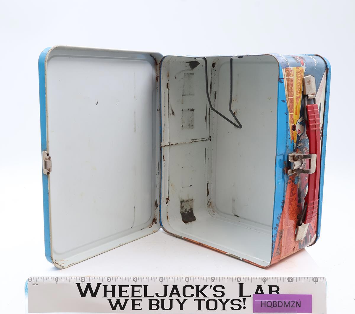 Condition: The lunchbox is made of metal and features a race car on the front and a racing game board on the back. Does not include original game pieces, but any magnetic pieces and a die could be substituted for game play. It has some wear with scratches and dents. Light rust on outside and inside. Handle and latch are intact and working. Thermos clip is intact, but thermos is not included. Great display piece for a racecar or vintage game fan. Also a great portable game for car travels! Comes as shown.