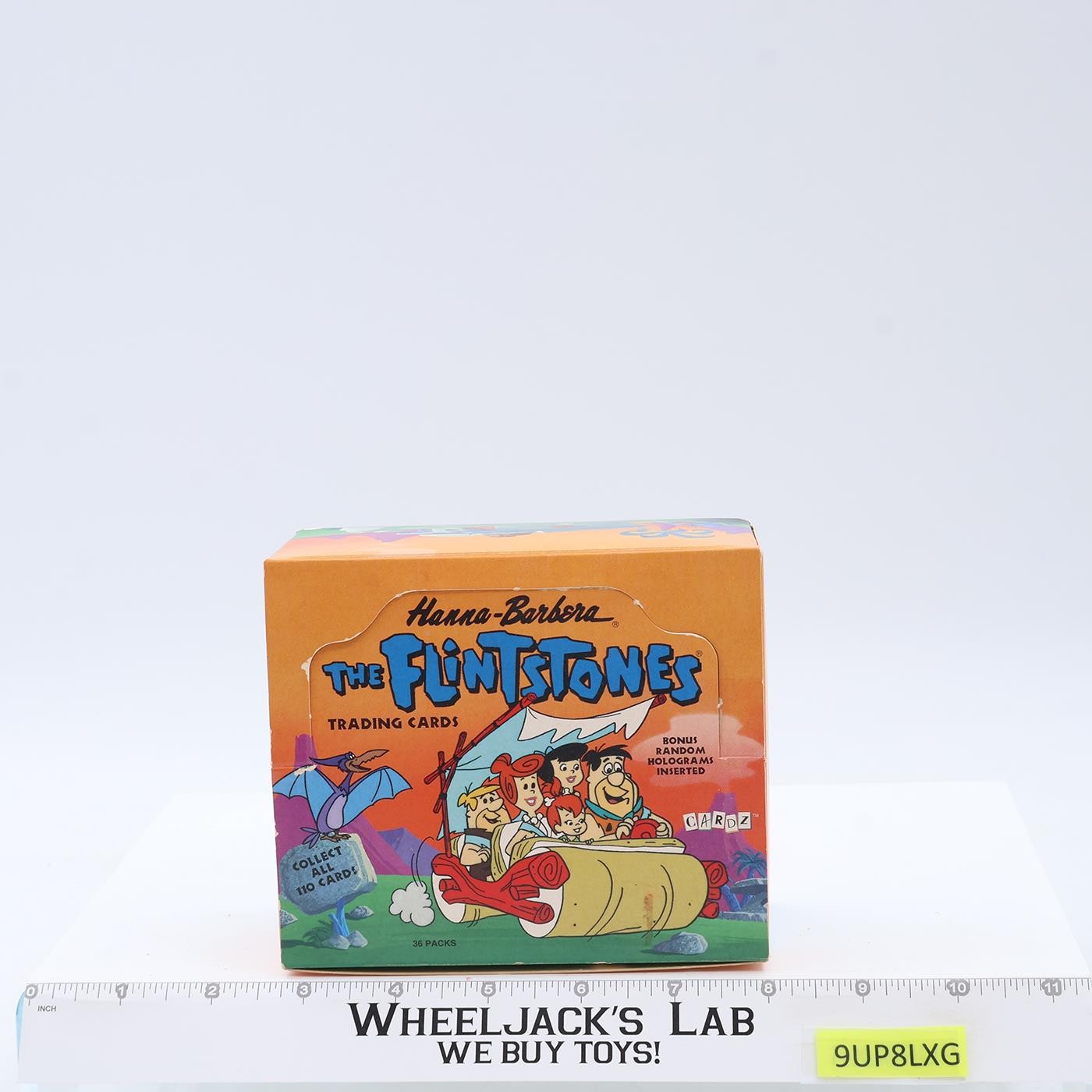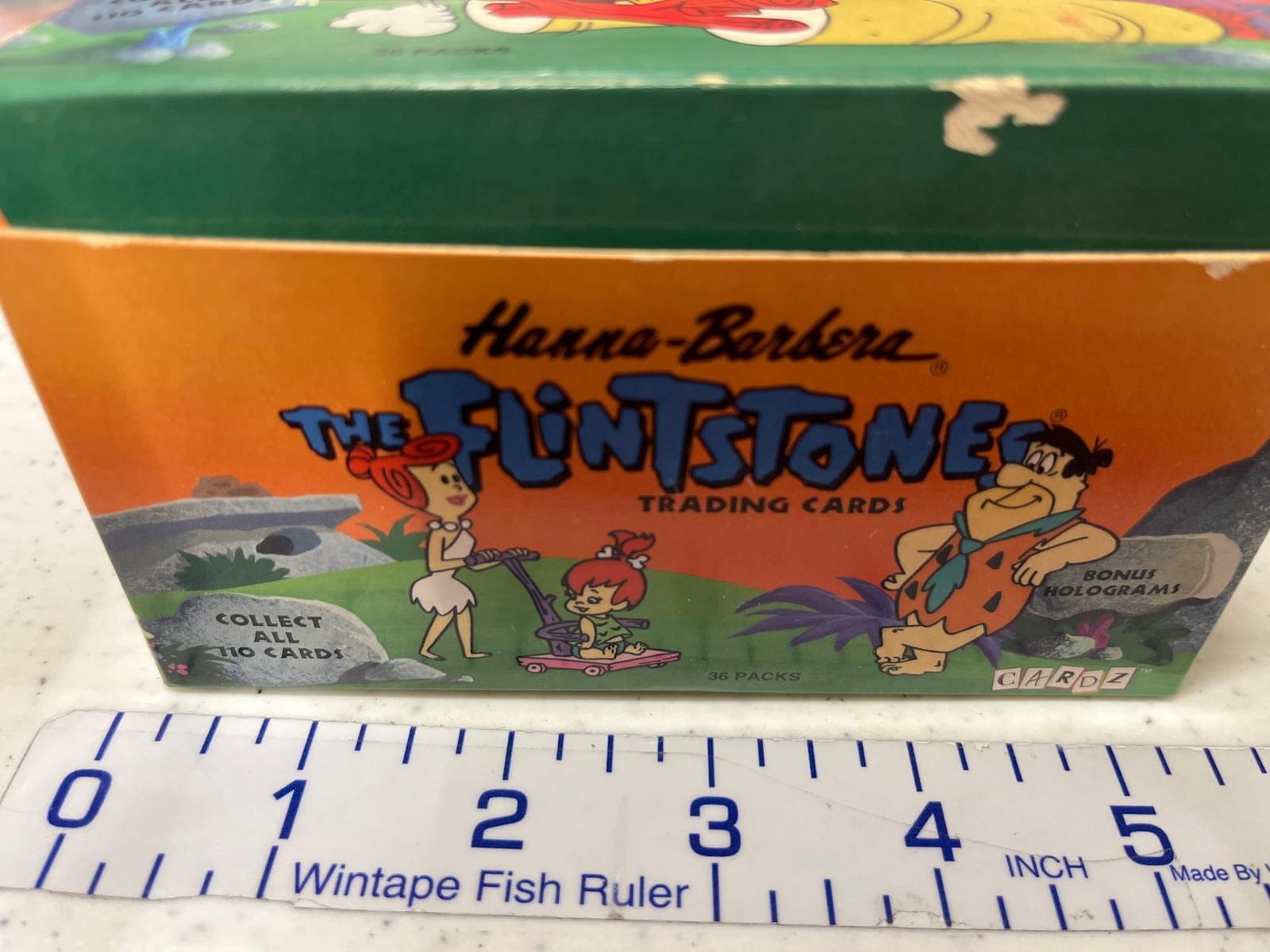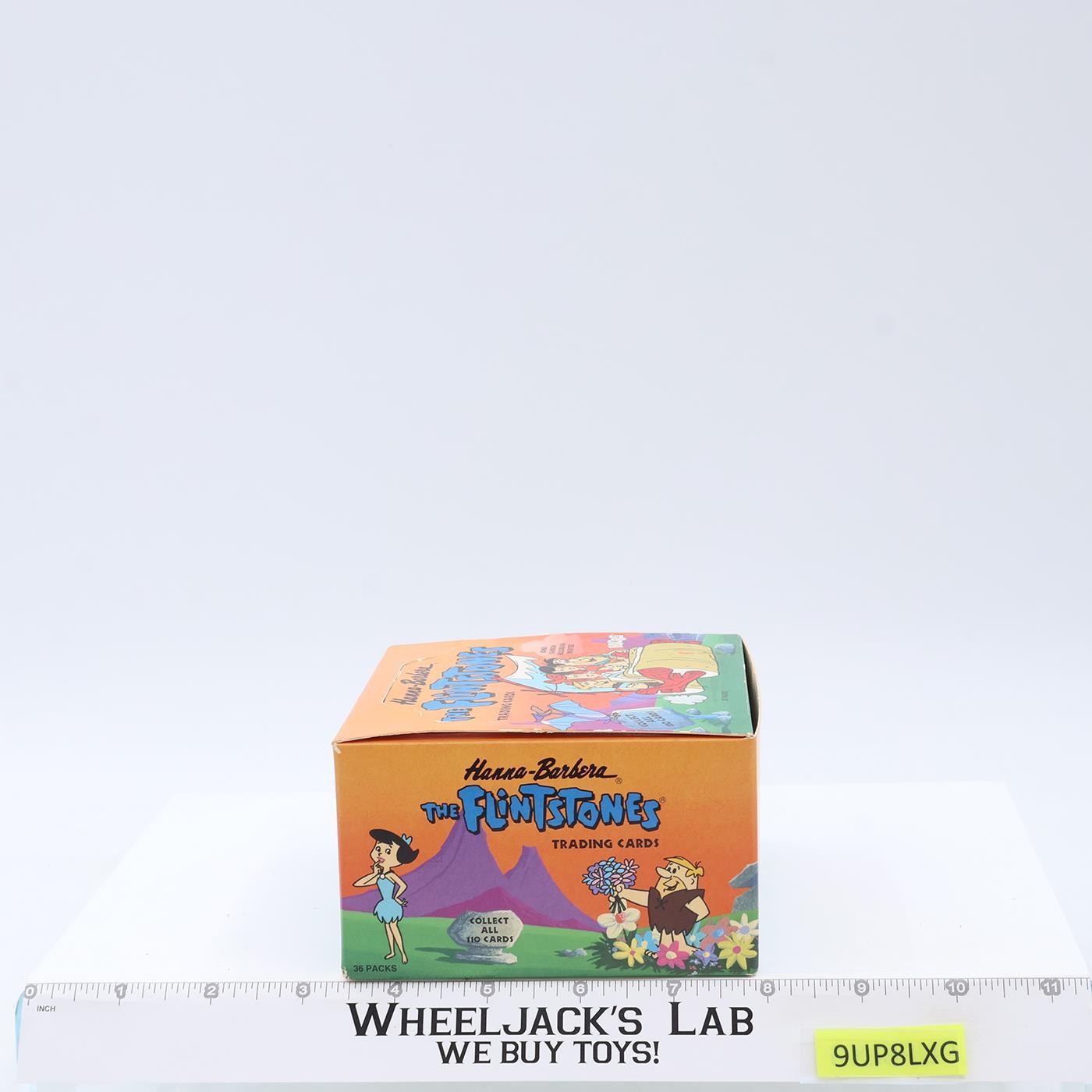 Condition: This listing is for one EMPTY display box for Hanna-Barbera Flintstones Trading Cards by Cardz. It held 36 packs. No trading cards included. Box has light wear with a couple scuffed spots (one is shown in last photo). Top was never folded as a display. Small spot on the front wheel of Fred's car. Nice piece of animation history featuring the cast of the Flintstones: Fred, Wilma & Pebbles; Barney, Betty, & Bamm-Bamm, Dino & Hoppy. Box measures 5.25" x 4.5" x 2.5." Comes as shown.