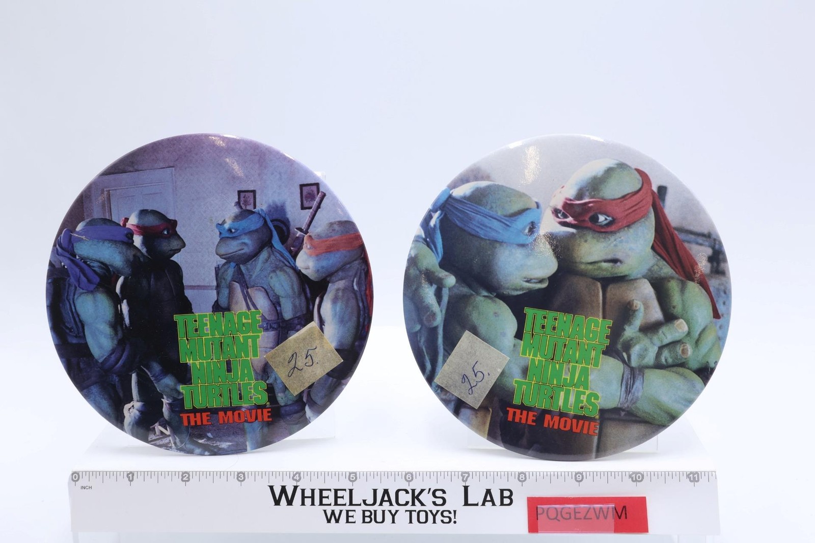 Condition: These are 2 Teenage Mutant Ninja Turtles The Movie buttons/pins. One of the pins on the back of the button is bent, but it still works. The pins are in good condition. There is a piece of masking tape on both that has '25' written on it. The pictures will show its condition. Comes as shown.