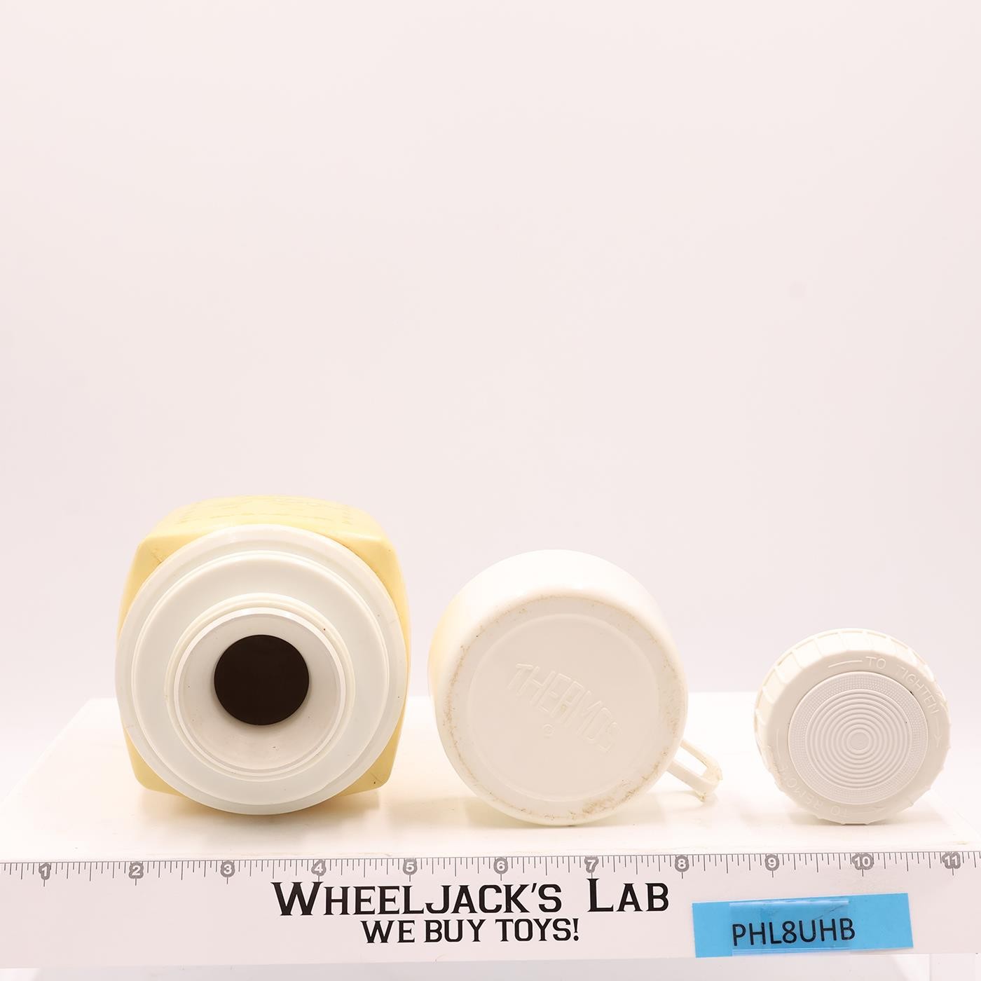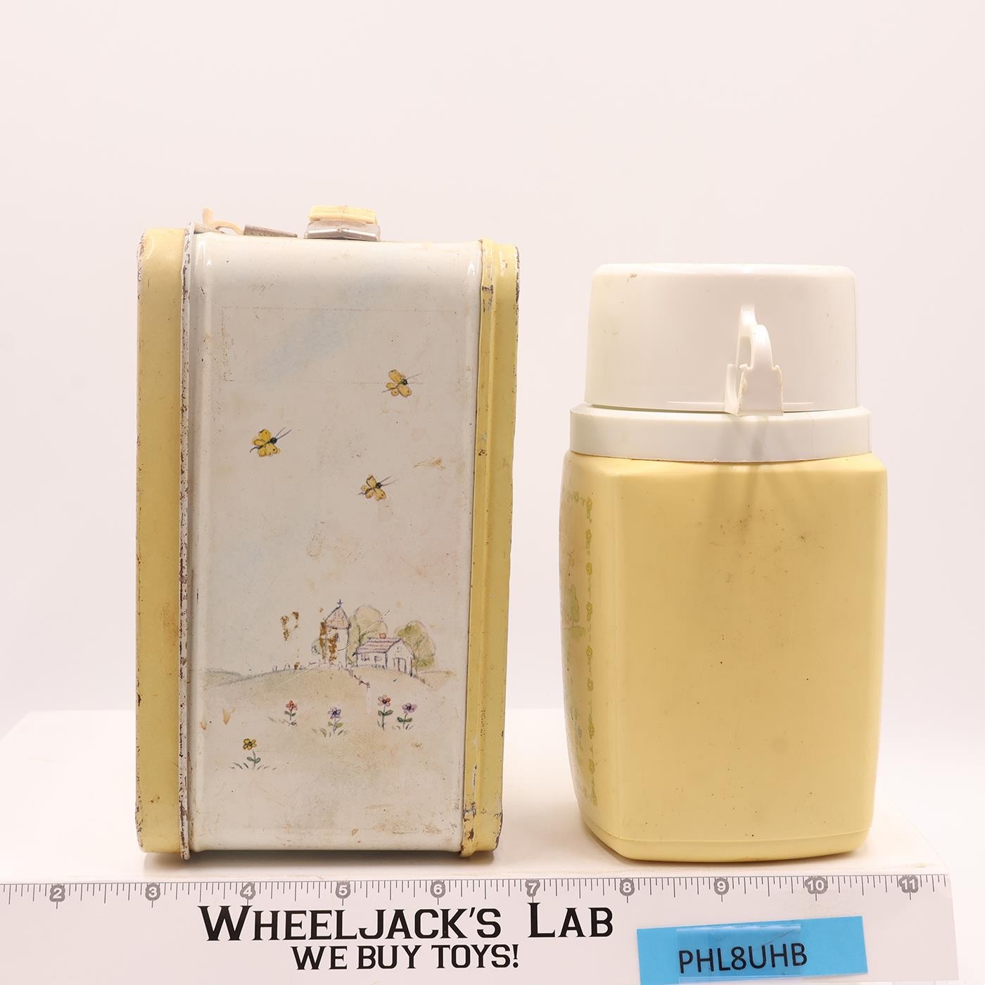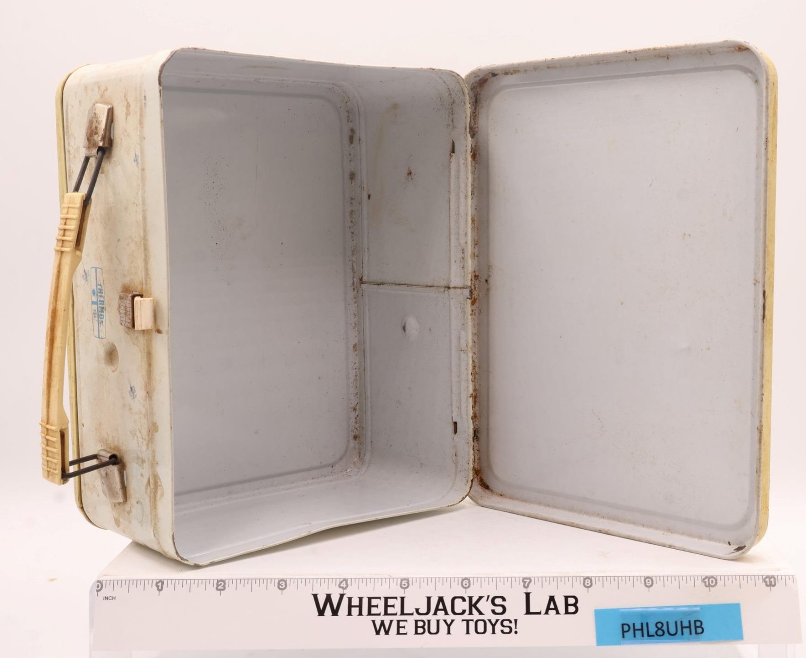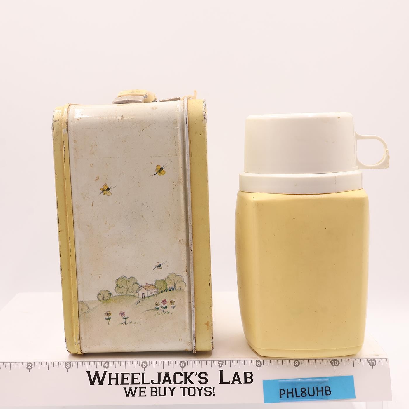 Condition: The lunchbox is made of metal and needs to be cleaned. It has some wear with rust on both the inside and outside. The handle and fastener are still intact. The thermos is included and is complete. It has some wear, too. The pictures will show the item's condition. It comes as shown.