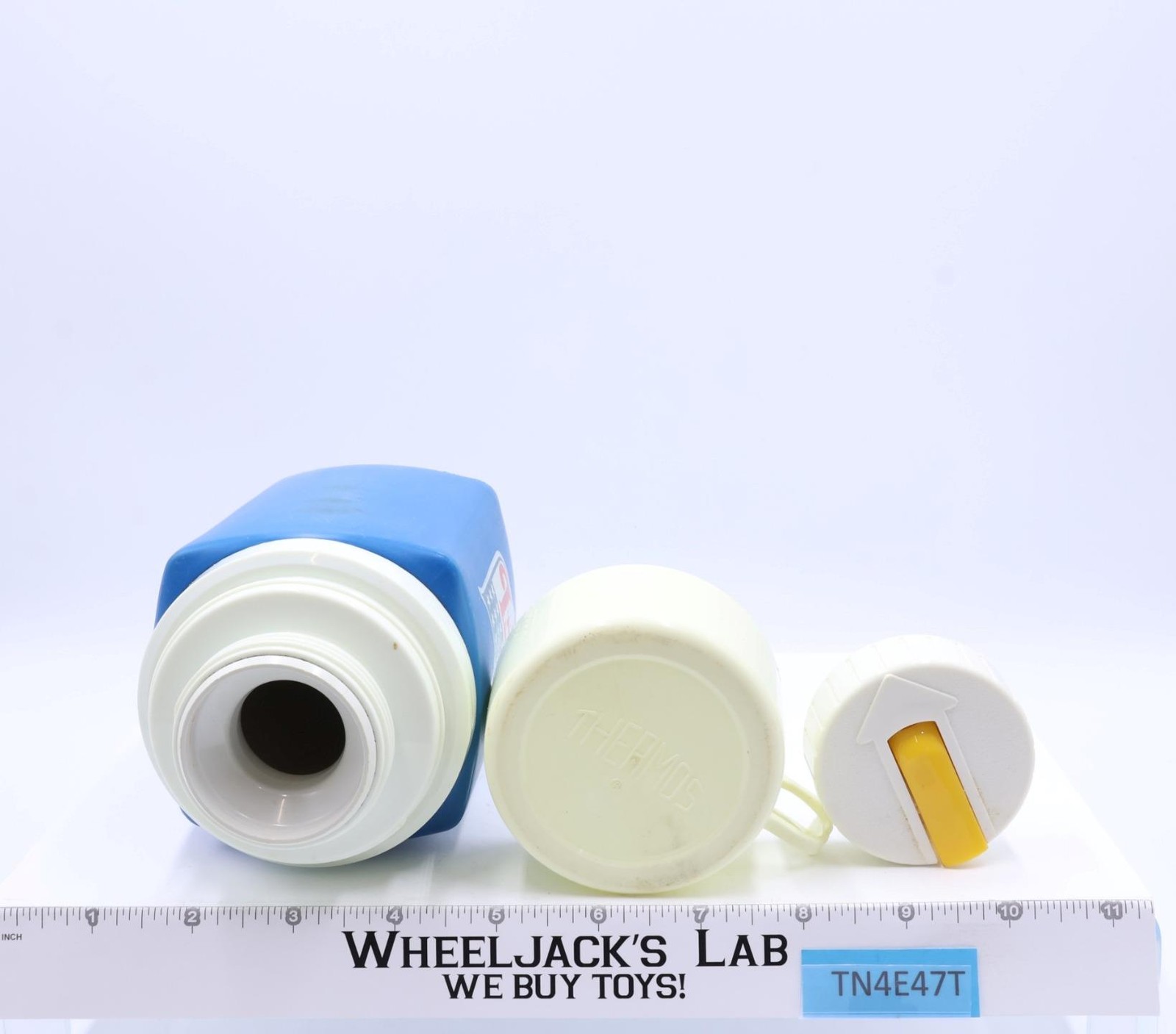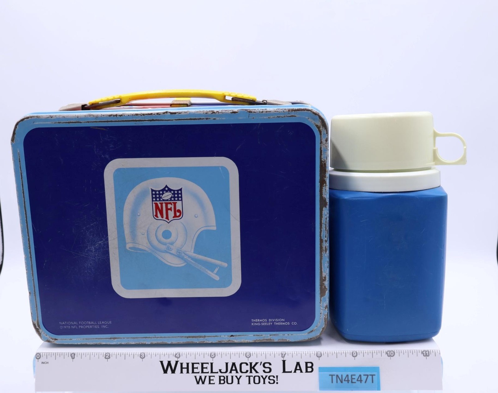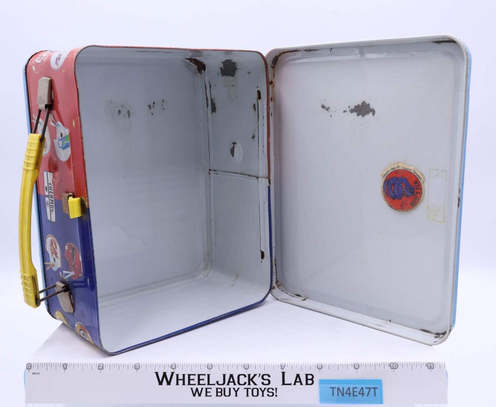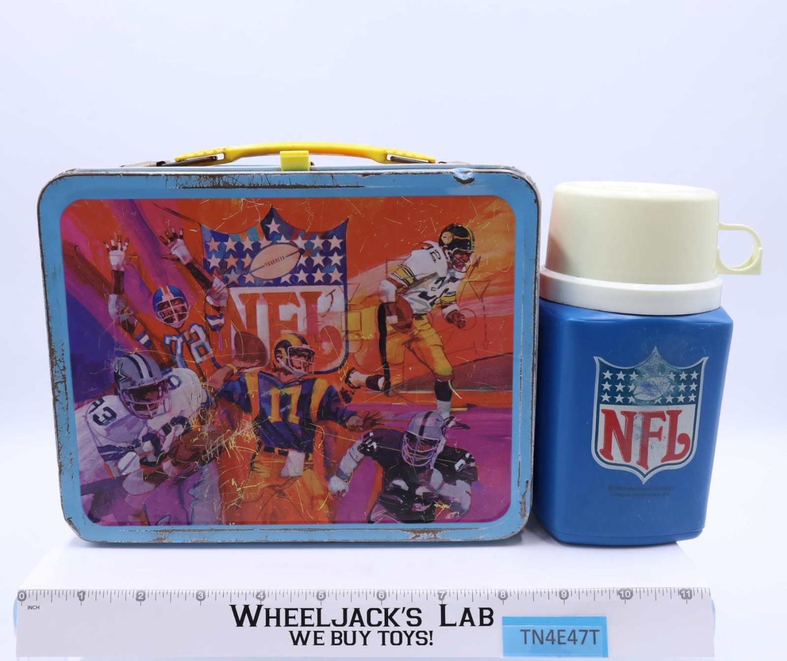 Condition: The lunchbox is made of metal and has some wear. It needs to be cleaned. There is rust on both the inside and outside of the box. The handle and latch are intact and work, but there is rust on some of the metal parts. The lid looks slightly bent in, but it still closes. There are a couple of small dents on the top of the lunchbox. The thermos is included and is complete. The graphic on the front has some wear. There is a yellow sticker on the cap. Comes as shown.