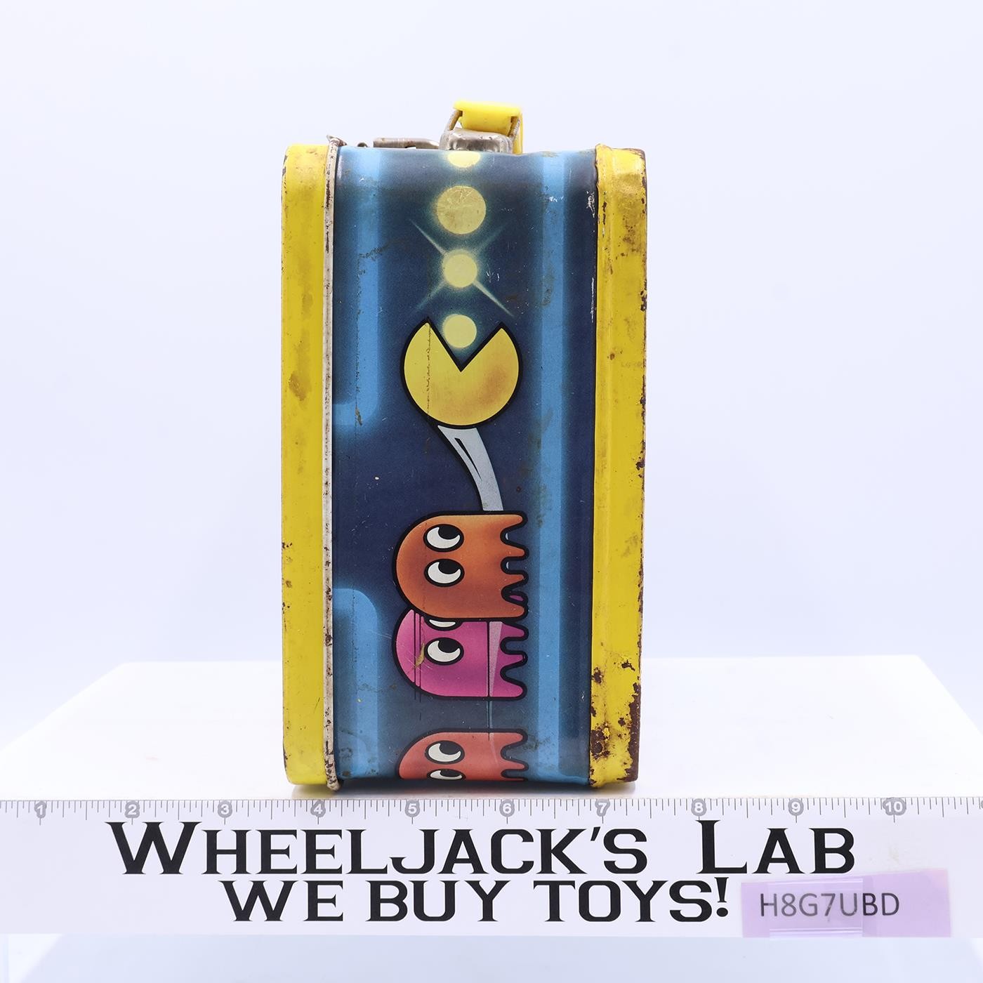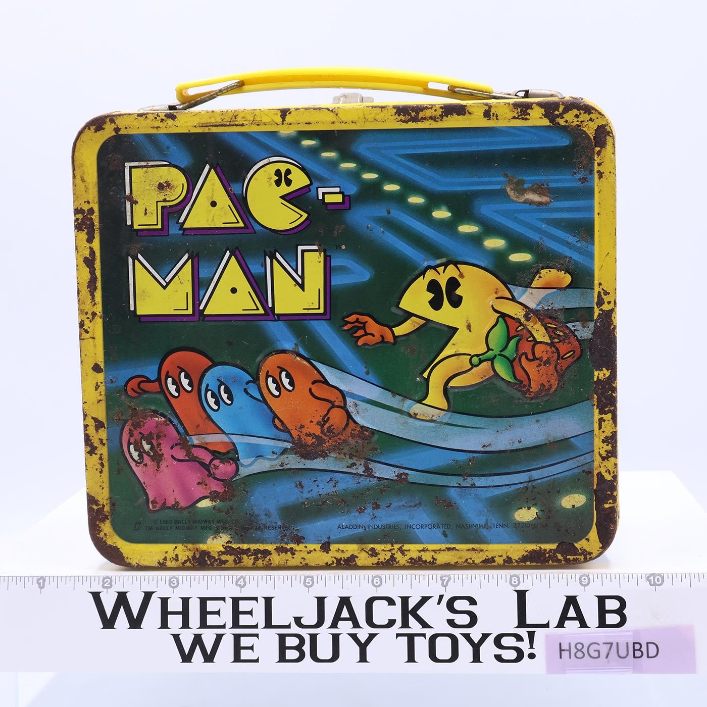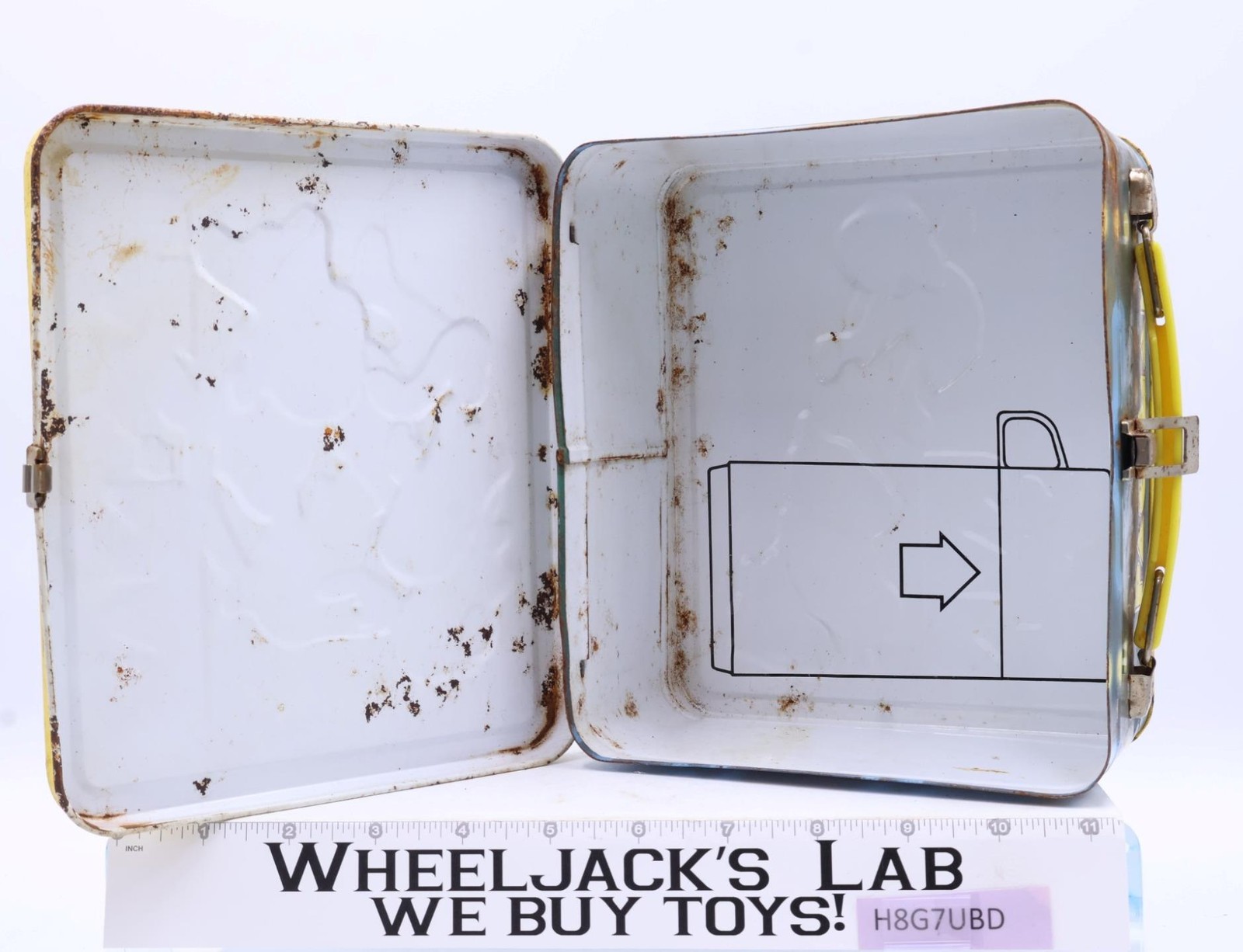 Condition: The lunchbox is made of metal. It has heavy wear with scuffing, scratches, and residue from tape on front and bottom. Box has rusted where scratched. The handle and latch are intact; metal parts have rust. DOES NOT include thermos. Interior of box has moderate rust. Comes as shown.