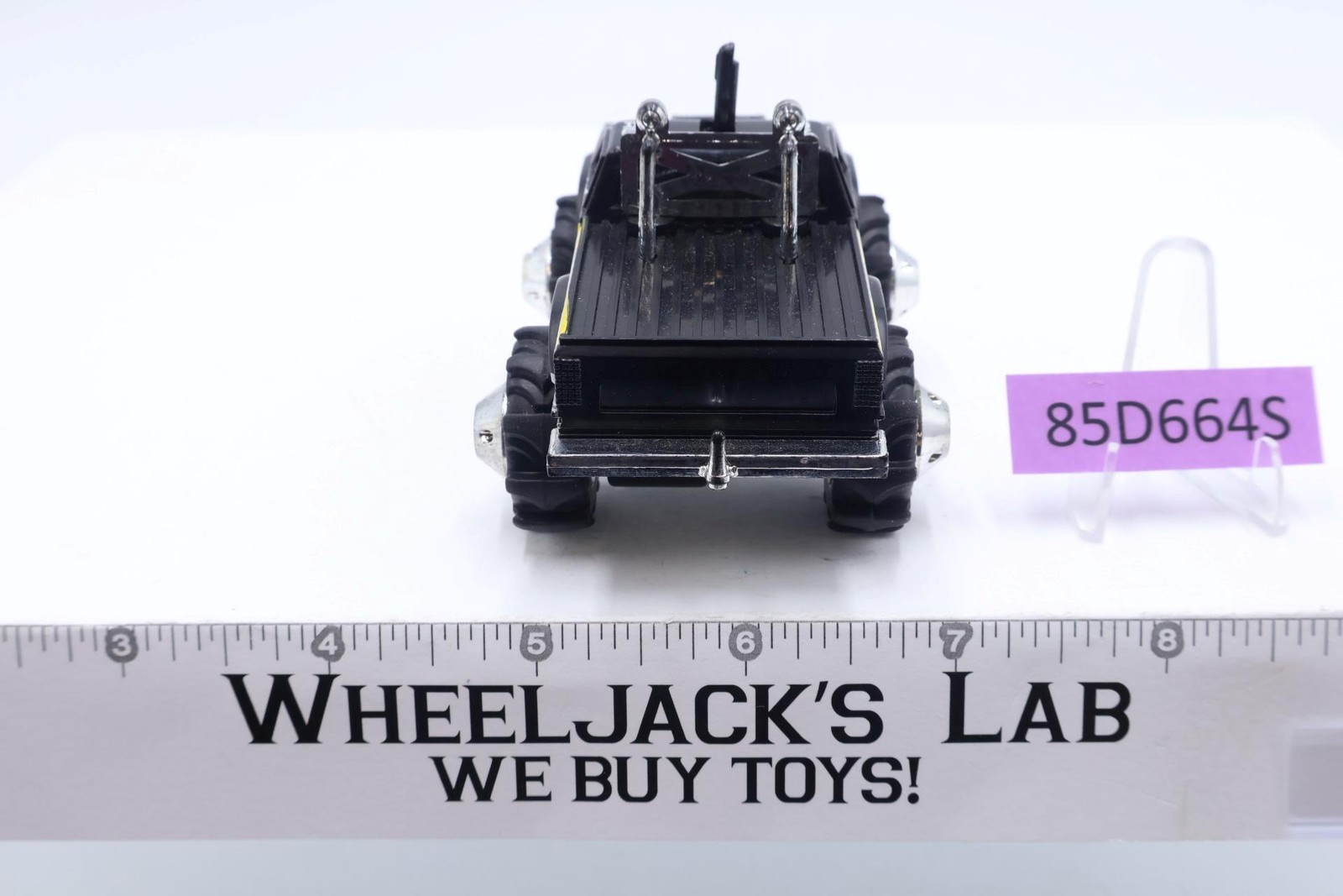 Condition: Tested with battery; both light and motor work. Paint has light wear. The chrome piece that sits on top of the on/off switch on the cab is missing. Tires and chrome have light wear. Windows have no cracks. Comes as shown.