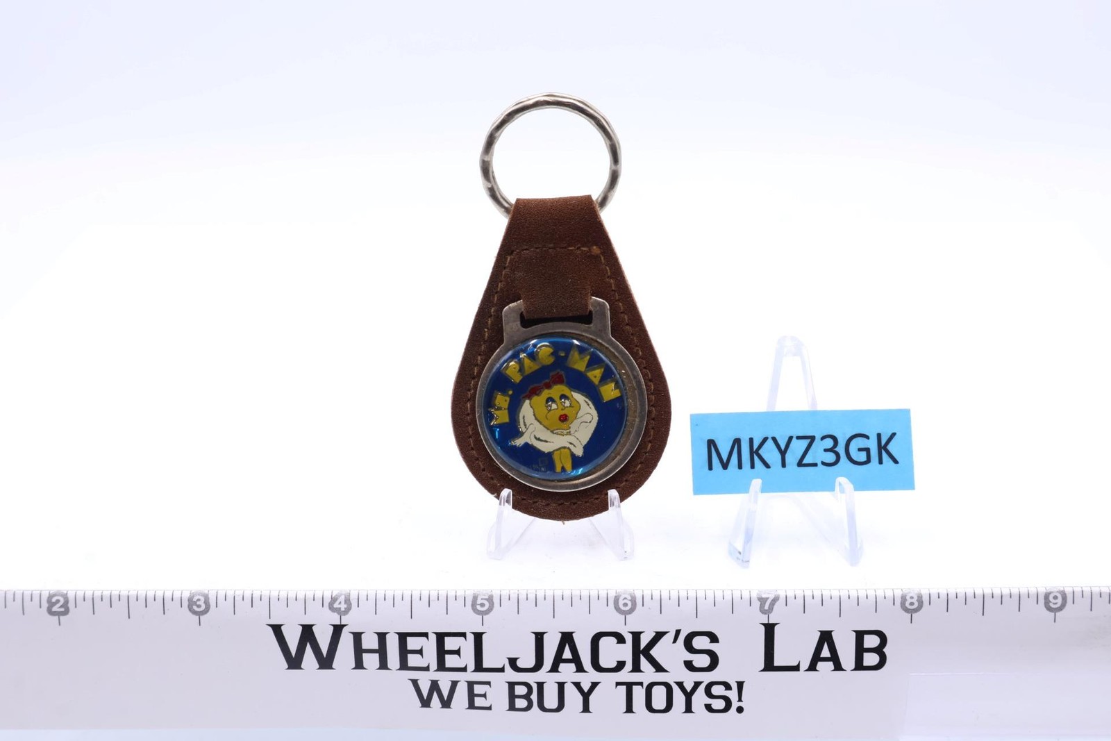 Condition: Authentic Ms. Pac-Man keychain. There is some rust on the edges of the metal and on the ring. The keychain is new, but it shows signs of wear over time. The plastic resin area has shifted off the metal section. The suede leather part is in good condition. The trademark has the logo of M over M. Comes as shown.