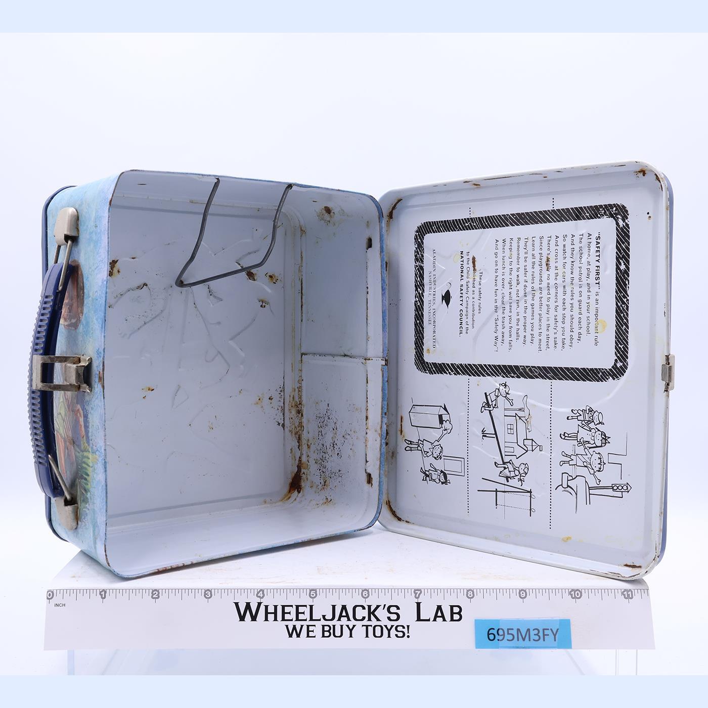 Condition: The lunchbox is made of metal. It has wear with rust both inside and outside. It needs cleaning. The latch, handle and clip are all intact. The thermos is included. Comes as shown.