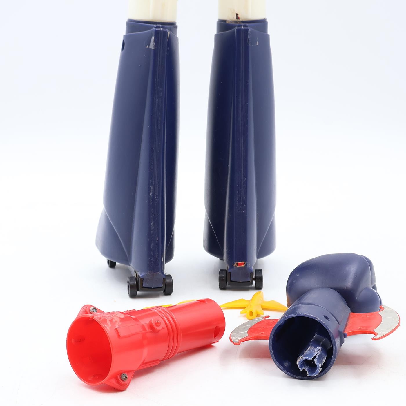 Condition: Rated 80 with some wear, it needs cleaning. The hand will not lock into place because the tab is cracked. The red launcher is also cracked. The shield is missing the blue spike. Our grading scale is 1 - 100, with mint flawless items rated 100, near mint items rated 95, excellent items rated 90, and so on. It comes as shown.
